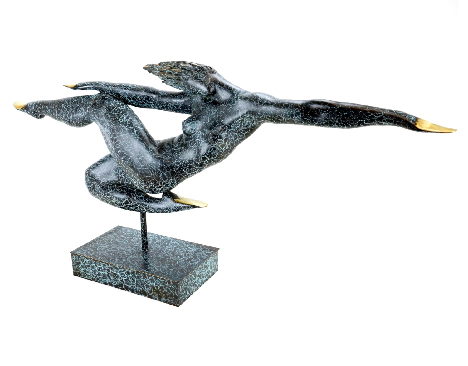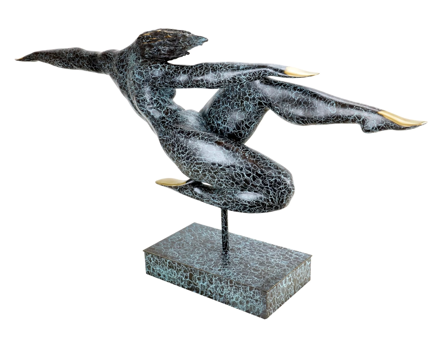 Dynamic shapes and an opulent surface structure – with this abstract bronze figurine, Martin Klein presents a fascinating piece of contemporary art. Captured during a jump and artfully abstracted, the clear line management highlights the overall effect of this modern sculpture. This dynamic female nude seems to be floating in the air. Only a delicate transition piece functions as a connection to the bronze base. An elaborately produced two-layer vortex patina accentuates the colour scheme of this bronze sculpture, which is limited to 20 pieces and serially numbered. The opulent erotic nude gets its final touch from several polishings at its hands, feet, hair and the base.