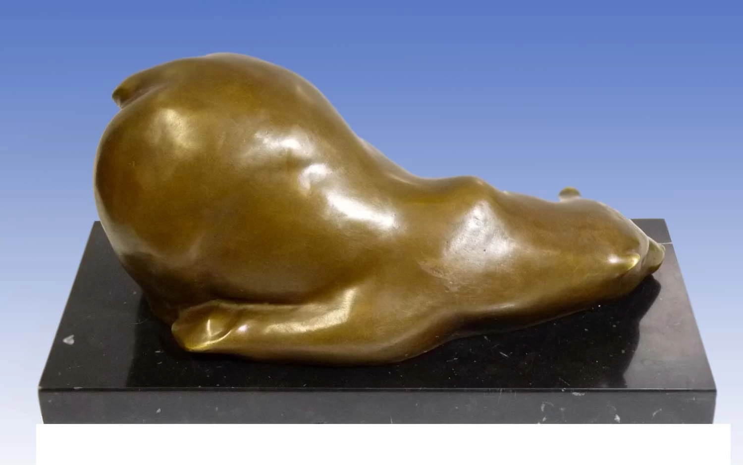 This is a very amusing and funny Animal sculpture, made by the famous Portuguese sculptor Milo. It shows a chubby polar bear lying on its paunch and sleeping. The figures charisma will put a smile on the observer’s face. The body of the wild animal is placed in a strange position, but the polar bear seems very relaxed and satisfied. The figure who takes a rest is set on a cuboid shaped marble base and will be a gain for each collection of beautiful Animal bronzes. The plain and reduced sculpture is made of 100% bronze and dark polished marble.