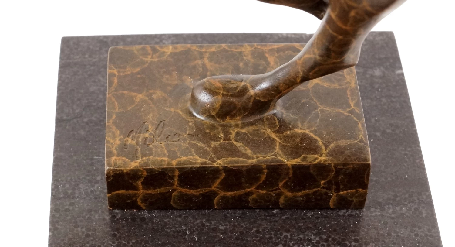 The “Cheetah” on the left is pictured full of strenth and energy and is a typical bronze figure by Milo. The rectangular marble base underlines the thickness of the sculpture. It is signed with the name of the Portuguese artist Milo and noteworthy is also the color pattern on the surface of the animal sculpture.
