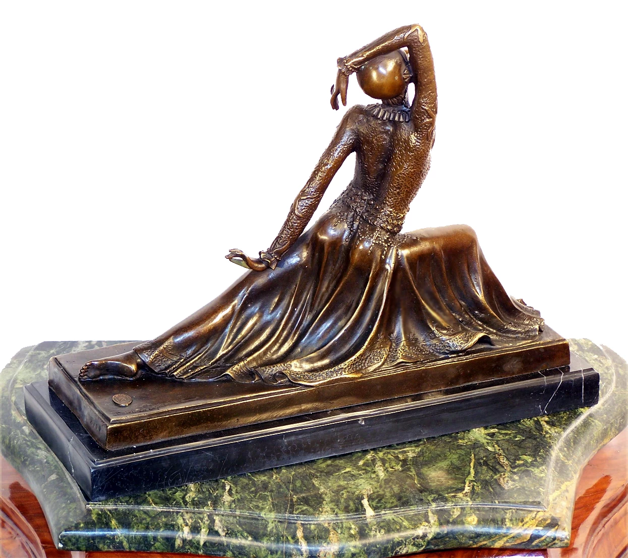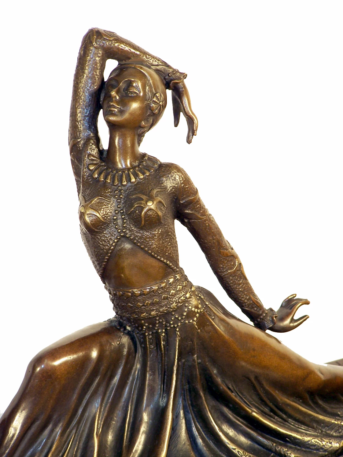 Here again, a brilliant showpiece of Art Deco Dancer on Marblebase! Created from famous artist D.H. Chiparus. Nice decoration wearing, the dancer wants to be the highlight of the event . A fantastic Bronze art object, standing on a rectangular marblebase. A valuable piece, fine decoration for every showroom! Designed in perfect details, maden of finest bronzecast in museum quality. In comparison with the original, this Object is so filigran as possible. That´s amazing! An eyecatcher on every exhibition or for collectors using. Artist signed on footprint position. Our own production control, saves the top quality of this beautyful bronze.