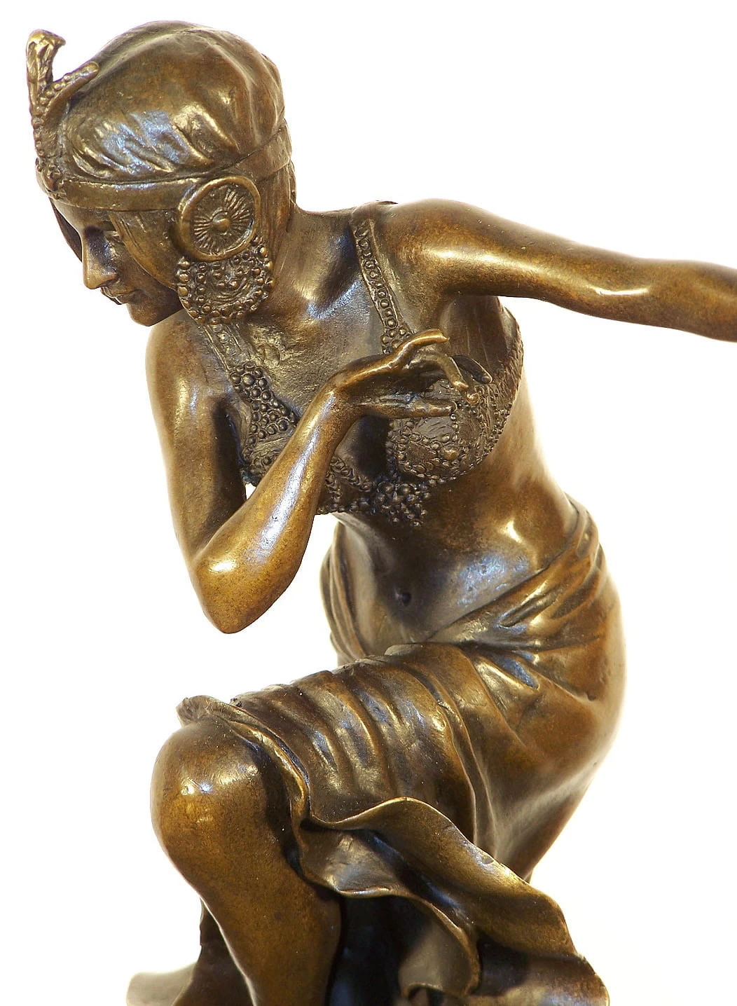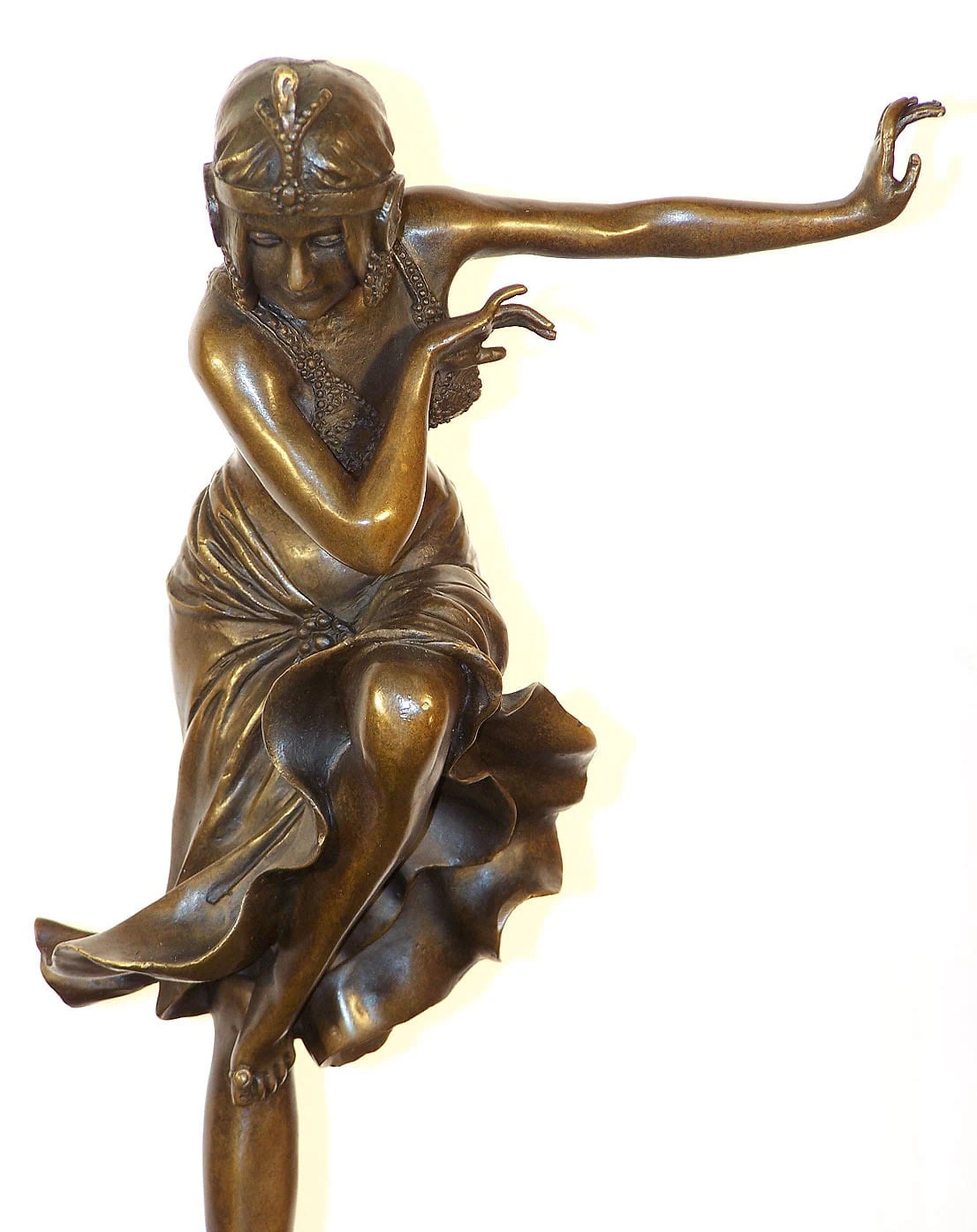 This sculpture is a very impressive Art Deco bronze dancer, which was designed by the famous artist Demetre Haralamb Chiparus, a former designer of countless wonderful figures. This sculpture is one of the best works from the period of Art Deco. The dancing woman is displayed very detailed with a lifted knee and wearing a fine decoration on her head. The sculptor D. H. Chiparus signed the great figure, which is connected to a round marble base. The marble base completes the great design of the sculpture perfectly. The bronze cast was made of finest material and in comparison with the original; this object is as filigree as possible. This truly detailed museum bronze cast is a focal point in every exhibition! It is an absolute eye-catcher for lovers of bronze sculptures, Art Deco collectors or admirers of the artwork of Demetre H. Chiparus.