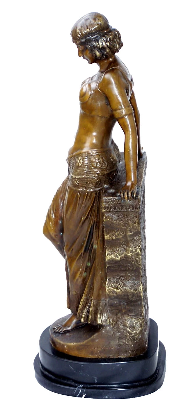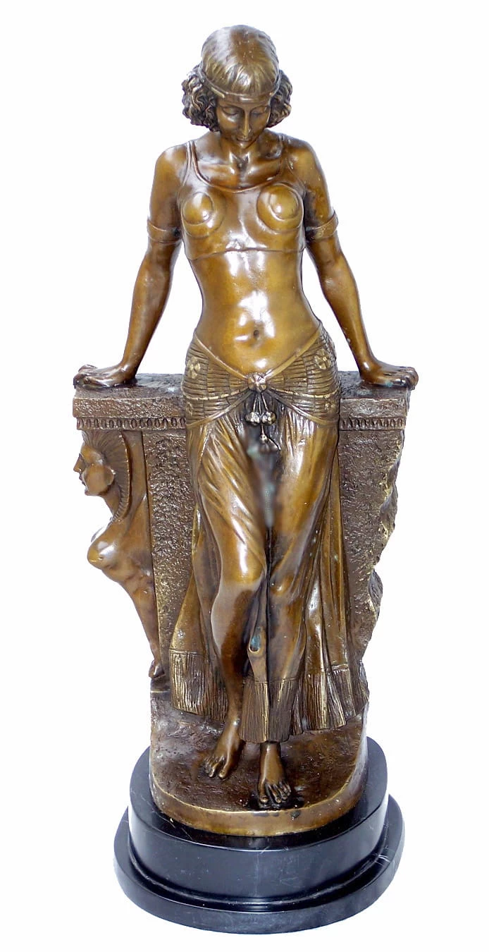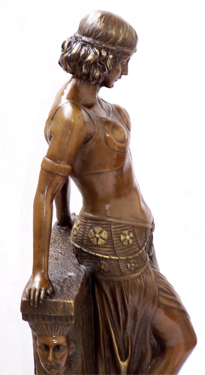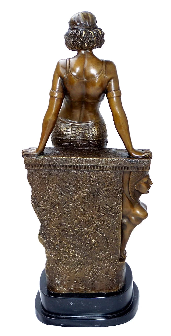 This is a wonderful and impressively big, Art Deco Bronze sculpture of an Egyptian Dancer on a marble base. Regarded as one of the best creations from the artist Milo, the figure shows a relaxed, young dancer sitting against a wall. In a casual upright pose, the lady rests her hands on top of the wall, she is well dressed with elegant clothes and a slim headband that outlines her sweet body. The sculpture, made of finest bronze material,is casted in our foundryin an amazing agreement to the original. Artist signed at the side of bronze socket. The Egyptian girl is standing on an oval marble-base. This truly detailed museum bronze cast is a real eye-catcher in every exhibition, lovers of bronze sculptures, Art Deco collectors and admirers of the artwork from Milo.