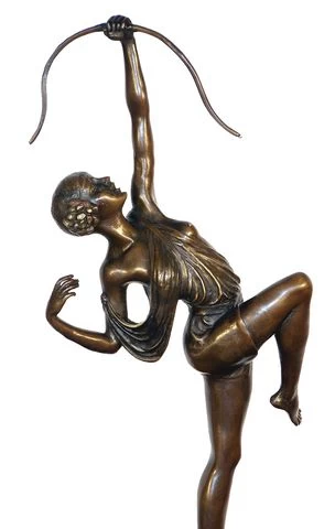 What a sensational bronze figure! This beautiful Art Deco Nude Bronze sculpture displays a young woman with a bow, created and designed by Pierre le Faguays. The sculpture is named “Diana” after the goddess of hunting. The goddess Diana is dressed in a thin toga along with a bow in her left hand pointing skywards, mimicking a shot of an arrow. The sculpture was created by Faguays and made of finest bronze material. This Art Deco piece was casted in our foundry in an amazing agreement to the original.