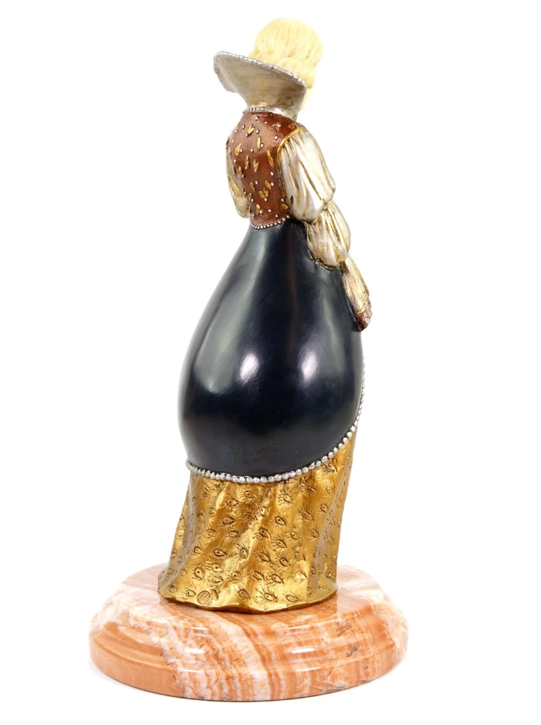 Chryselephantine statues have a long tradition. In ancient times, sculptures of this type were particularly sought-after. In the classical sense, the term chryselephantine means the sculptural combination of the precious metal gold and ivory. In contemporary art, this composition does vary. In French Art Deco, for example, the gold was replaced by bronze. Nowadays, the ivory is foregone due to reasons concerning animal welfare. Instead, artists use resin as an alternative material.