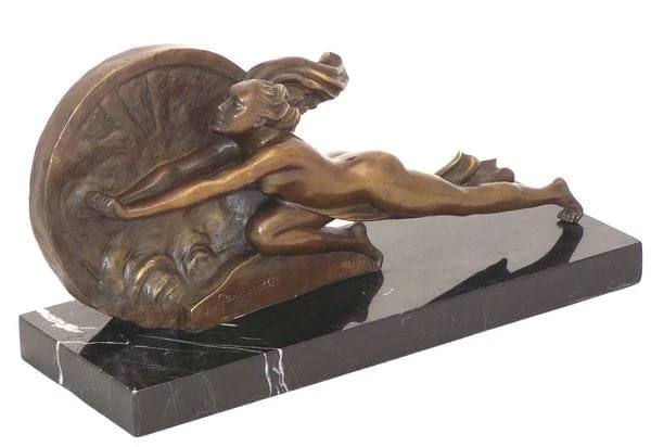 “Towards Destiny” is a graceful and delicate Art Deco Bronze sculpture, placed on a marble base and signed by A. Gennarelli. The Artist wants to show that the wheel of destiny is in constant movement with nothing and nobody being able to stop it. The final result is a high impression bronze sculpture and a real eye-catcher for everyone fond of bronze sculptures. The Figure contains of bronze cast with the finest quality and is fixed on a rectangular marble base, signed by A. Gennarelli. In comparison with the original, this object is as filigree as possible, it is handmade and is used to display in an exhibition or for collectors using.