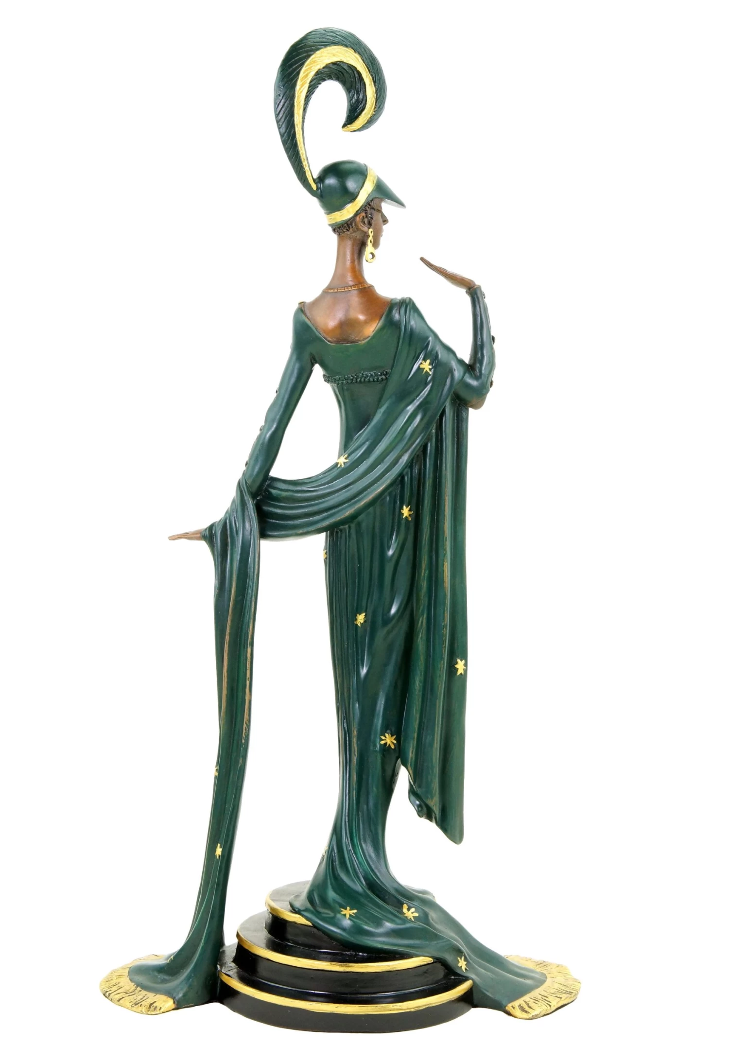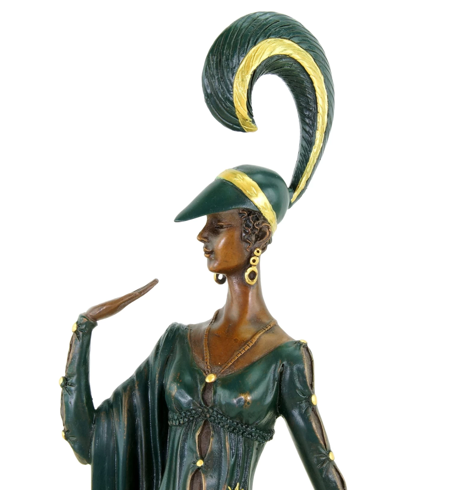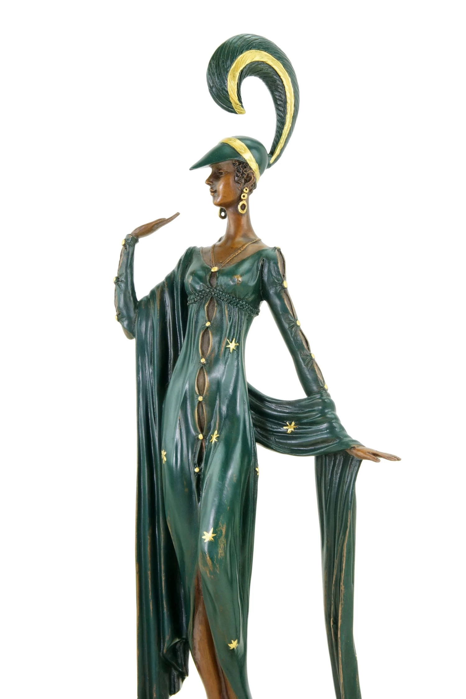 This opulent bronze Art Deco statue shows the slender body of a twenty-year-old revue dancer. The figurine is made from 100% bronze and is characterised by an elaborately detailed design. This can be seen by the incredibly realistic manner in which the materials are used. This becomes apparent in the area of the flowing fabrics which reach across the dance platform – which is also used as a bronze base – and thus are connected to the surroundings of the statue. The sculpture has a two-toned patina, which creates a harmonious interaction between green and copper hues. The final refinement of this Art Deco revue dancer was done via a partial painting by hand in order to highlight small details in the areas of the hat, robe and base. Additionally, the statue bears the signature of the artist.