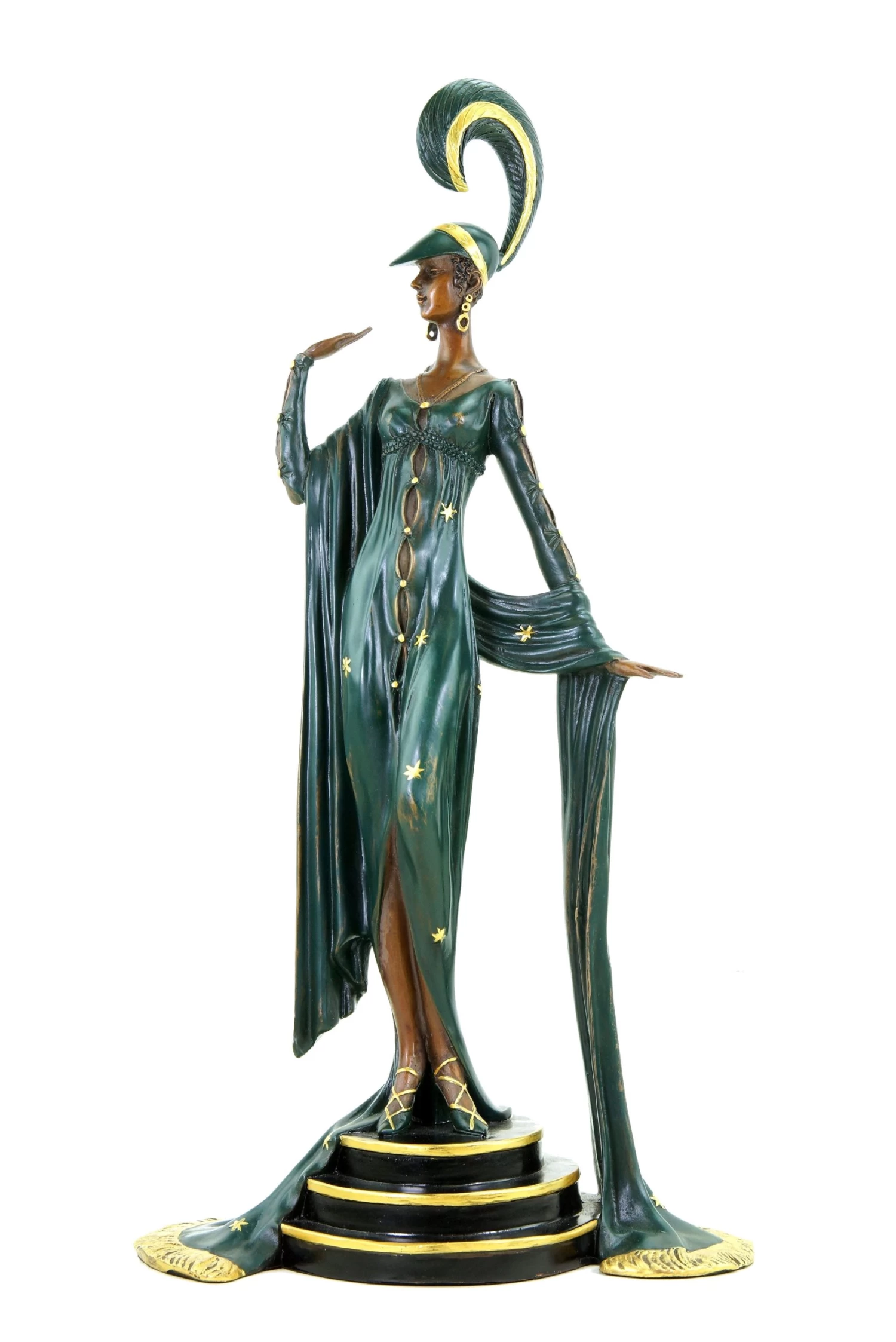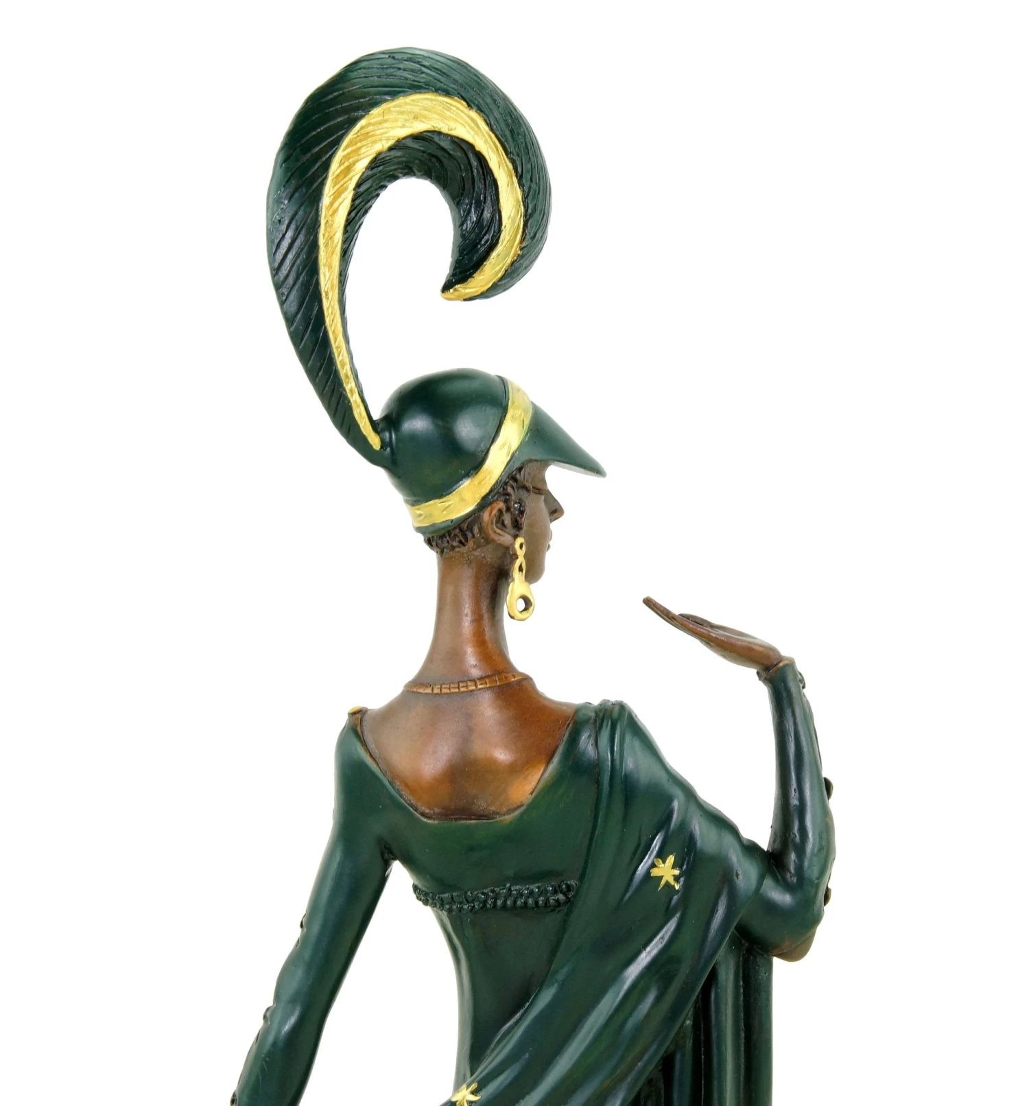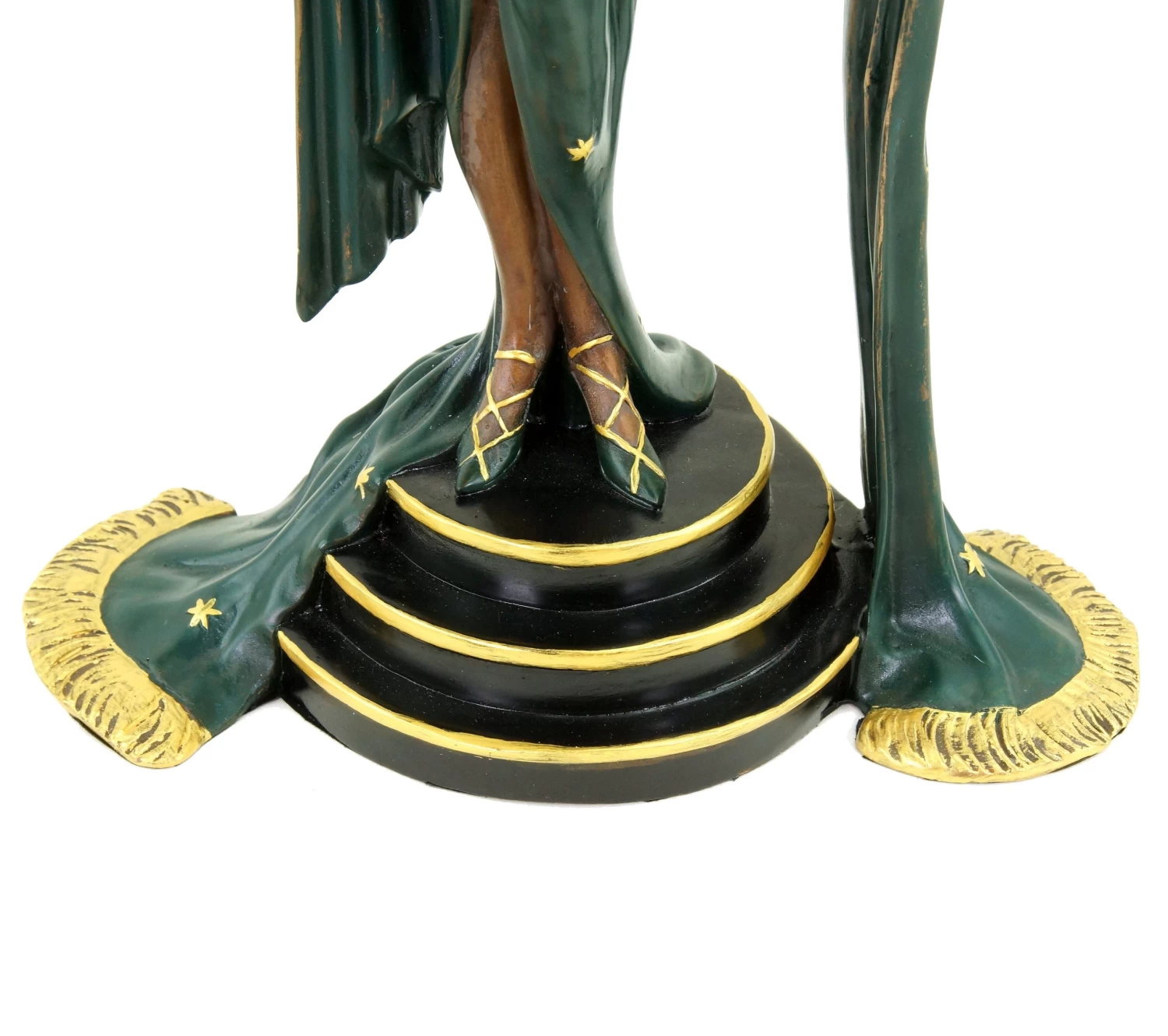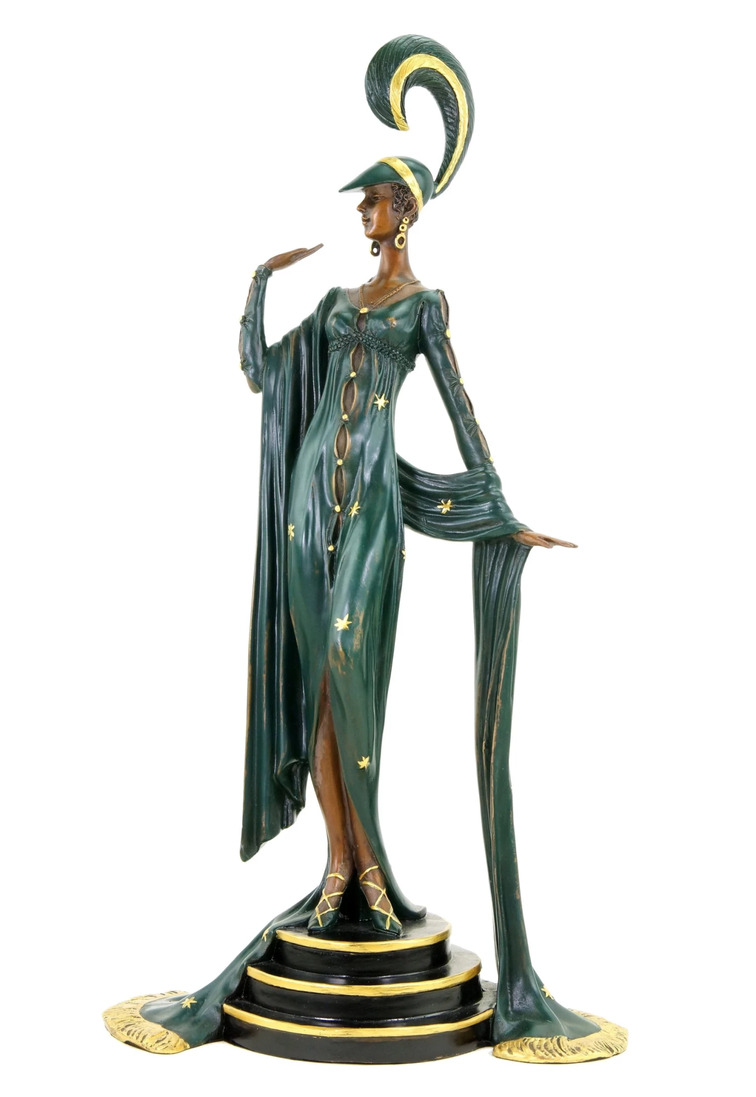 This opulent bronze Art Deco statue shows the slender body of a twenty-year-old revue dancer. The figurine is made from 100% bronze and is characterised by an elaborately detailed design. This can be seen by the incredibly realistic manner in which the materials are used. This becomes apparent in the area of the flowing fabrics which reach across the dance platform – which is also used as a bronze base – and thus are connected to the surroundings of the statue. The sculpture has a two-toned patina, which creates a harmonious interaction between green and copper hues. The final refinement of this Art Deco revue dancer was done via a partial painting by hand in order to highlight small details in the areas of the hat, robe and base. Additionally, the statue bears the signature of the artist.