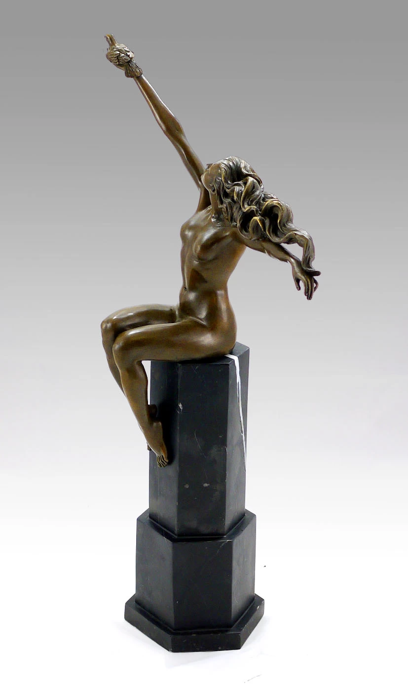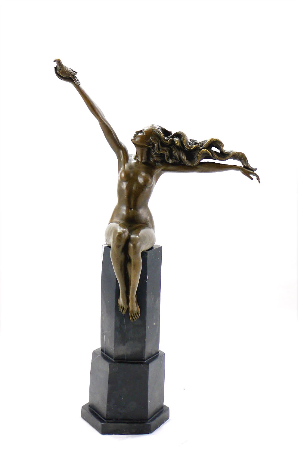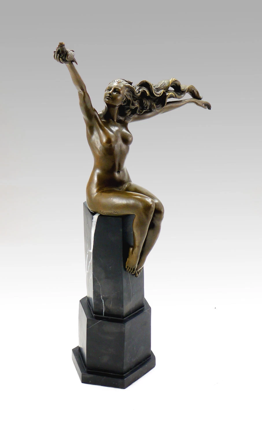 This beautiful bronze Art Deco sculpture “The Carrier Pigeon” was created by Amadeo Gennarelli around 1920. It shows a young nude athletic woman, sitting on a tall and special shaped marble plinth. She has raised her arms and looks to the side, on her hand sits a carrier pigeon. It seems like she is trying to send the pigeon to her lover with a message, or maybe she got one from him. She reveals the uncovered feminine beauty of her body while her legs are graceful closed and her arms make a filigree and lovely gesture. Her tempting and joyful appearance is stressed by her sensual flowing curly long hair. The Art Deco figurine of this wonderful and amazing young woman consists of 100% bronze and dark marble and is signed by its artist Gennarelli.