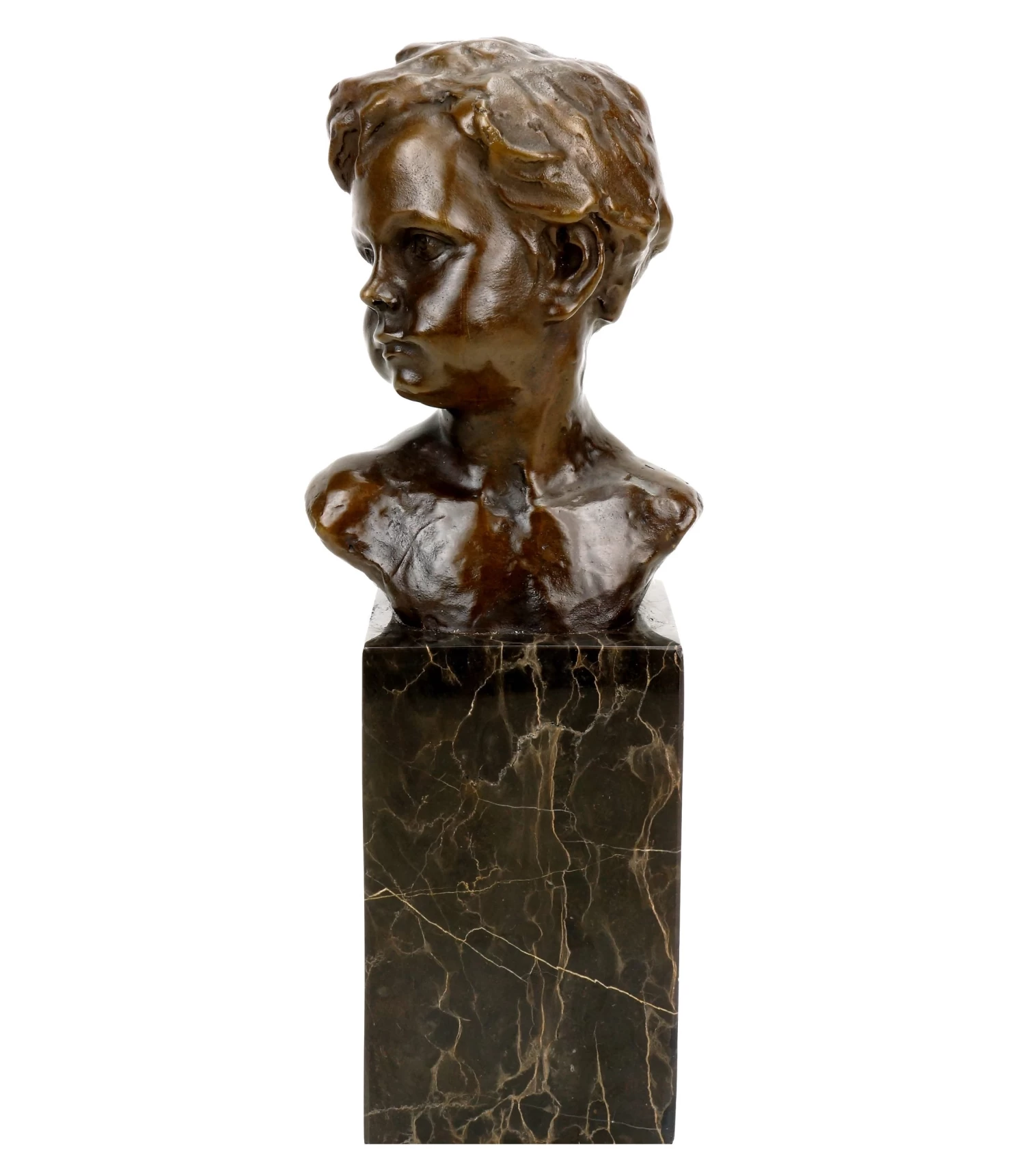 With this decorative bust of a boy, Auguste Moreau presents an individual Art Nouveau sculpture that combines both authenticity and playfulness. Thus, the handsome bronze boy sits enthroned on a colourful marble base which skilfully highlights the signed Art Nouveau bust. As is the norm for Art Nouveau, it is a rather small sculpture that stands out due to its delicate surface structure. The harmonious design of this bust of a boy complies with the motif of idealisation which was also typical for the depiction of women during the Art Nouveau period. Lost in thought, the young boy looks into the distance, and the artist Moreau deliberately draws the focus of the observer to the bronze boy’s delicately designed facial features.