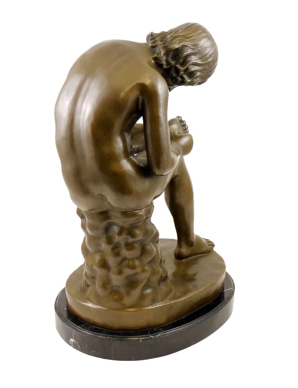 The figure „Boy with Thorn“ is a very popular motif in the area of sculpting. A naked boy is sitting on a rock and is pulling a thorn out of his left foot. He is bending his left leg and is putting it on the right thigh of the right leg. The boy is pulling the thorn out of his foot with a tended head. The figure is well-sculpted and rich in detail, the boys hair is well combed and the slim body of the boy is gracefully displayed. The sculpture has the signature of the artist Milo and the object is made of 100% bronze.