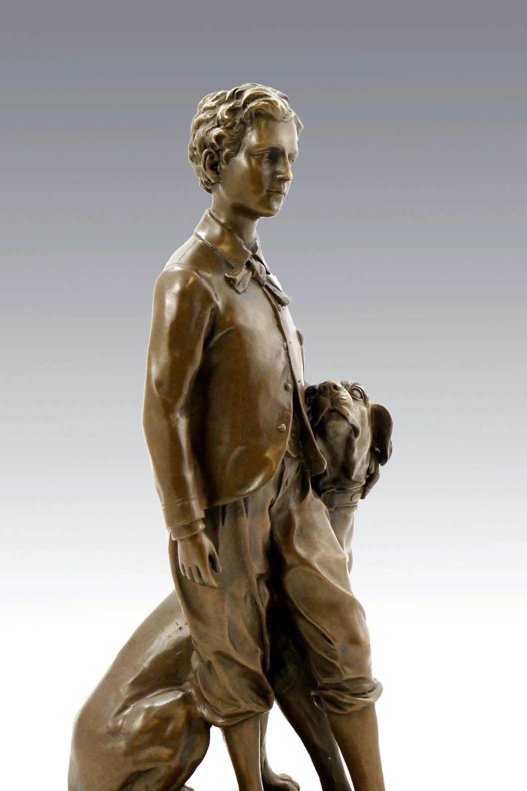The French artist and sculptor Jean Baptiste Carpeaux made this charming Art Nouveau bronze “The Prince Impérial with His Dog Néro” in 1865 as a part of a sculpture group of marble. Later the figure of the boy with his dog was reduced and exhibited separately. Carpeaux was born on May 14, 1827 in Valenciennes in France. After he earned his keep by the making of models for the artistic industry, he studied at the famous art academy École nationale supérieure des beaux-arts de Paris. Inter alia he was a student of the sculptors Francisque Joseph Duret and François Rude and received the Prix de Rome at an exhibition of the Académie Française in 1854, which brought him first reputation. With the help of a travel scholarship he travelled through Italy and visited Rome, where he studied the works of the antique masters. However he was also interested in Modern Arts and developed his own style, which was finally established with the bust “La Palombella”. After an exhibition in Valenciennes he went back to Rome, where he made, inspired by Dante Alighieri, the sculpture “Ugolino and his Sons”, one of his most famous works. In 1862 Carpeaux came again back to France and founded an atelier in Paris. The figure “La Danse” at the front of the Paris Opera is recognized as his major work. It is a sculpture, sparkling with excitement, love of life and temperament. Jean Baptiste Carpeaux died on October 12, 1875 at the age of 48 in Courbevoie near Paris.