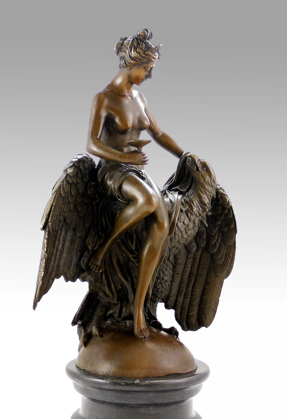 This wonderful Art Nouveau figurine, that had been designed by the artist L. C. Buhot, was sculpted by the Portuguese artist Milo. It shows a young attractive woman sitting on the shoulders of an eagle, an animal that embodies strength and power. The nearly-naked female holds a goblet in her hands and is trying to give it to the predatory bird. He looks to her and seems bound by her nude body and the filigree of her beauty. The beautiful woman sits almost bare and only wears a scarf on her lap and a tiara on her head that emphasizes her beautiful hairstyle. The whole Art Nouveau sculpture is set on a special round shaped marble plinth and contains the signature of Milo at the bottom. It is made of 100% bronze and marble.