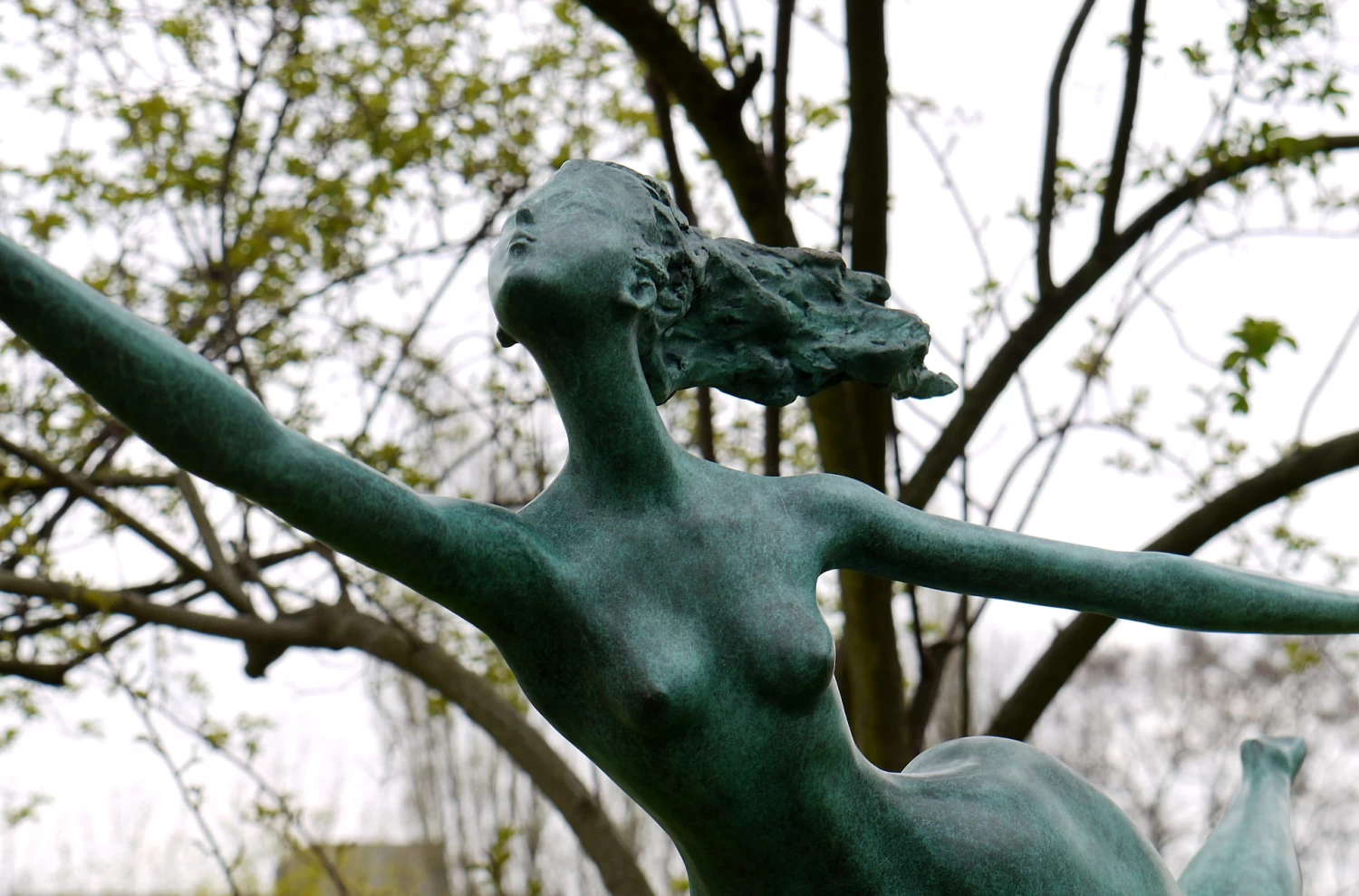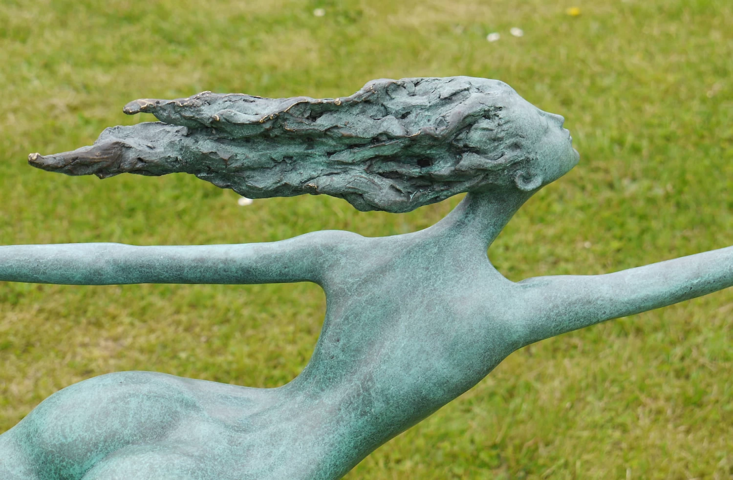 The “Walking Female Nude” is a graceful appreciation of the female body by the visual artist Milo. The delicate arms, the slim neck and narrow hips generate a high degree of elegance. Full of determination the woman proceeds apace. The large, outgoing gesture implements the futuristic motif of speed. The external movement refers to the human-basic existential condition of the inner movement and forward thrust. The expressive sculpture is suitable for outdoor use. With the green patina the sculpture seems to be artificially aged and generates a moment of eternity.