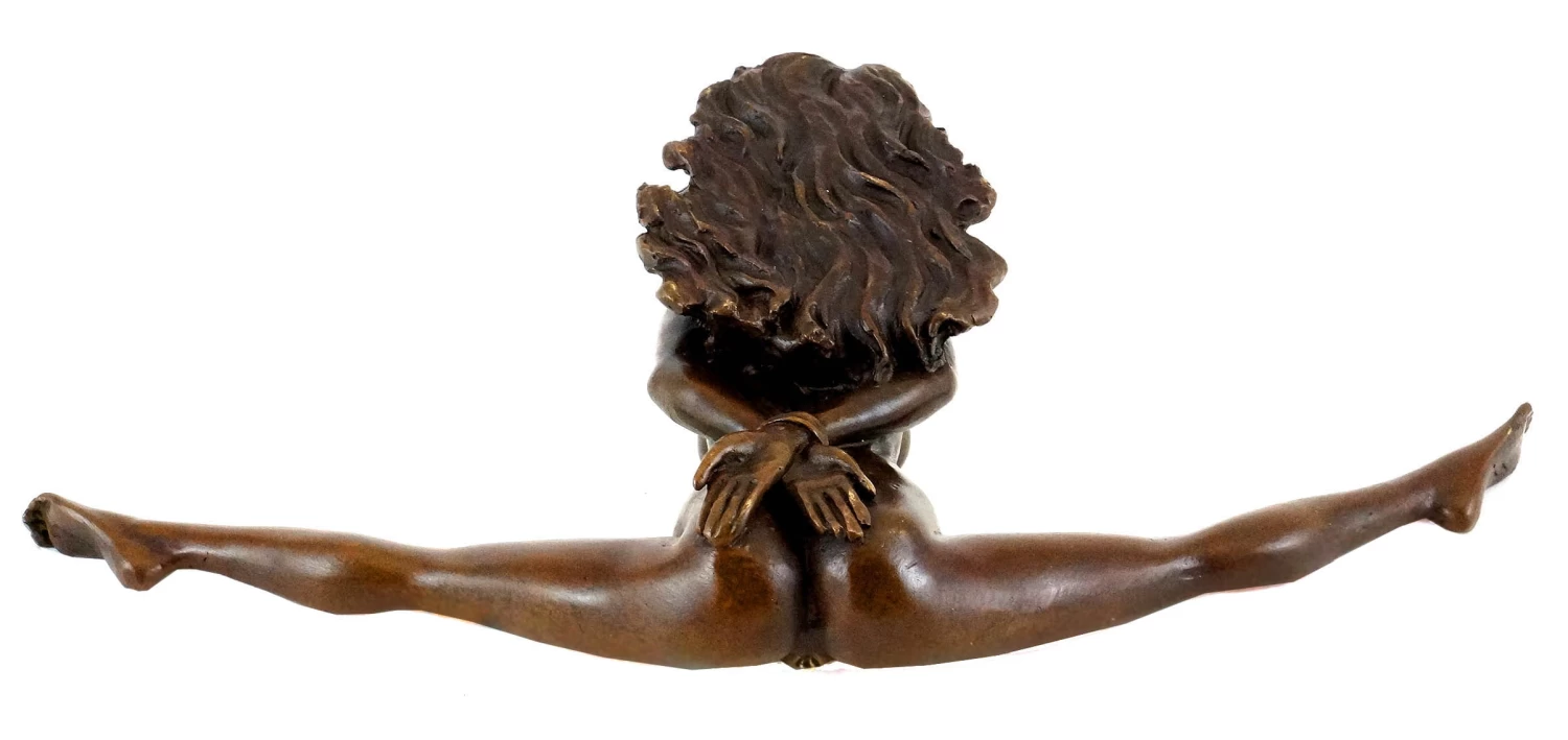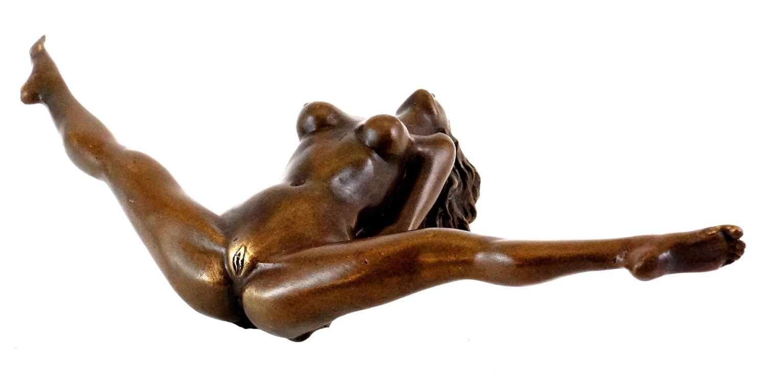 This figure is a high-quality art object which deals with the subject of sadomasochistic bondage practices. “Bondage Girl Chantal” is a special item of sadomasochistic art and the motif of erotic bondage only becomes apparent at second glance. With legs spread wide, which offer a bare look at the vagina of bondage girl Chantal, the naked girl lies on her bound arms. Sculptures and paintings of tying people are known from numerous eras and anyone who has an obsession for practices of bondage in the sexual context will enjoy this high-quality bronze sculpture.