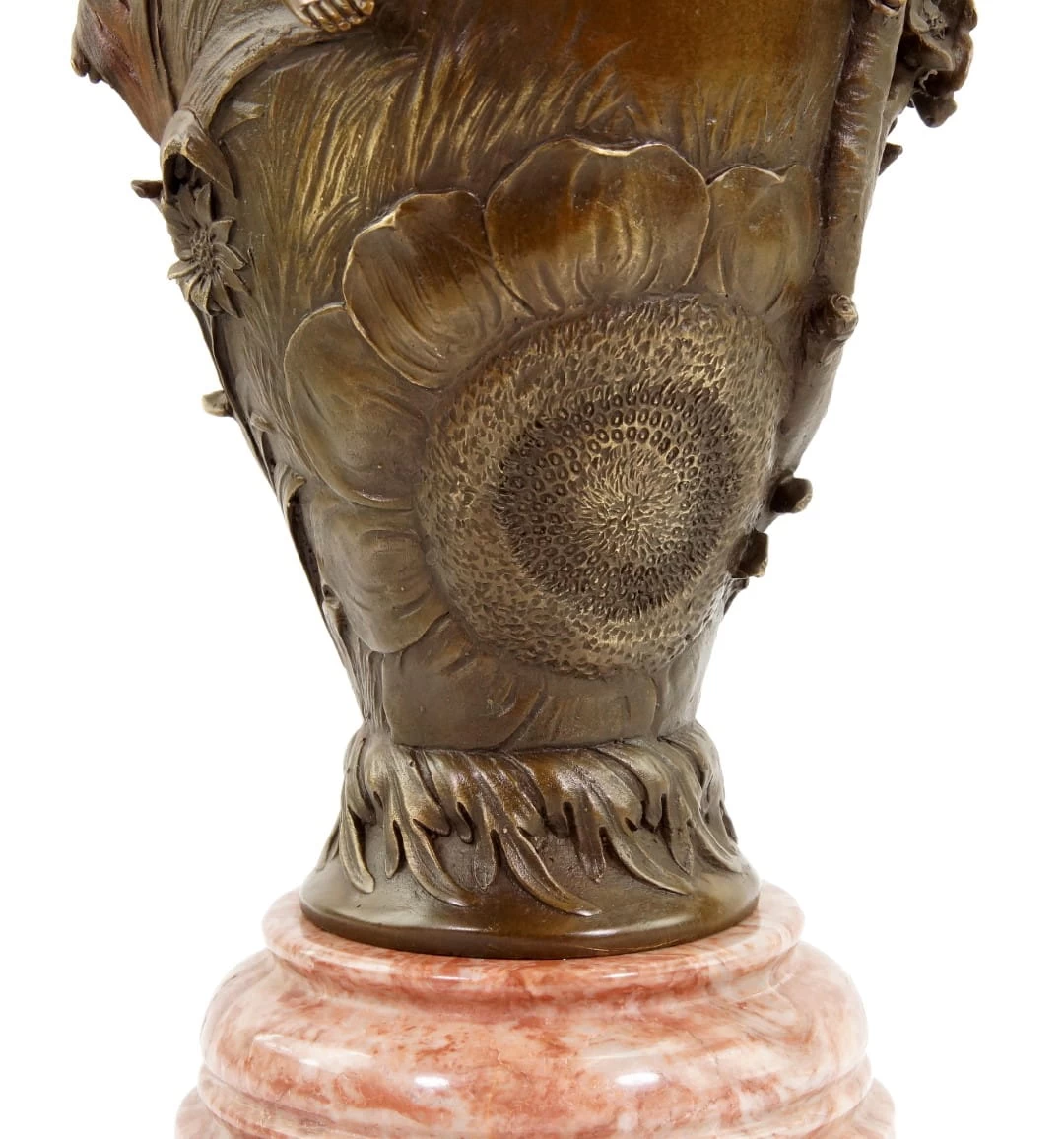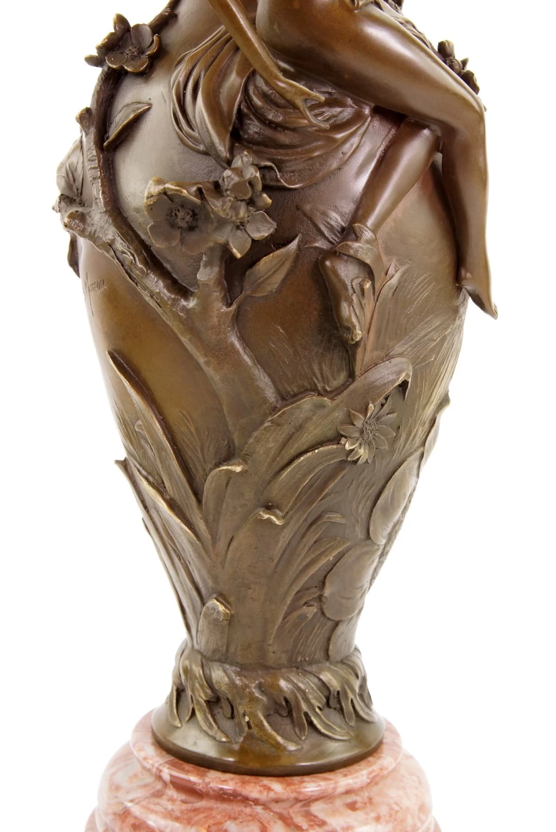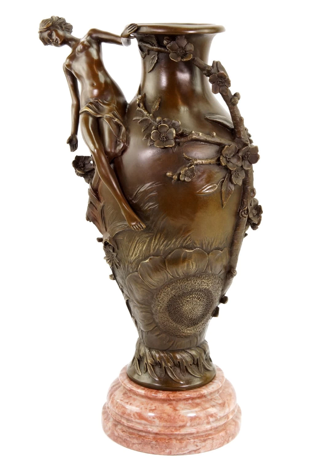 Placed on a unique, red marble base, this opulent vase is a masterfully implemented bronze object that was designed by the sculptor Auguste Moreau. The decorative vase is adorned with numerous Art Nouveau elements. As a result, floral components meet with the soft eroticism of a classic, delicate female nude that is artfully placed at the neck of this beautiful vase. In this way, the decorative vase becomes an active part of the motif. Apart from the luxurious marble base, the Art Nouveau image is made of 100% finest bronze material. The elaborate composition bears the exclusive signature of the artist. The vase is a commodity as well as an art object, which makes it an extraordinary piece of decoration.