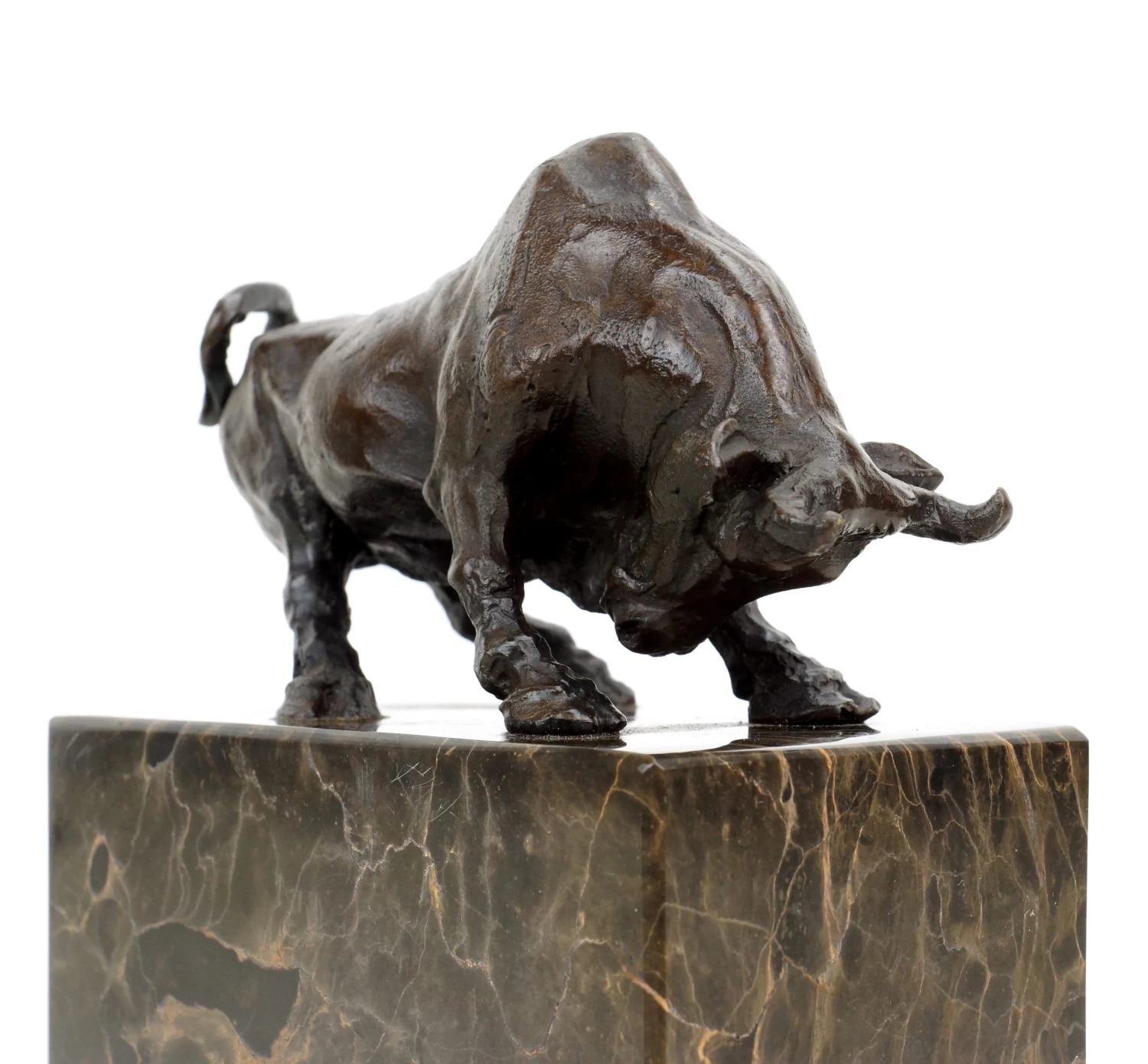Due to his extensive focus on the anatomy of animals, Antoine-Louis Barye became one of the most important animal sculptors of the 18th century. His studies of the movement patterns and facial expressions of animals in Paris’ Jardin de Plantes are reflected in the masterly realised bronze figurines and sculptures of the artist. In the case of this small sculpture, the focus is on the dynamism of the depicted moment: a massive, muscular bull that is getting ready to attack, his head menacingly lowered to the ground. This decorative bull figurine does not only stand for the imposing style of the artist, but also for values like dominance, strength and masculinity, which are definitely embodied by this bronze bull. A coloured marble base rounds off the final refinement of this bronze.