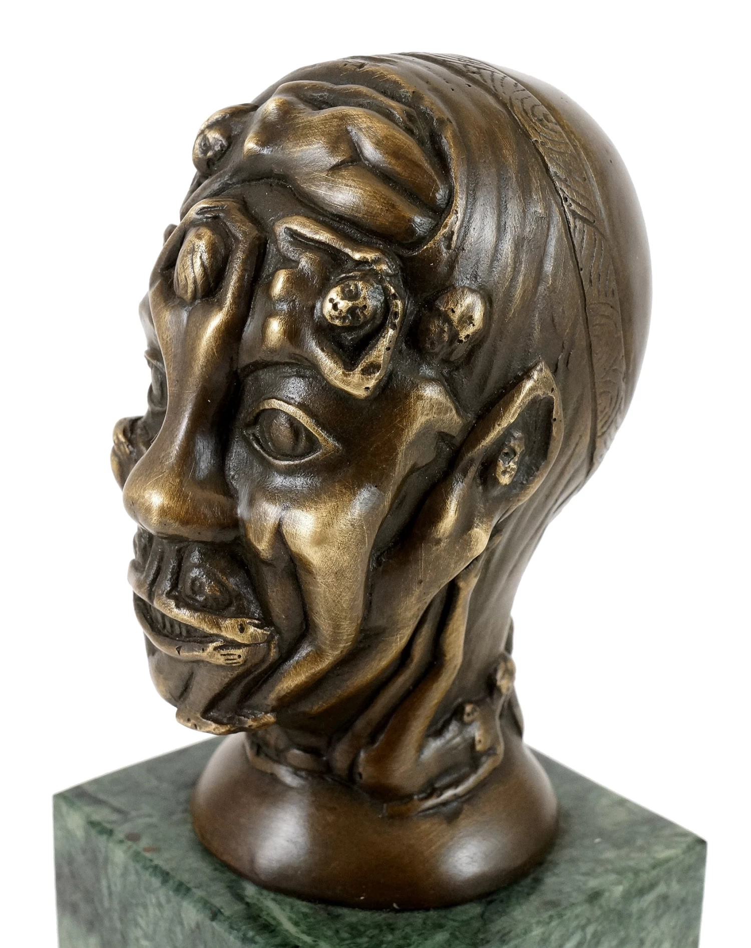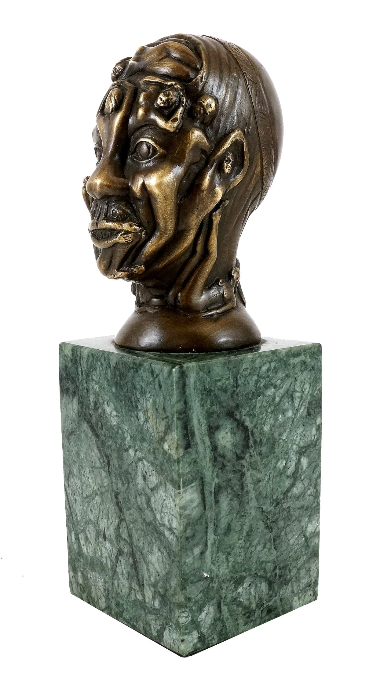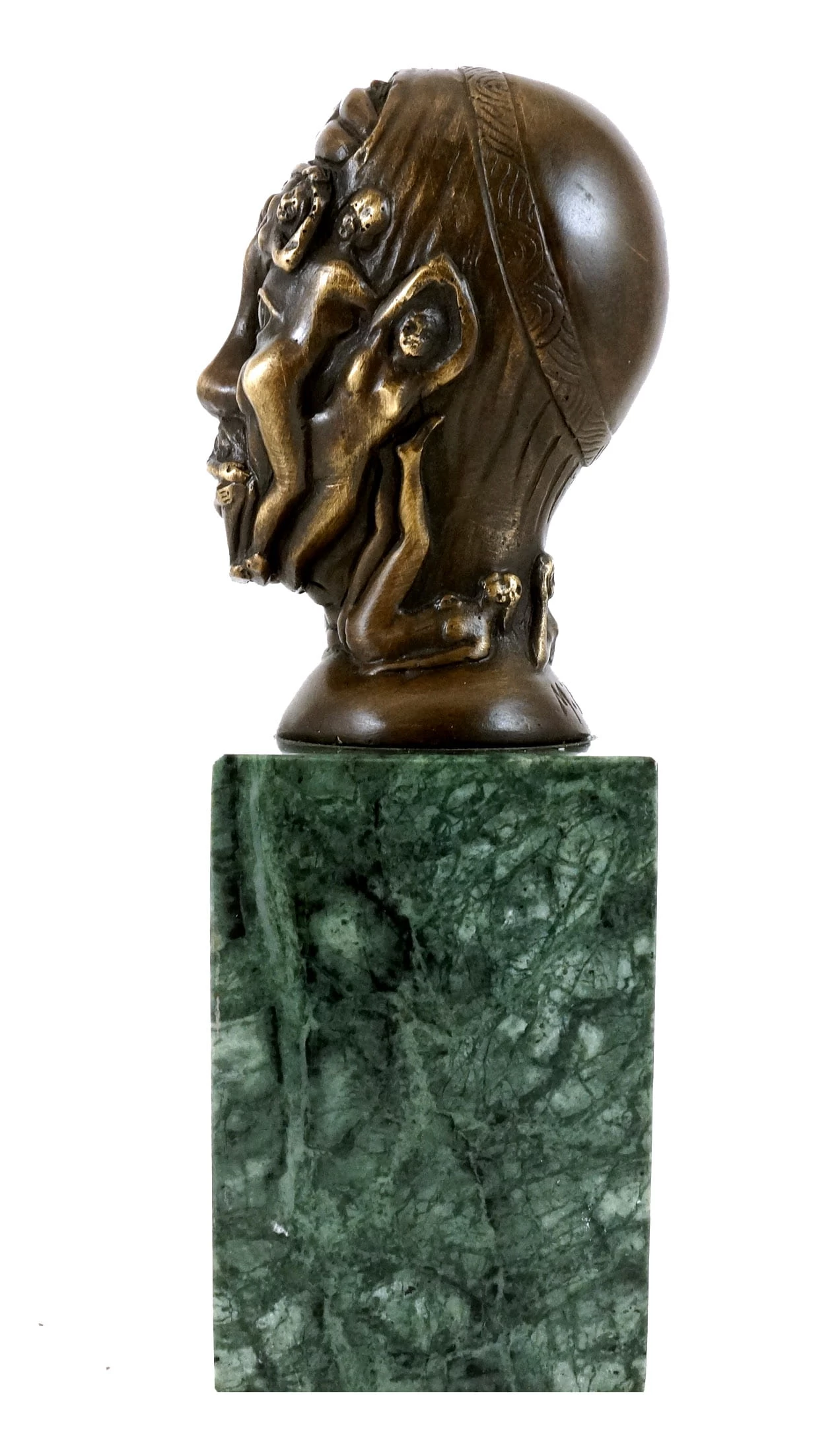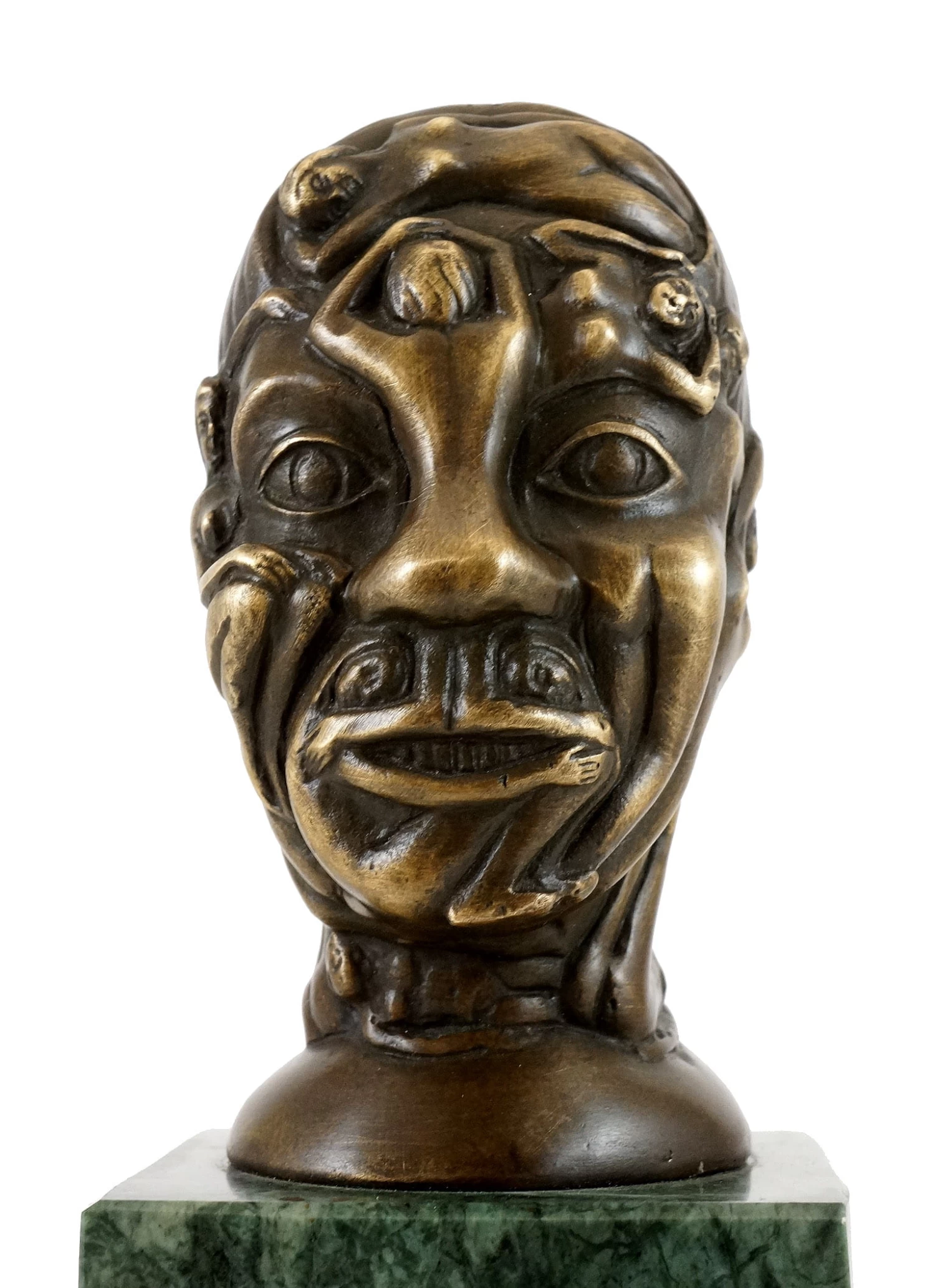 At first glance the adjoining bronze figure appears to be an ordinary head. Only at second glance you realize that its physiognomy takes shape by artfully positioned naked female bodies. A female back forms the nose of this bronze head; arms form the mouth; forehead, temples and neck also take shape by relief-like female bodies. The head was designed by the Saxon artist Martin Klein. The sculpture is mounted on a green marble base and bears the signature of the artist.