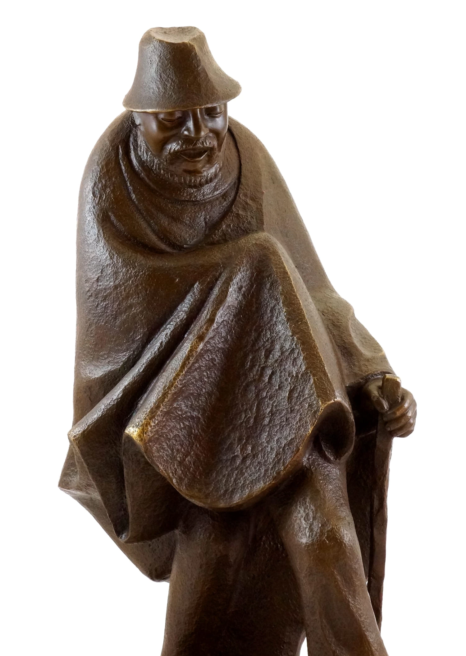 The sculpture on the left is dominated by the drapery of the shell in which the old man is enveloped. The artful draping draws attention to itself. With the right hand, which can be imagined under the coat, the old man pulls his jacket seeming like a shield. With his left hand he leans on a stick. While he gains ground with his left leg, he advances slowly with the right leg which seems to be handicapped. The “Hilarious Monopod” (Vergnügtes Einbein) was carved in 1934 by Ernst Barlach. It based on a lithograph created in 1922. The sculpture bears the signature “E. Barlach”.
