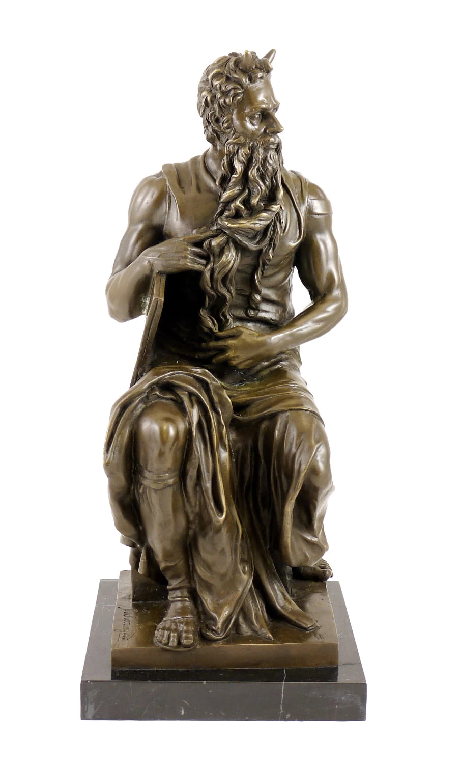 The bronze sculpture „The Moses of Michelangelo“ shows the Promethean Moses, who is abuzz with divine anger. The original sculpture was created between 1513 and 1516. This object stands in the church San Pietro in Vincoli, Rome. This sculptural work is the most important sculpture of Michelangelo. Moses is a significant figure in some religions. He is revered in different Christian confessions. Moses has two horns in some Christian art works as in this sculpture. The reason was a wrong translation for the word “bright”. The bronze sculpture has a signature of Michelangelo.