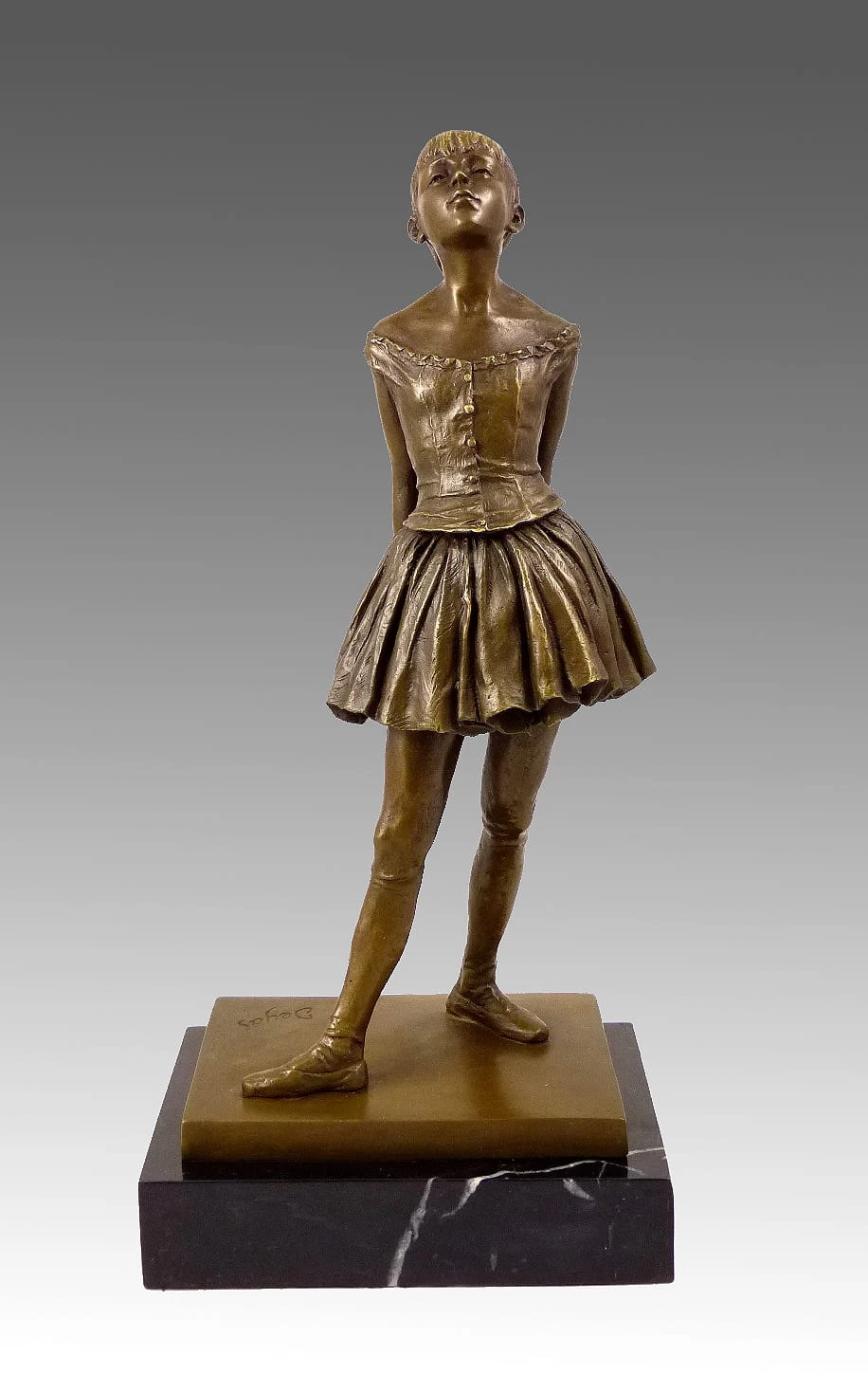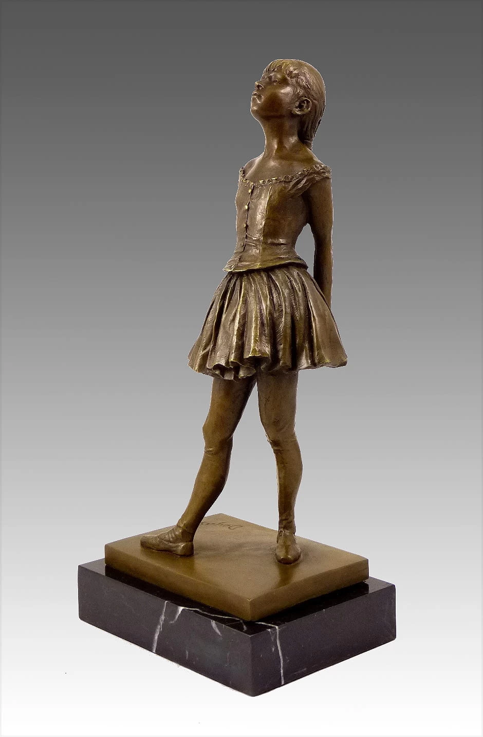 This is a wonderful Modern Art bronze sculpture by Edgar Degas. The name of this figure is “Little dancer of Fourteen Years” and it is world-famous. It reflects a young female ballet dancer, who stands in an upright position, while she gives an impression of youth and gracefulness. Especially the folds on her skirt and the satisfied expression of her face are worked into great detail. The beautiful bronze is set on a dark marble base, which is rectangular shaped and to add perfection to the sculpture itself, the lovely Modern Art sculpture consists of 100% finest bronze. The marble is polished and bears the signature of its creator, Degas, at the bottom of the bronze base.