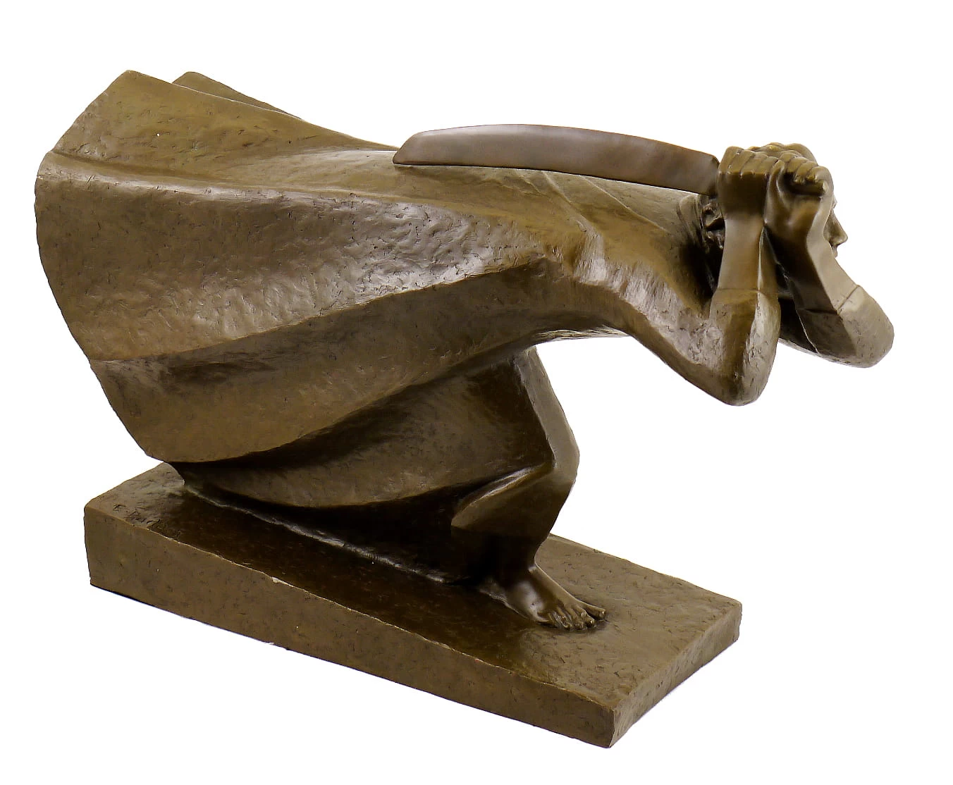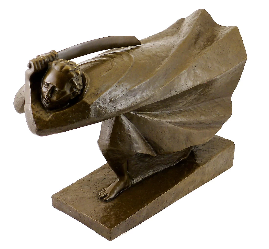 Ernst Barlach’s „The Avenger“ was made after the outbreak of the First World War in 1914. The sculpture represents the inexorable force of the German army. The dynamic sculpture in the form of a Berserker is a symbol of the war and the dissatisfaction with the political, economical and social conditions at that time. The powerful scene of a warrior striding forward and holding an enormous sword over his back accentuates the expressive language and the aggressivity of Barlach’s work. The dynamism of the man’s forward movement and the timeless gown were inspired by Futurism and Cubism. The sculpture turned to a symbol of outbreak of the war even before it was exhibited.