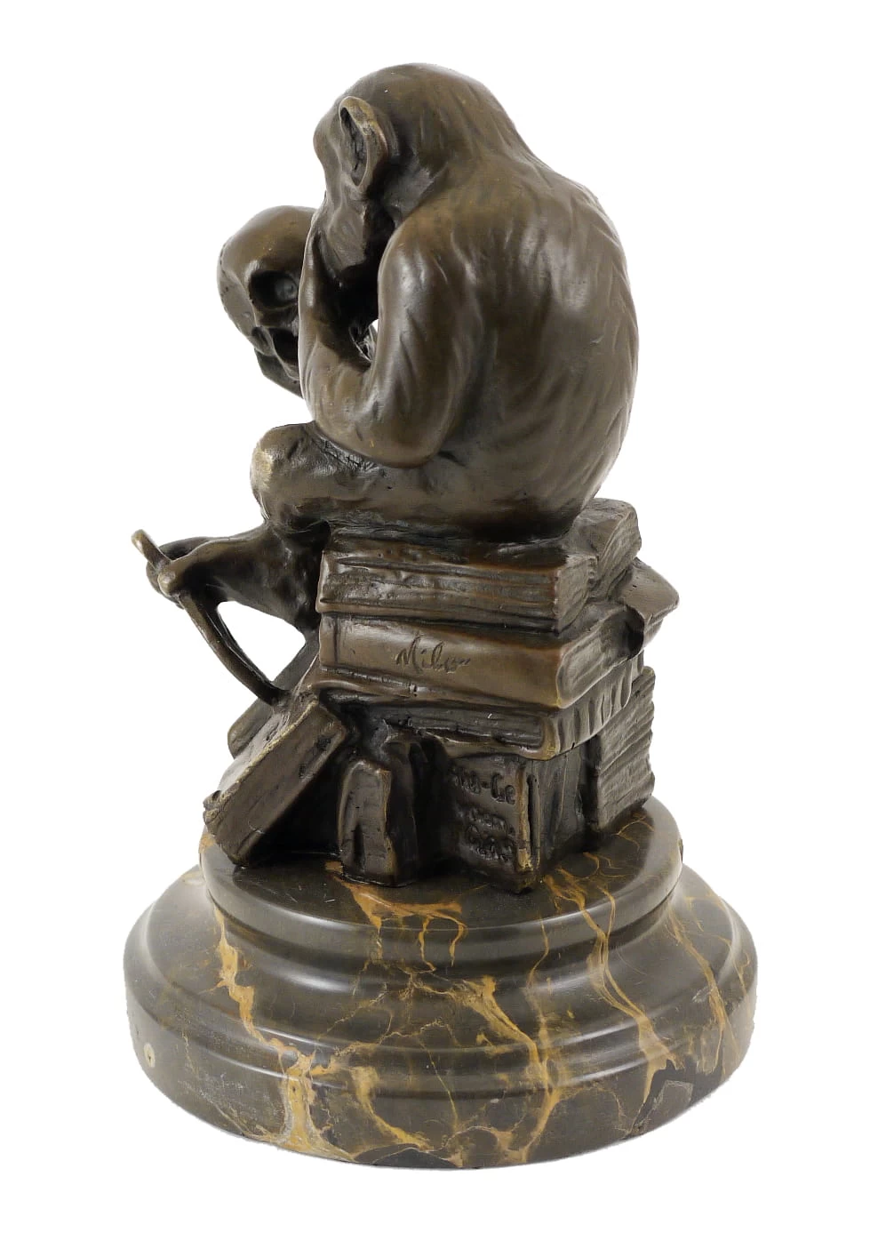 This sculpture is a homage to the “Ape with Skull” also known as “Philosophizing Monkey” by Wolfgang Hugo Rheinhold. The philosopher and sculptor Wolfgang Hugo Rheinhold has transformed the heated debate about the work of the British naturalist Charles Darwin in a three-dimensional art piece. The sculpture depicts a chimpanzee sitting on a pile of books and looking at a human skull. It was created in 1892 and is Rheinhold’s most famous work. The “Ape with Skull” was first shown in 1893 at the Great Berlin Art Exhibition. The monkey includes diverse allusions to Shakespeare’s “Hamlet” and Rodin’s “Thinker” as well as circulating Darwin cartoons. The sculpture is signed by Milo and mounted on a circular marble base.