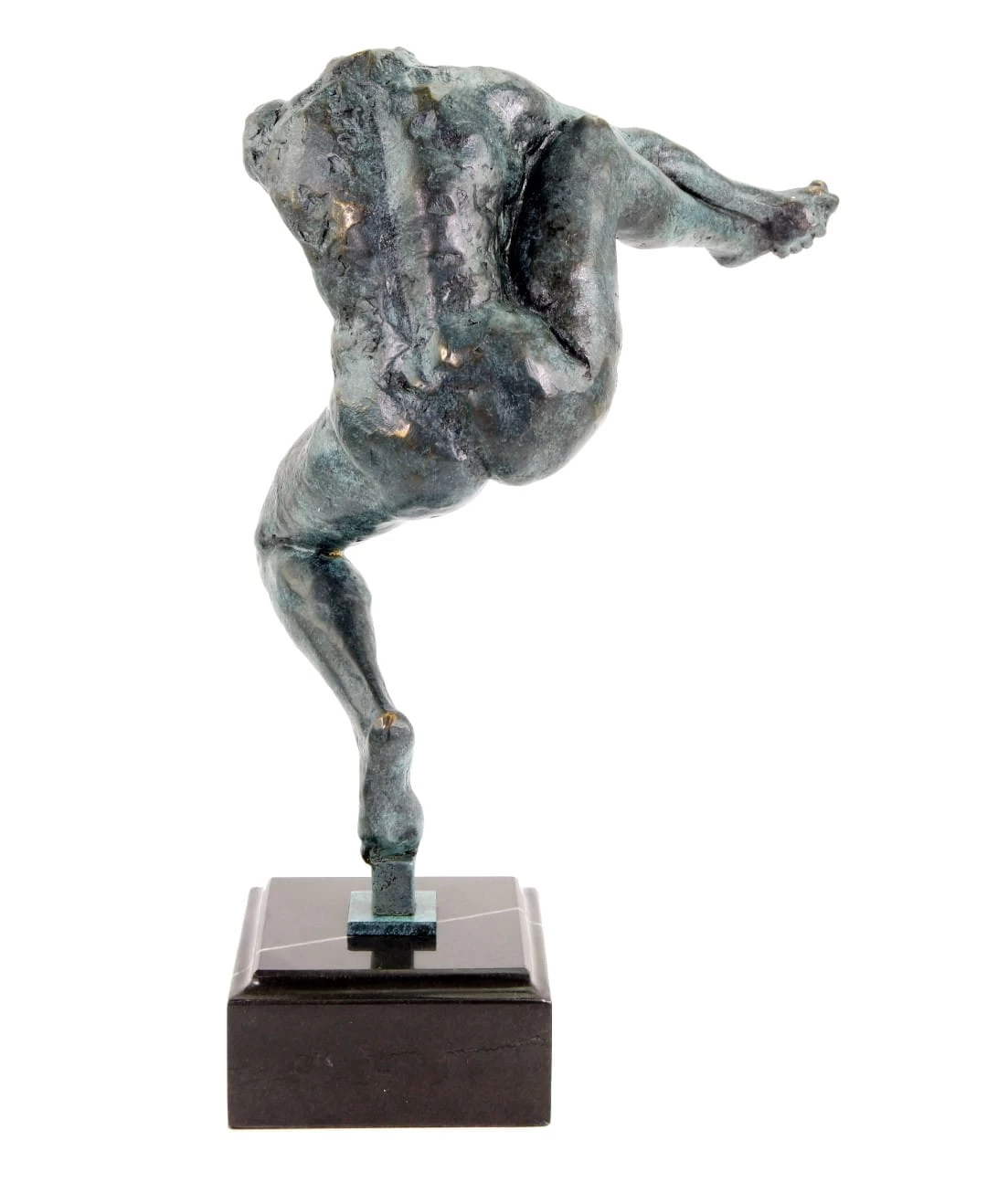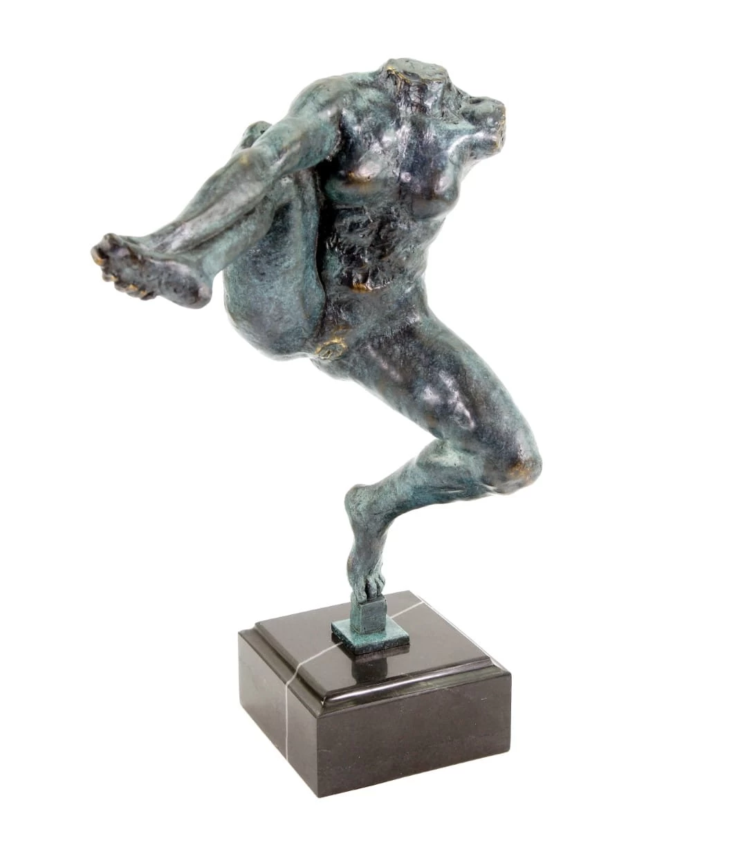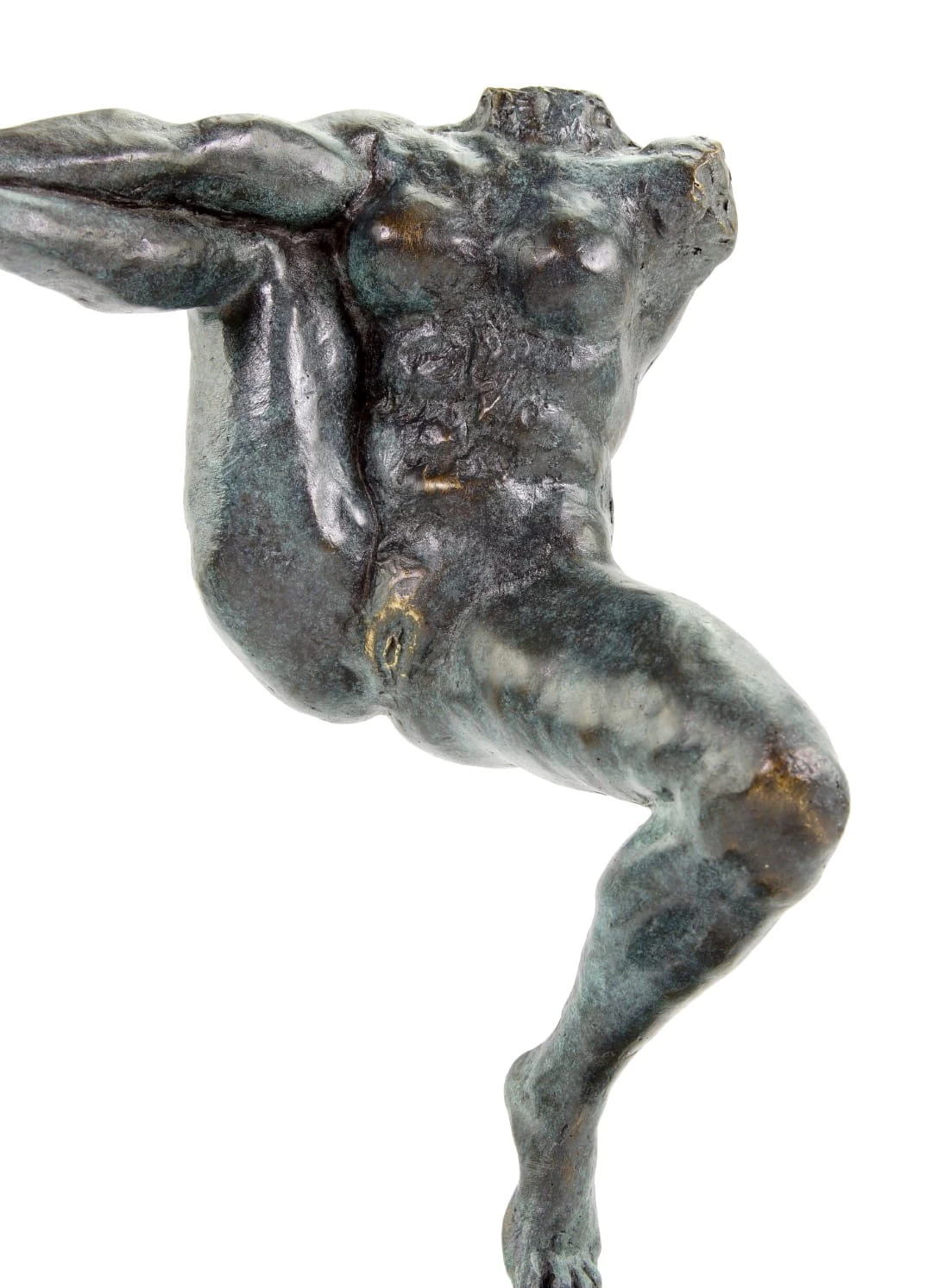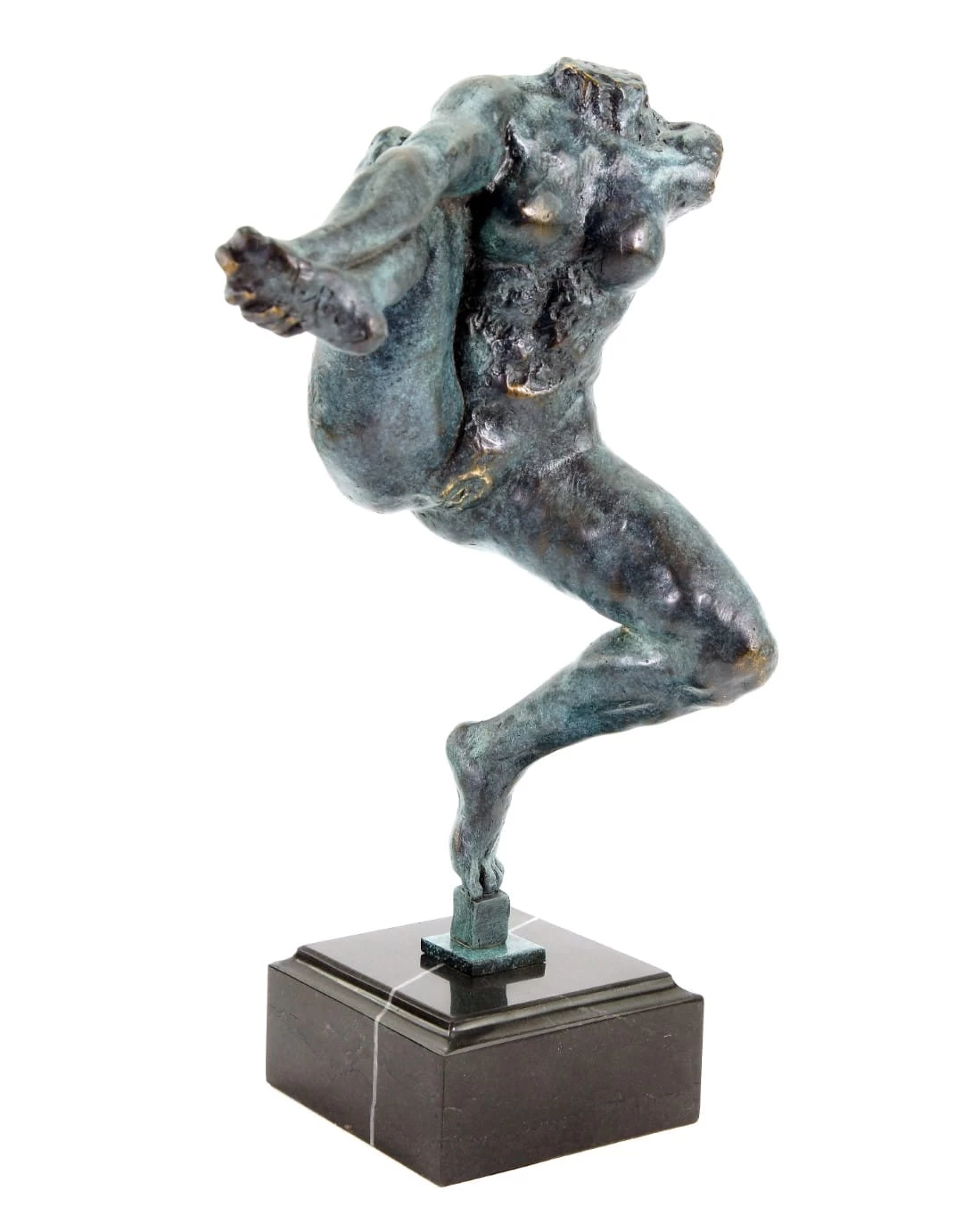 This contemporary bronze statue was designed by French object artist Auguste Rodin and bears the name Iris, Messenger of the Gods. The mythological motif, which was first realised in 1891, portrays the abstract bronze nude of a woman. Rodin’s expressive interpretation of Iris, the messenger of the gods, effectively blurs the boundaries between expressivity and straightforward eroticism. The slightly abstracted woman spreads her right leg away from her body and holds her right foot firmly in her hand. The revealing pose of the erotic sculpture gives the observer a direct view of the pubic area of the depicted female figurine. With this open, natural depiction of the female sex, Auguste Rodin defined a new image of women in the sculptural arts that effectively combined erotic appeal, natural physiognomy and fertility symbolism. The contemporary bronze sculpture is placed on a discreet black marble base, which forms the backdrop of the motif and gives the erotic nude with a green patina the place in the spotlight it undeniably deserves.