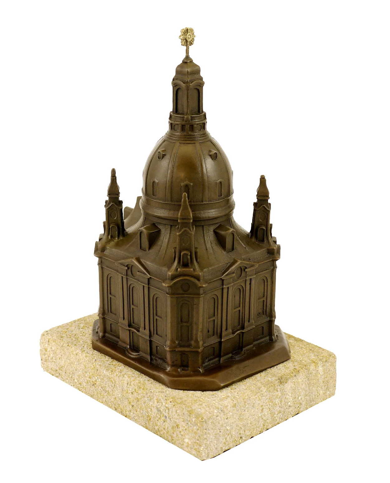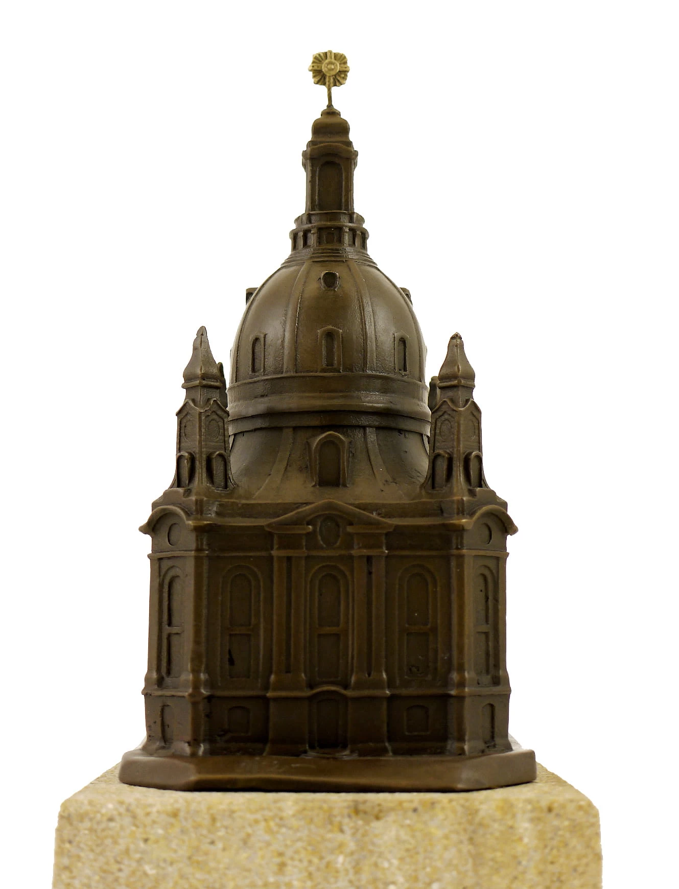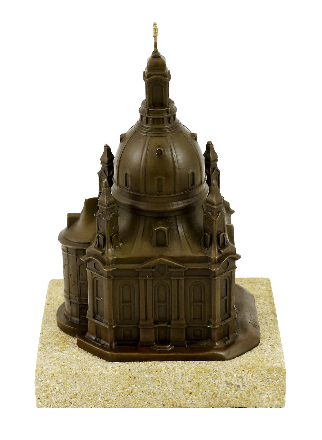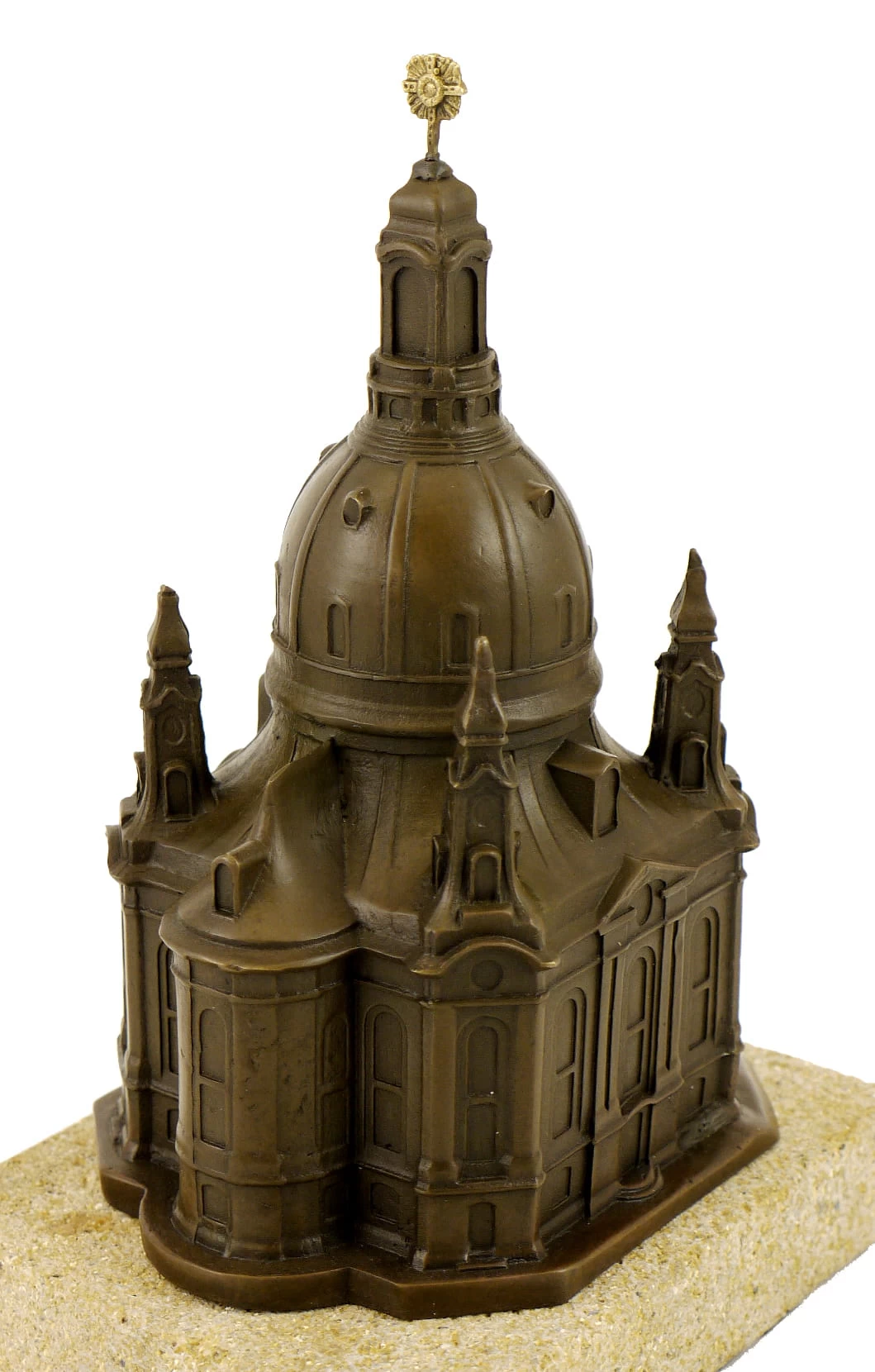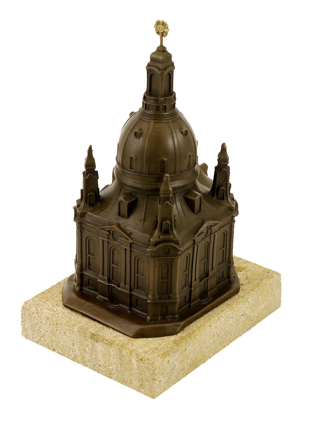 This bronze statue is a scale model of the Dresden Frauenkirche, the “Church of Our Lady”. The miniature model of the Lutheran church in Dresden is jewel for lovers of the Saxon capital. The monumental building at the Dresden Neumarkt is more than an Evangelical Lutheran church. Built in the 18th century, the church was destroyed in the bombing of Dresden during the Second World War. The original church was built between 1726 and 1743, and was designed by Dresden’s city architect, George Bähr. The historic building attracts millions of visitors to the place from which the message of reconciliation is sent out into the world. Both in private and in business premises, this bronze monument will fit beautifully and provide a positive atmosphere.