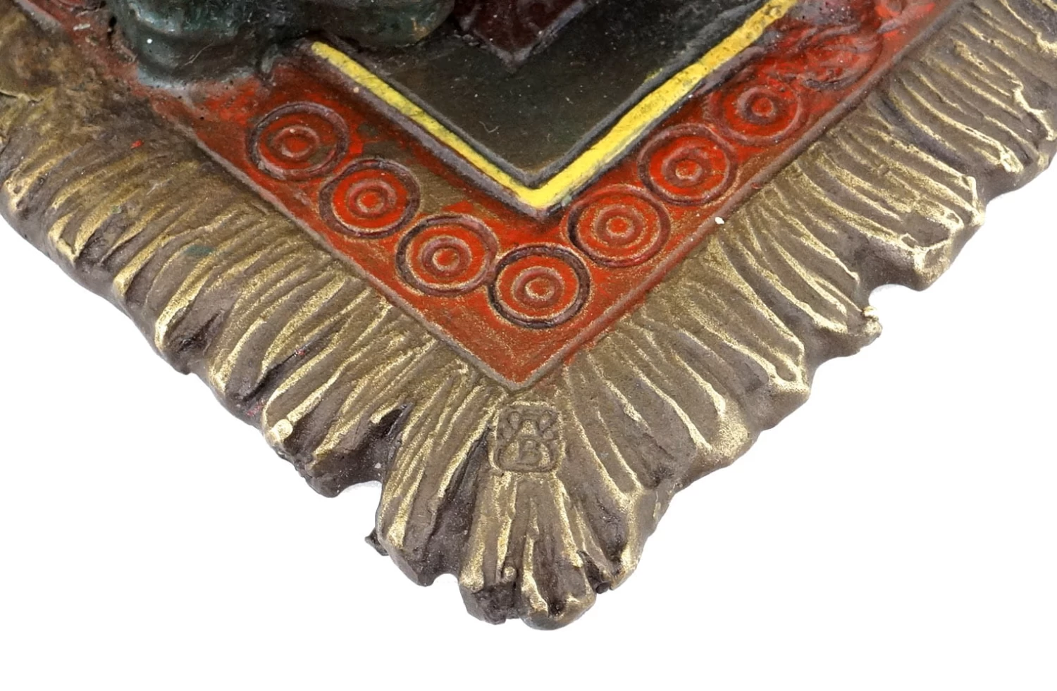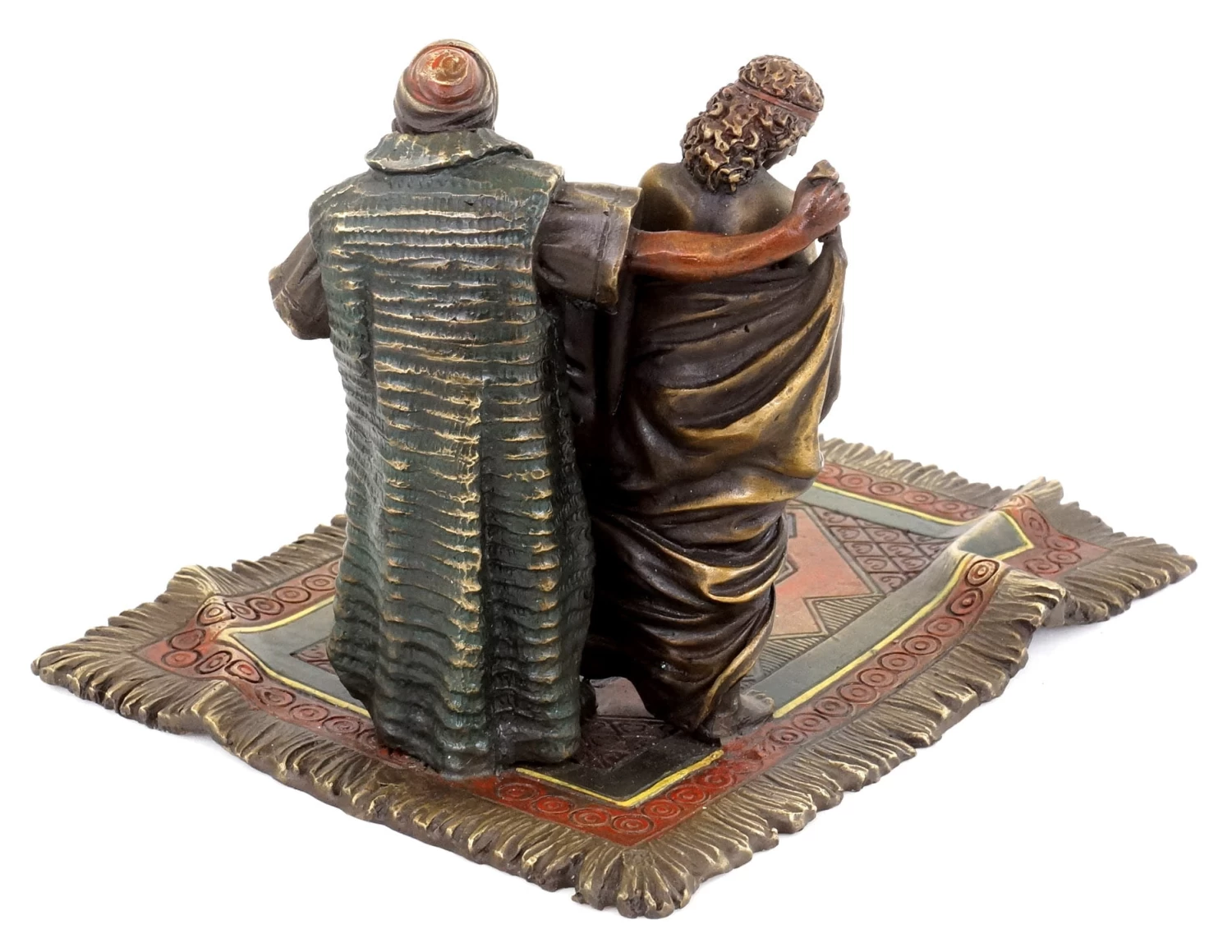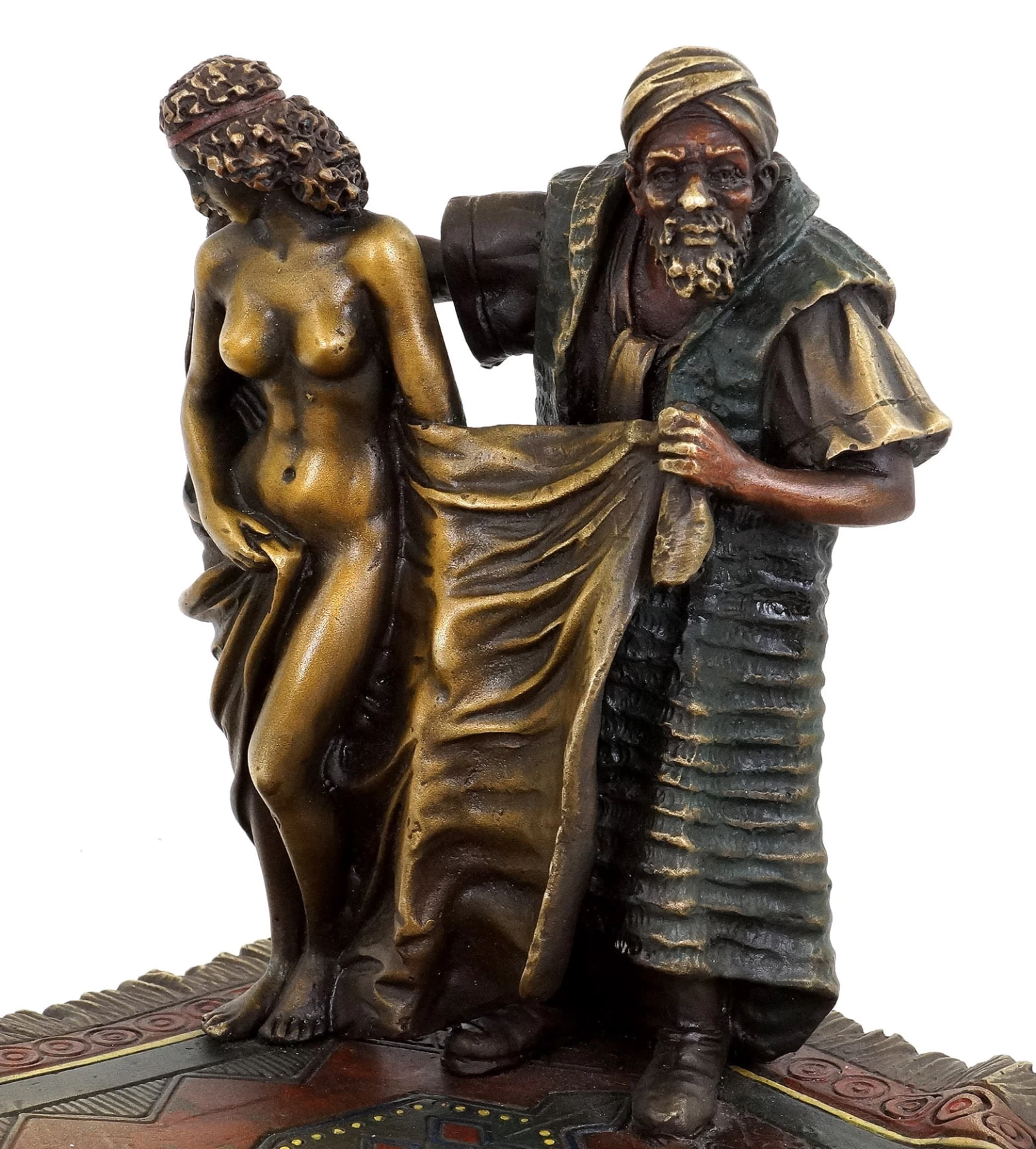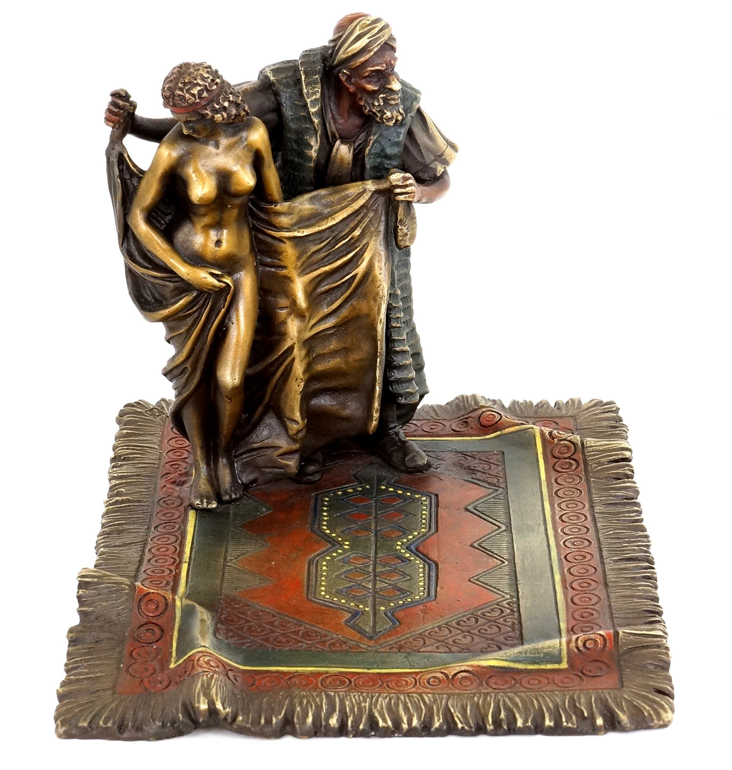 This erotic nude takes you into the world of The Arabian Nights. An Arabic carpet trader stands on one of his carpets with a naked slave. He offers the young woman, who can barely cover her private parts and shyly looks to the side, for sale. Skilfully, with the help of his blanket, he lets the observer see just enough of the woman to not reveal too much. He makes a very tempting offer, and with the help of his presentation, he seduces the viewer to purchase the Arabic beauty with the long curly hair. The erotic figurine was painted by hand in subtle colours which perfectly show off the scene. The Bergmann seal can be found at the edge of the carpet.