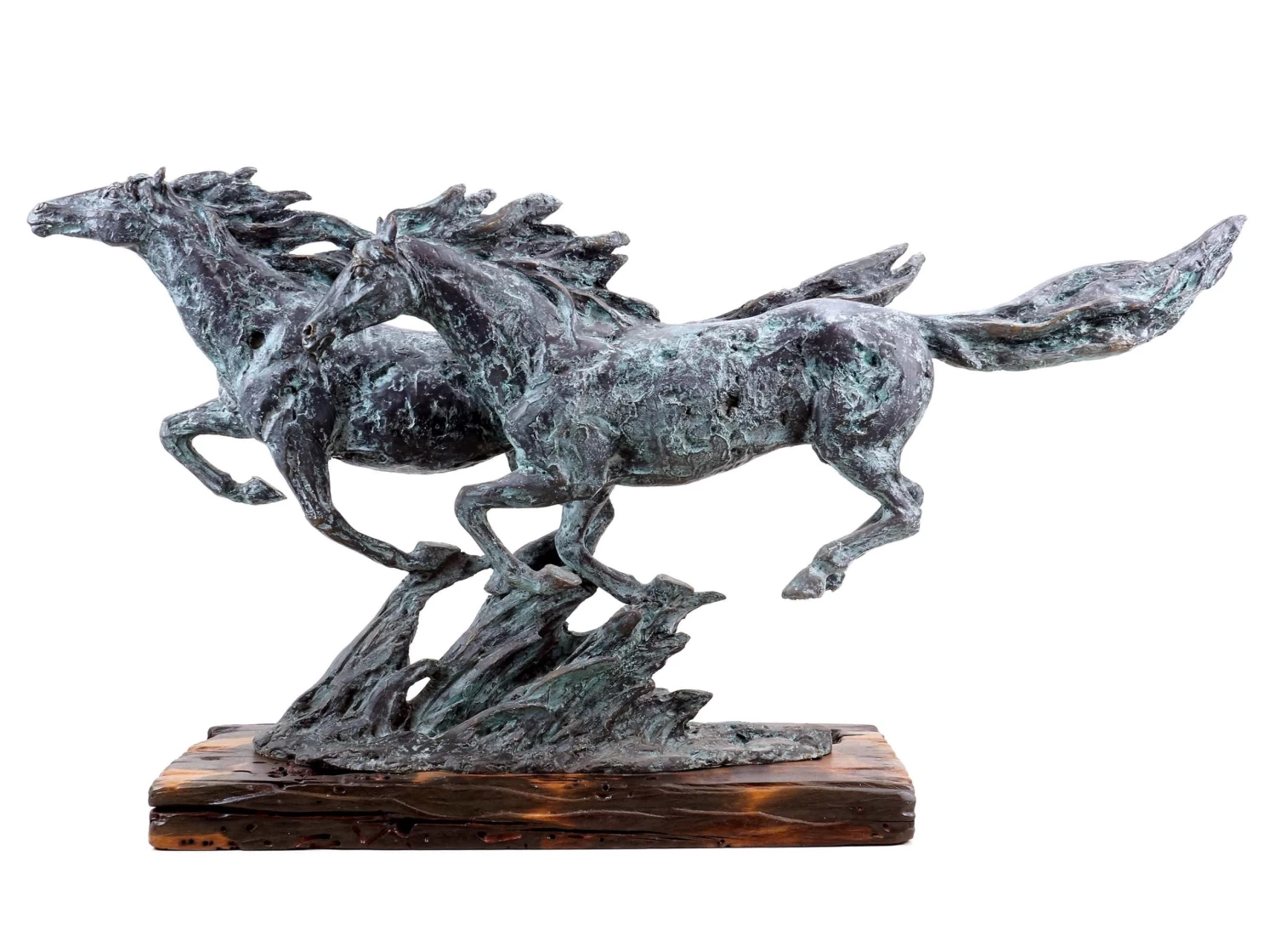 Placed on a base made of ship planks, these two galloping horses represent the embodiment of freedom. The decorative sculpture skilfully combines the art of authentic animal depictions, for which the artist Milo is widely known, with the abstract aspects of contemporary art. This dynamic sculpture is highlighted by a green patina, which sets the virtuously designed horses apart from the base made of old ship planks. Another interesting aspect of this sculpture is its detailed surface structure, which deliberately enhances the horse statue’s level of abstraction. This contemporary bronze figurine is numbered and limited to 10 exclusive pieces.