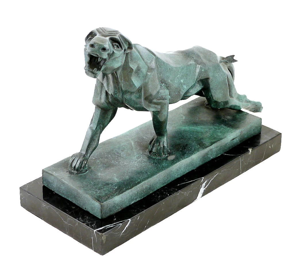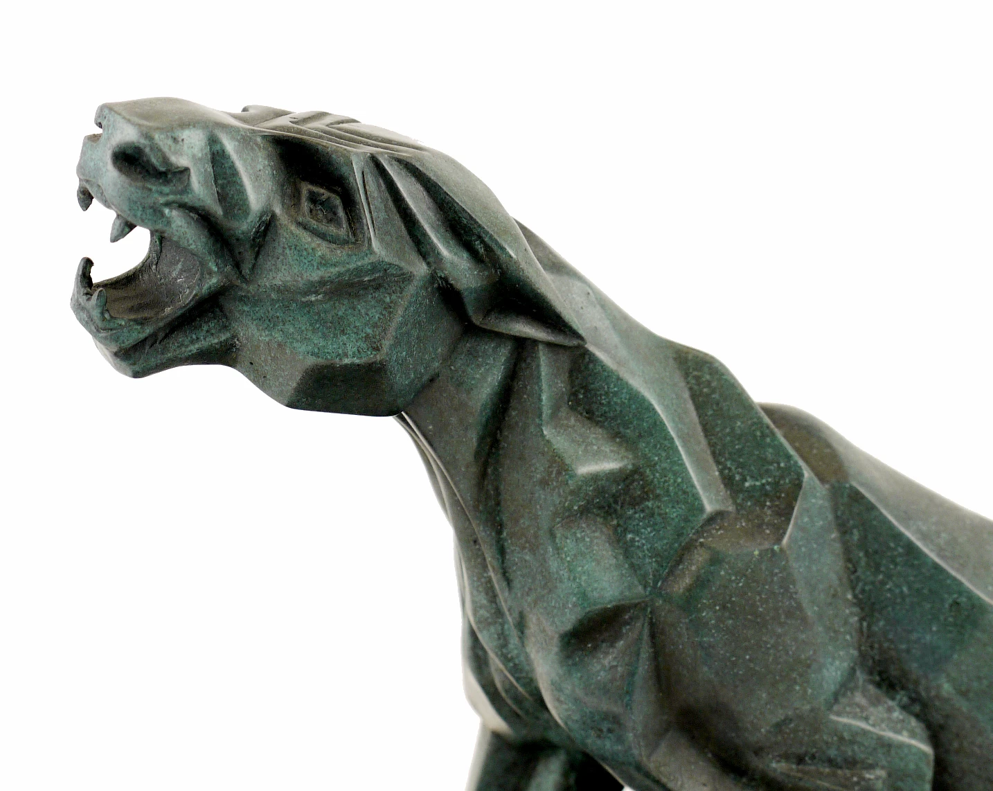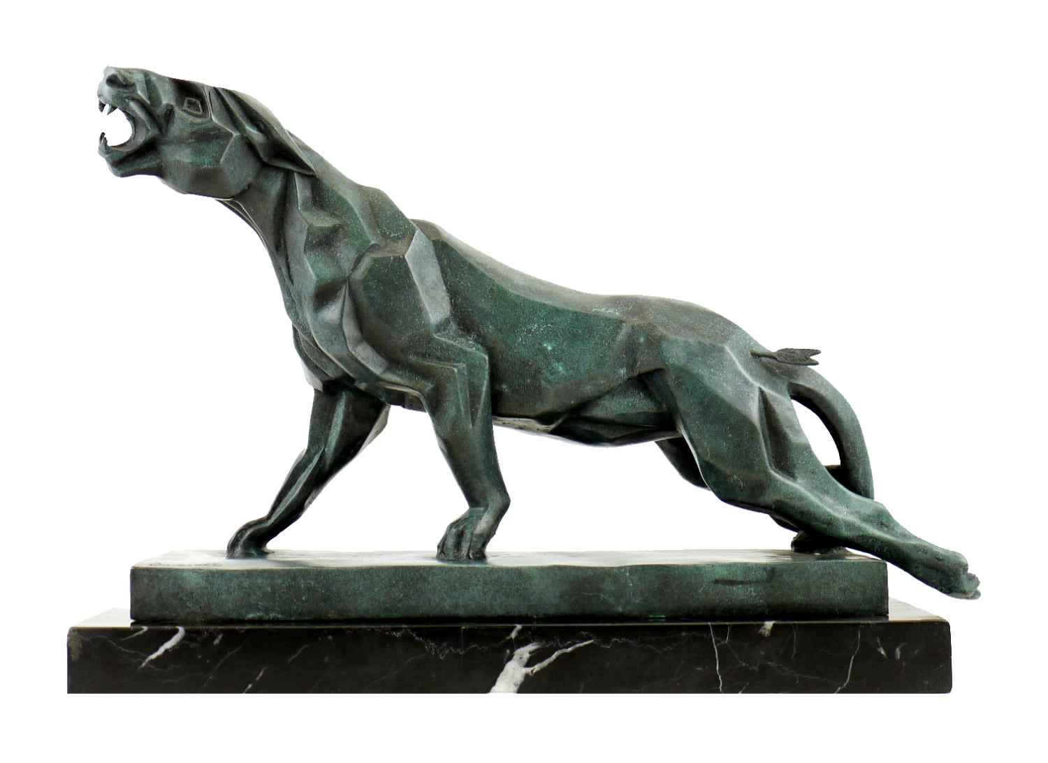 The cubistic bronze panther is a high-quality reproduction of Duvernet’s impressive animal figure. With the green patina the cubist panther cuts a fine figure especially outdoors. Despite the understated, abstract design, the viewer gets an idea of the dynamics and power that lies within the predator. Duvernet’s expressive animal sculpture suggests animalistic strength and physical superiority. The massive marble enhances the lofty pose of the panther. The sculpture includes the signature of the original statue.
