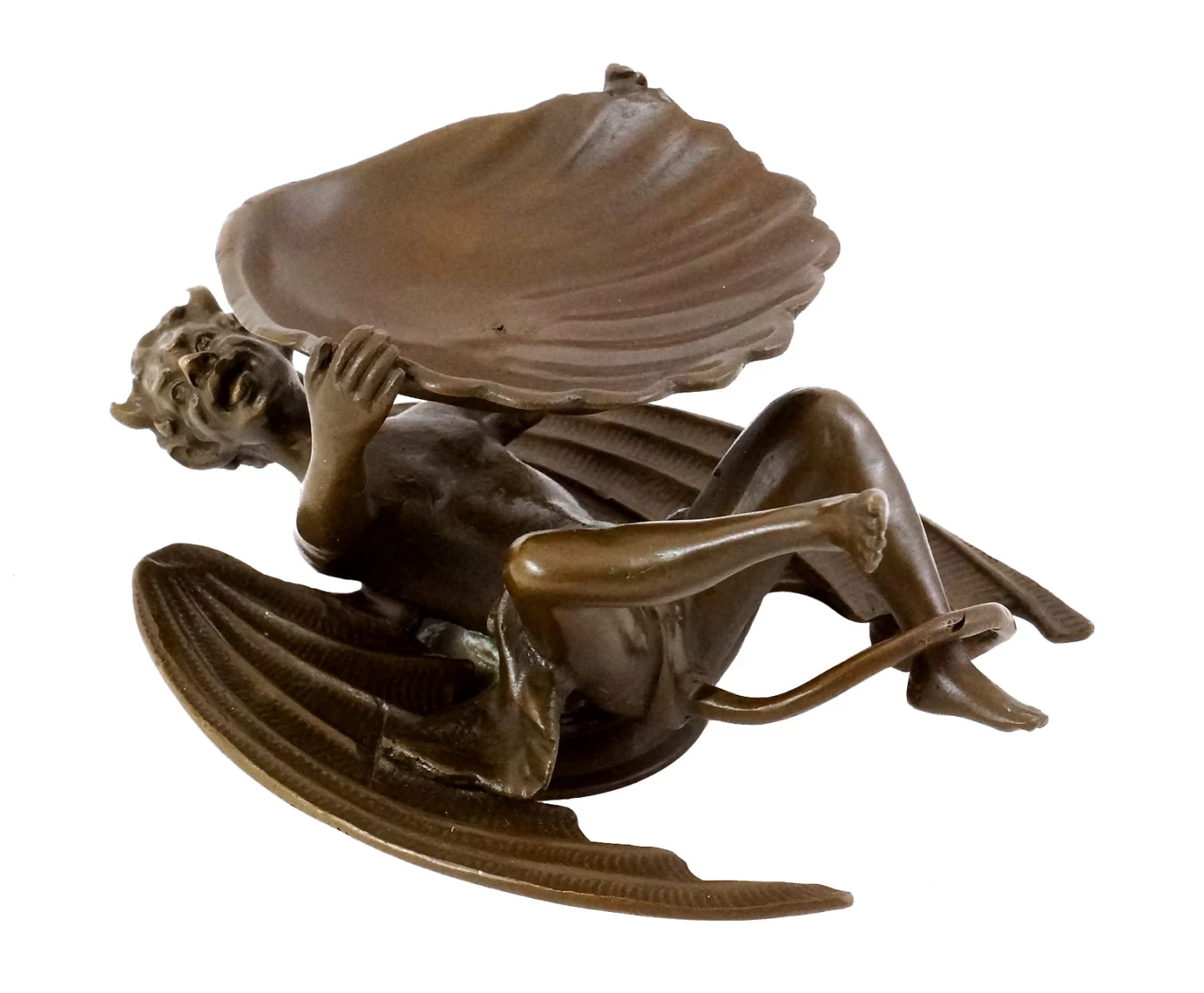 This sculpture deals with a typical subject from the Vienna Bronze-era as it is a useful and equally decorative item. The winged devil is lying on its back and holding a mussel shell in his hands. The shell can be used as storage for business cards, paper clips, also cigarettes and much more. Whether in private or business premises: The devil cuts a fine figure wherever it goes and is hallmarked with the stamp of the Bergmann foundry.