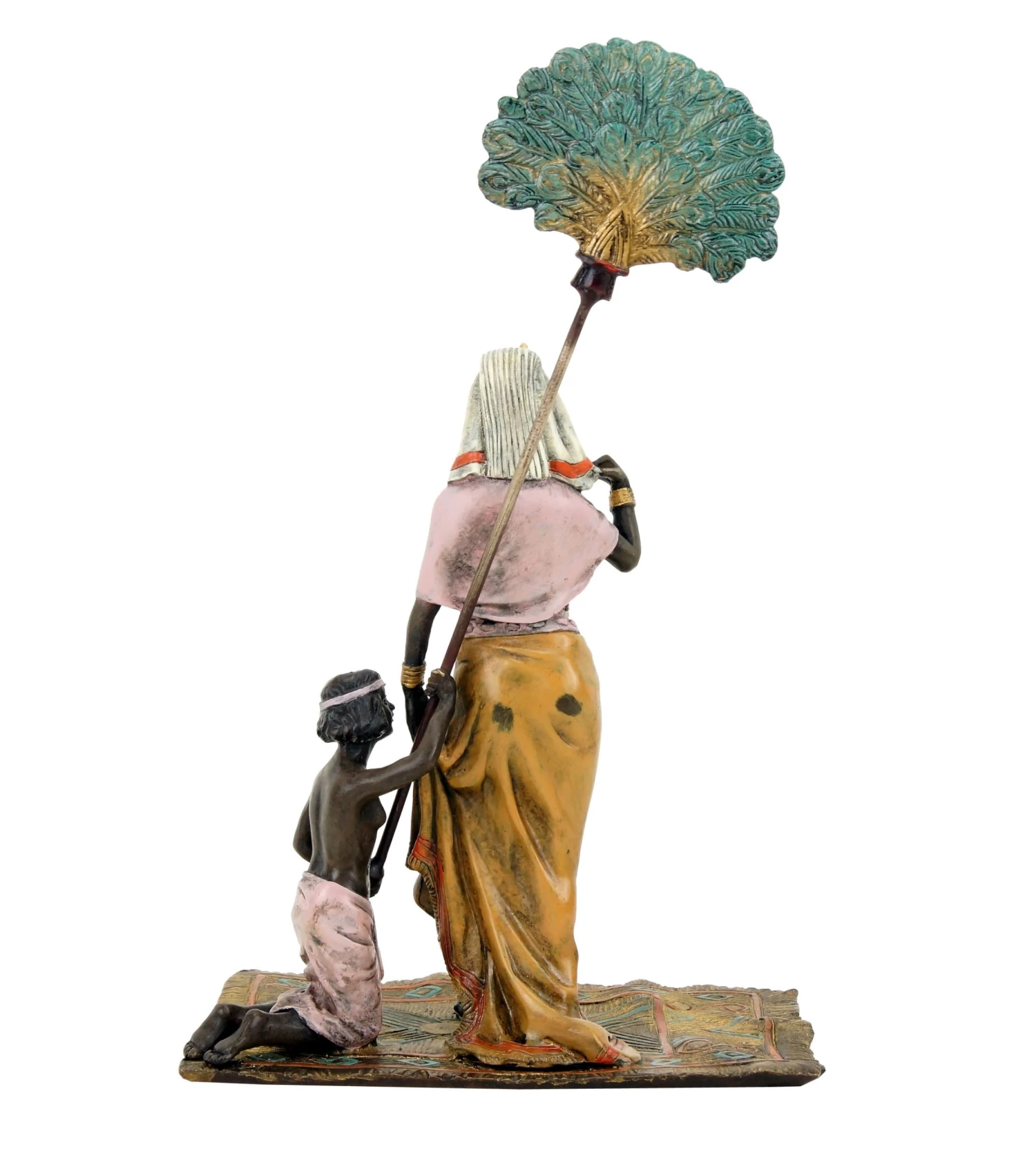 This Viennese carpet bronze takes you into the legendary world of Ancient Egypt. It depicts an erotic female pharaoh in soft flowing robes. She proudly wears the headdress and body jewellery typical of Ancient Egypt. Grovelling at her feet is a slave who holds a fan made of peacock feathers and supplies the half-naked pharaoh with cool air. Equipped with the Bergmann stamp, this erotic nude is part of a series of sculptures that are called carpet bronzes. Additionally, this small bronze sculpture was painted and refined by hand. Several polishings accentuate this decorative bronze collector’s figurine.