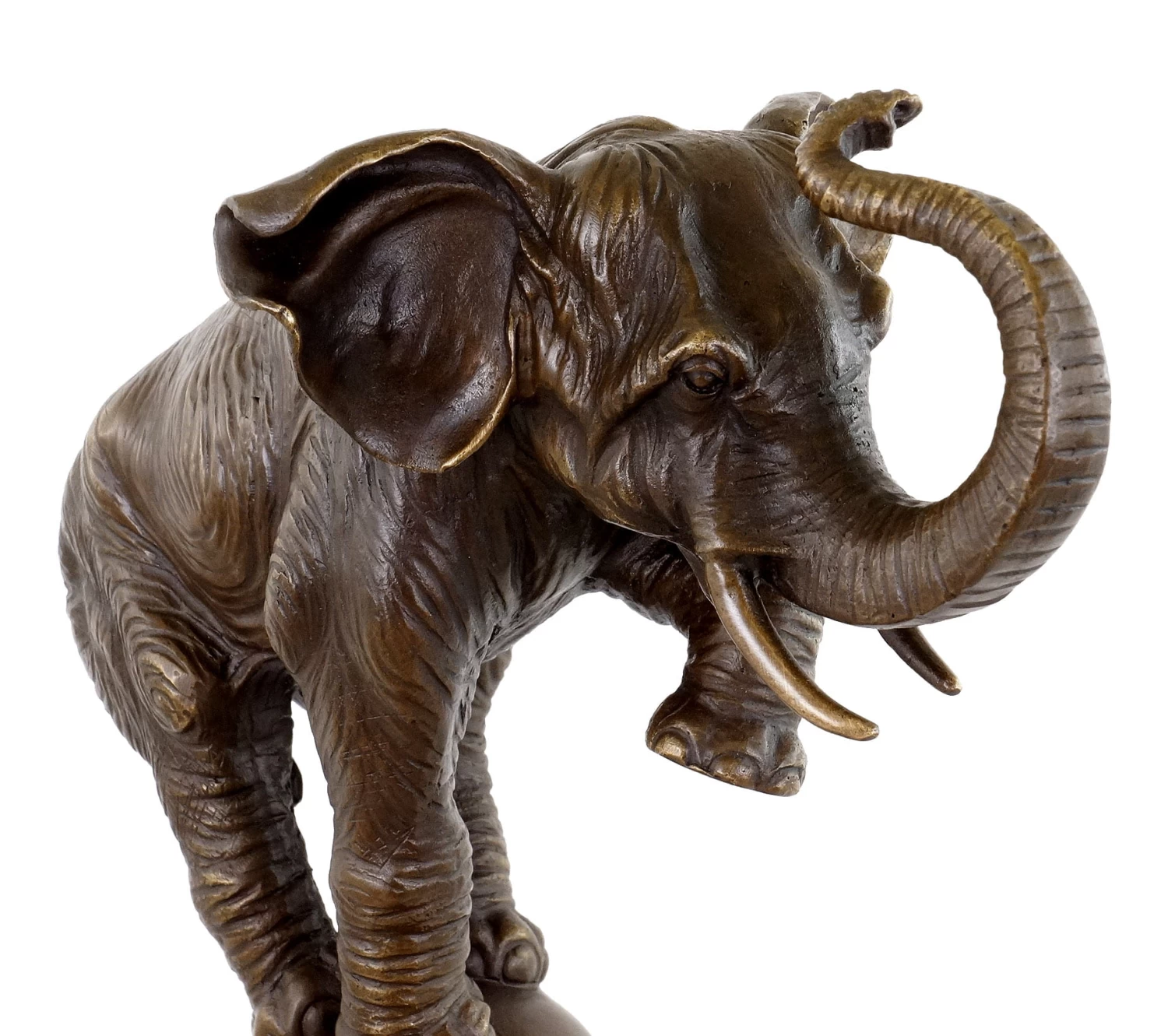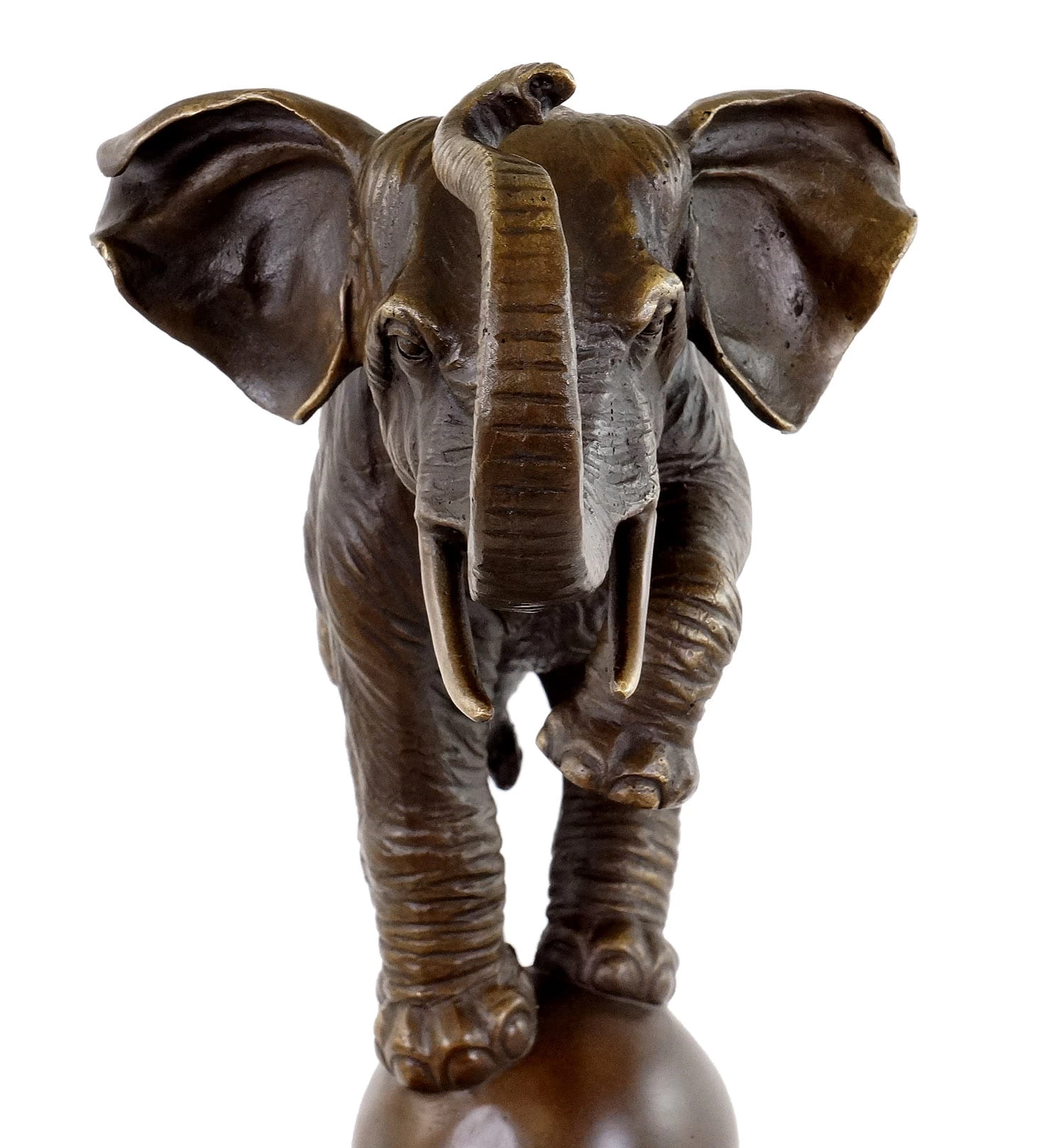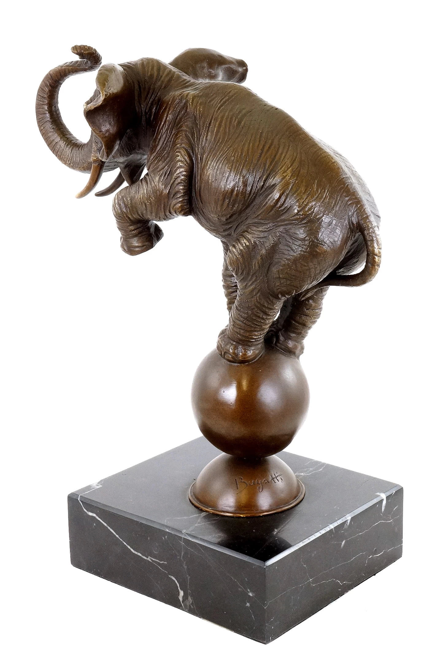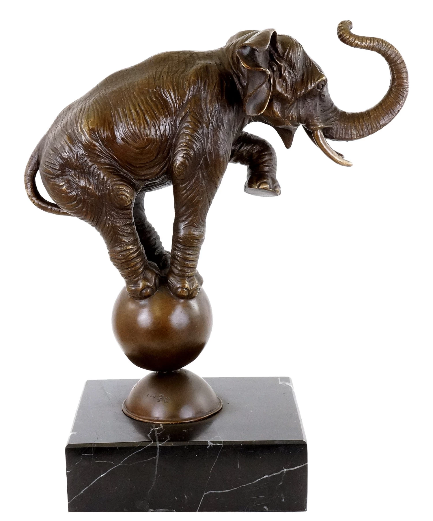 A big and heavy animal balances on a relatively small ball. This requires body control and intelligence. Humans have always been fascinated with the abilities of elephants, and still today they marvel at their performances in circuses, where they demonstrate exactly those stunts. Increasingly, wild animals are kept out of circus shows. However, this bronze animal sculpture reminds the observer of what an elephant is capable of, even if one would not think it possible. As a symbol for the fact that anything is possible, this elephant could decorate your venues. With his ball, he balances on a black marble base.