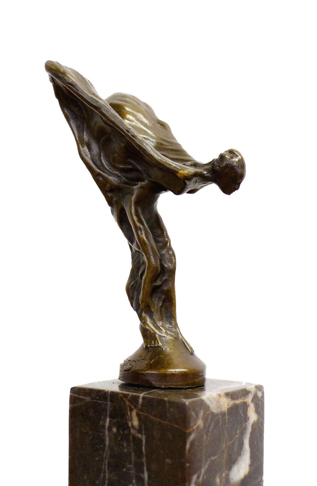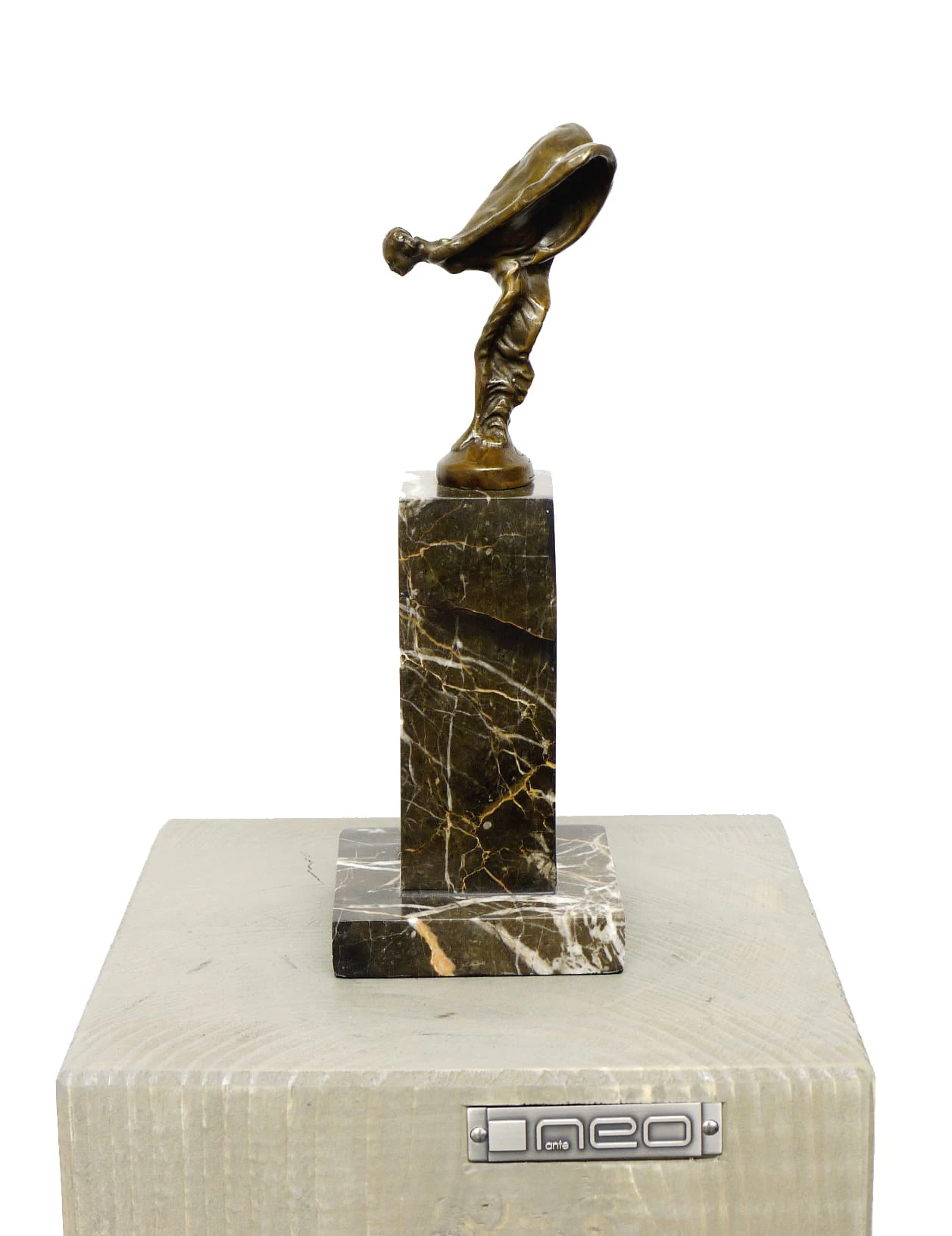 The Bronze Sculpture “Spirit of Ecstasy” was made after a cast of the British sculptor Alfred Stevens (* January 28, 1818; † May 1, 1875) by using the noble material bronze. The signed exhibit “Spirit of Ecstasy” – also known as the sculpture “Emily” – is one of the best known figures of the automobile history; “Emily” is known as the radiator mascot of the Rolls-Royce. On February 6, 1911 a first version of Emily was affixed on a Rolls-Royce. The exhibit shown here was affixed on a solid marble base and is a lightly abstracted recast. The original of “Spirit of Ecstasy” was made after an image of Nike, the Greek goddess of Victory.