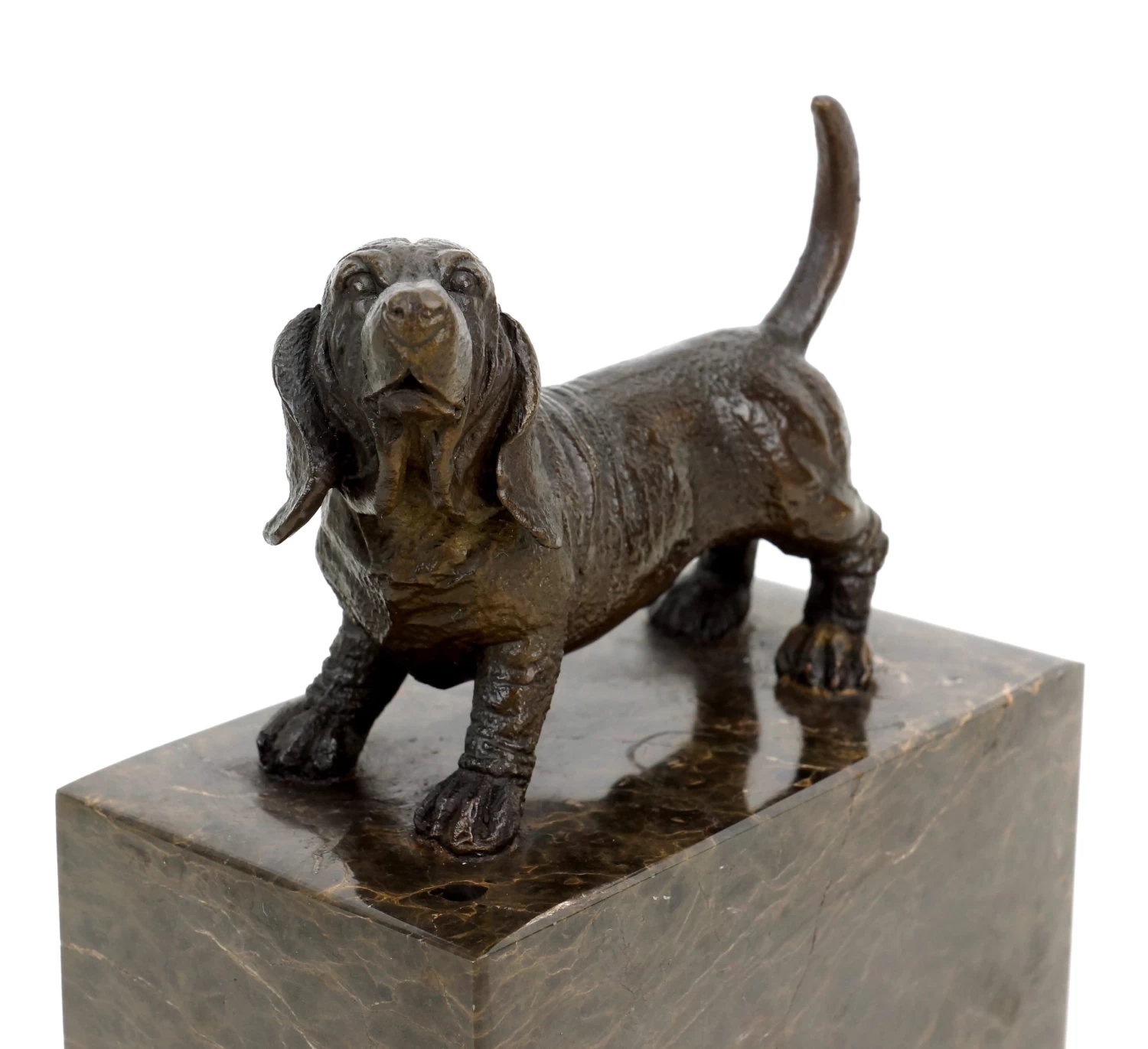 This decorative small bronze figurine is an homage to the English dachshund. Originally from France, from the mid-19th century on the basset hound was primarily bred in England, where it was used for hunting. Its main characteristics are its relatively bulky body, short legs, noticeably long ears and a headstrong yet gentle character. These characteristics were also used by the artist Milo when he created this charismatic dog figurine. The delicately designed surface structure of the dog in particular helped in bringing this authentic bronze sculpture to life. The signed basset hound figurine is placed on a colourful marble base which skilfully rounds off the sculpture’s overall effect.