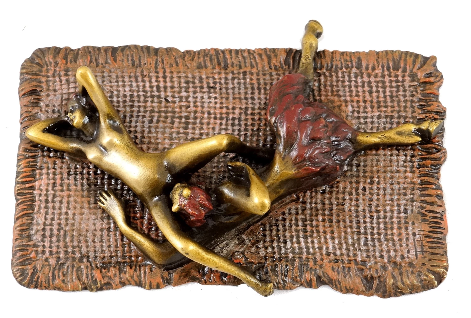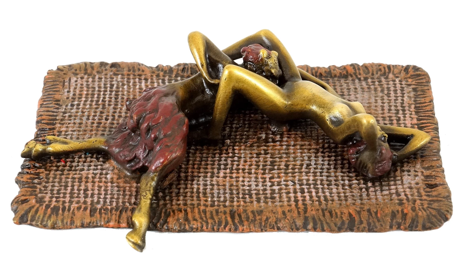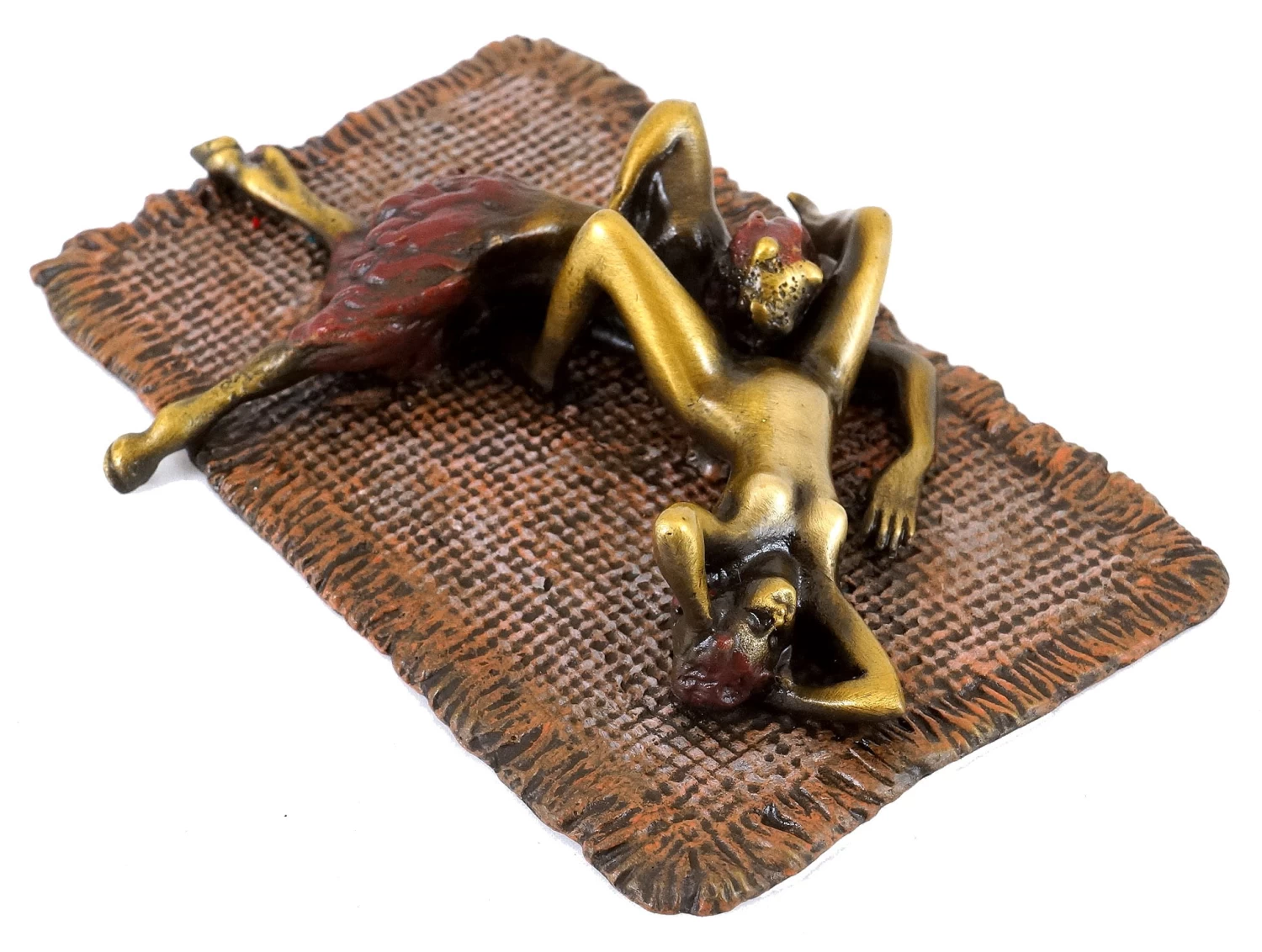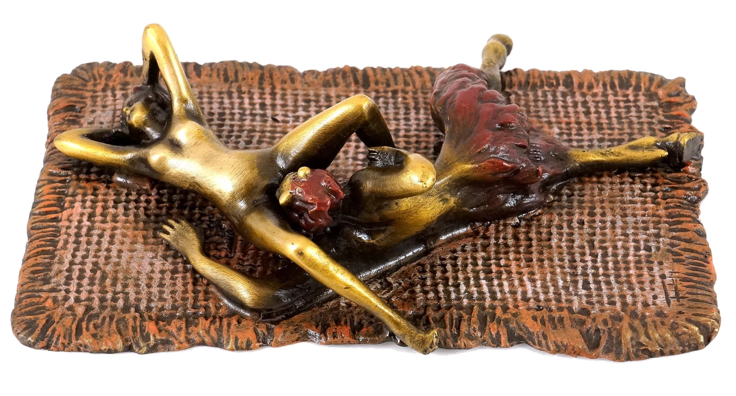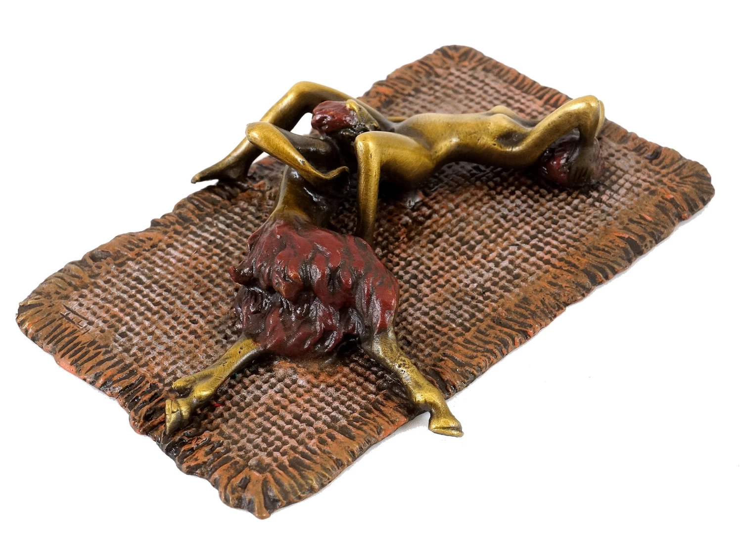 The adjoining bronze figure is an art object that was originally produced by the famous Vienna Bergmann foundry. Depicted is a virgin, who is satisfied by a faun. In Greek and Roman mythology fauns are forest spirits, they are half human – half goat, human from the head to the waist, apart from the addition of goat’s horns and the rest is thebody of a goat. They are often associated with satyrs and symbolize sexual compulsiveness as their horns have a devilish appearance. The scene takes place on a bronze carpet. For lovers of erotic art this figure is a stylish object. The figure is hallmarked with the stamp of the Vienna Bergmann foundry.