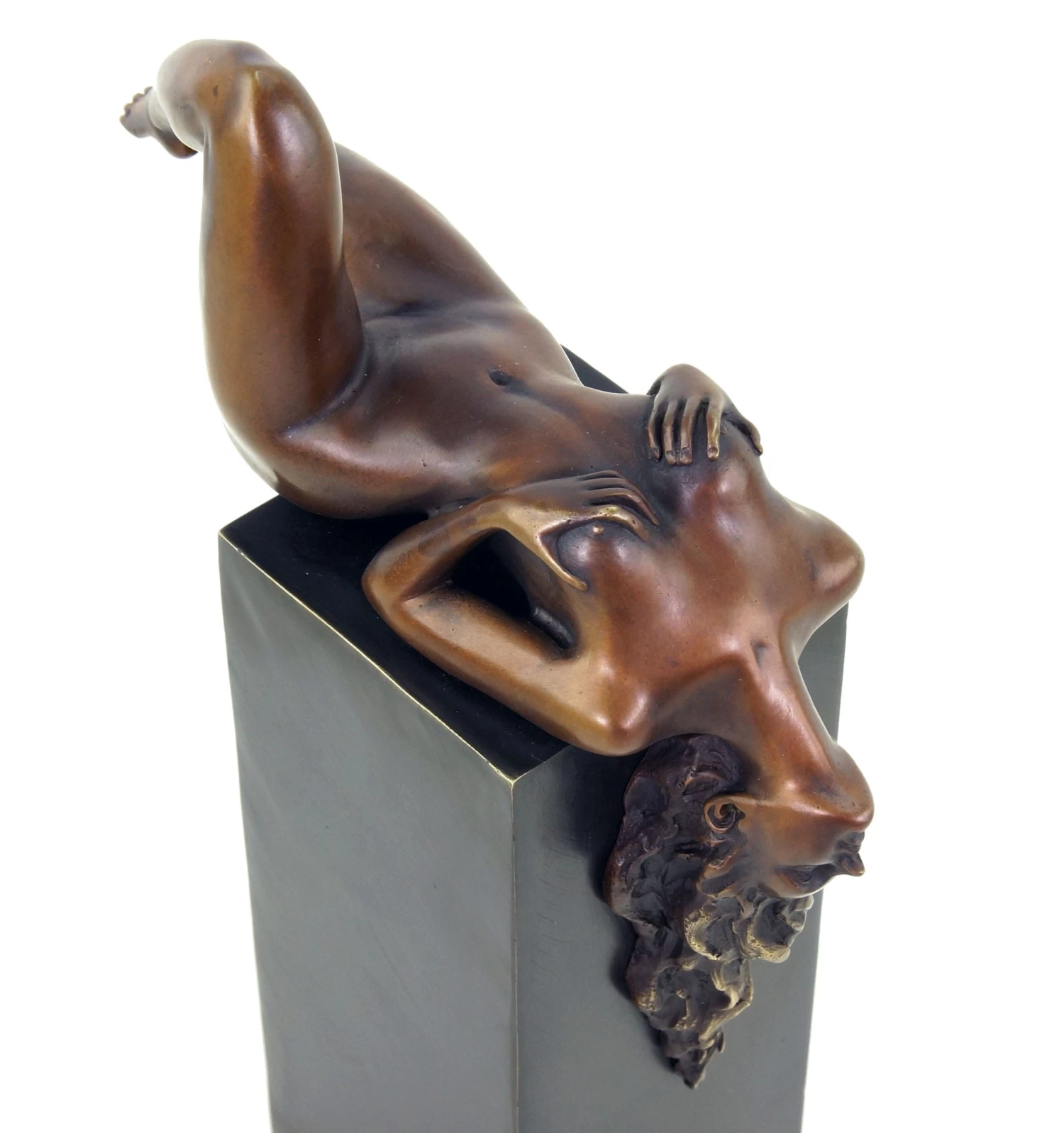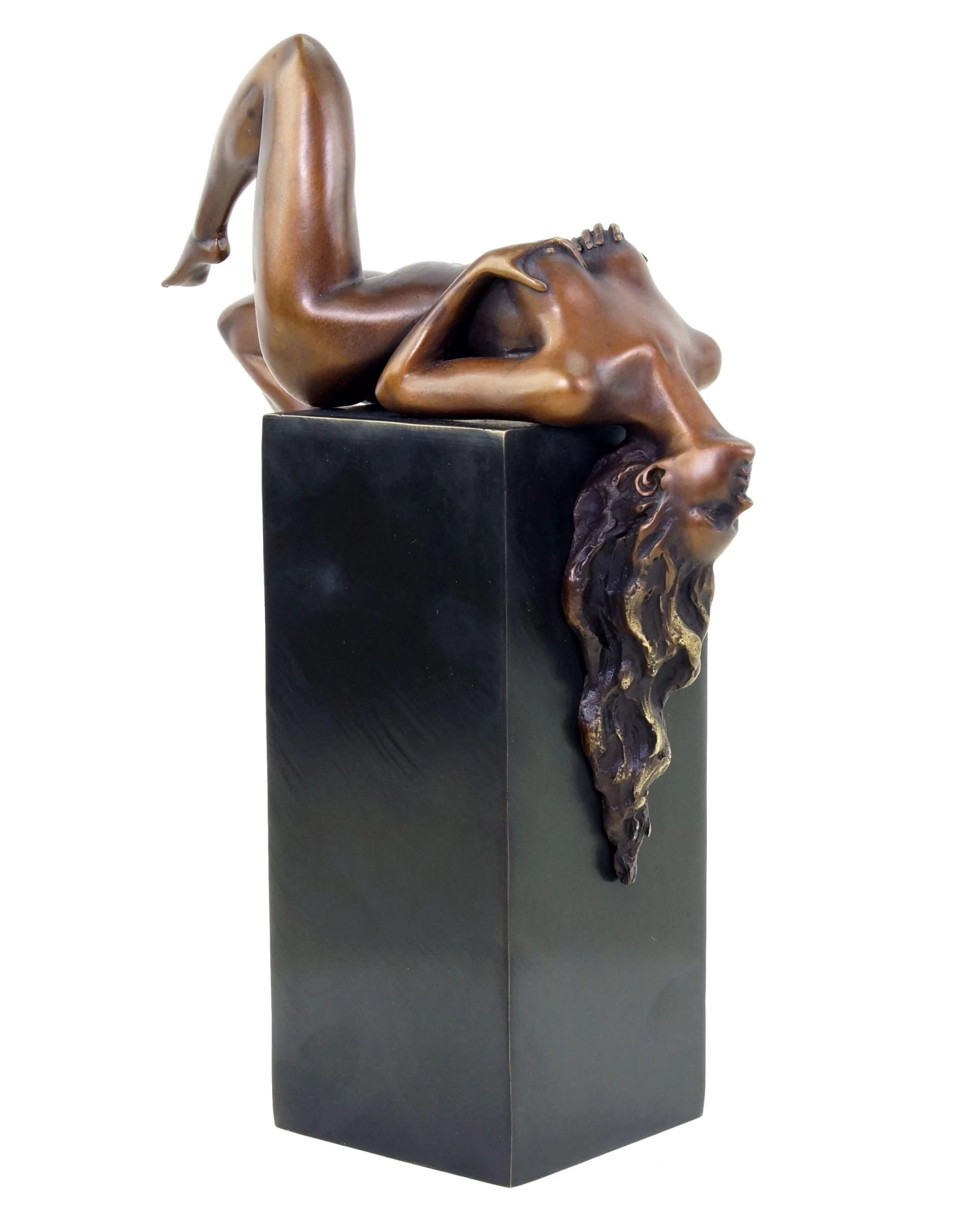This bronze sculpture by Martin Klein is exclusively limited to 20 pieces and skilfully combines modernity with erotic art. The result is a reclining female nude that pointedly surrounds the bronze base. In doing so, the well-proportioned female figurine lets her head drop lasciviously across the edge of the base. Her hair clings to the vertical course of the base. Her pose looks natural without losing its erotic effect. The artist Martin Klein skilfully incorporates the discreet base into the motif, making it a central part of the piece. The erotic nude is coloured by a special patina and a slightly reddish colour highlights the wantonly posing woman. The resulting symbiosis between black bronze base and figurine is a fascinating work of art. The erotic statue bears the signature of the artist and is serially numbered.