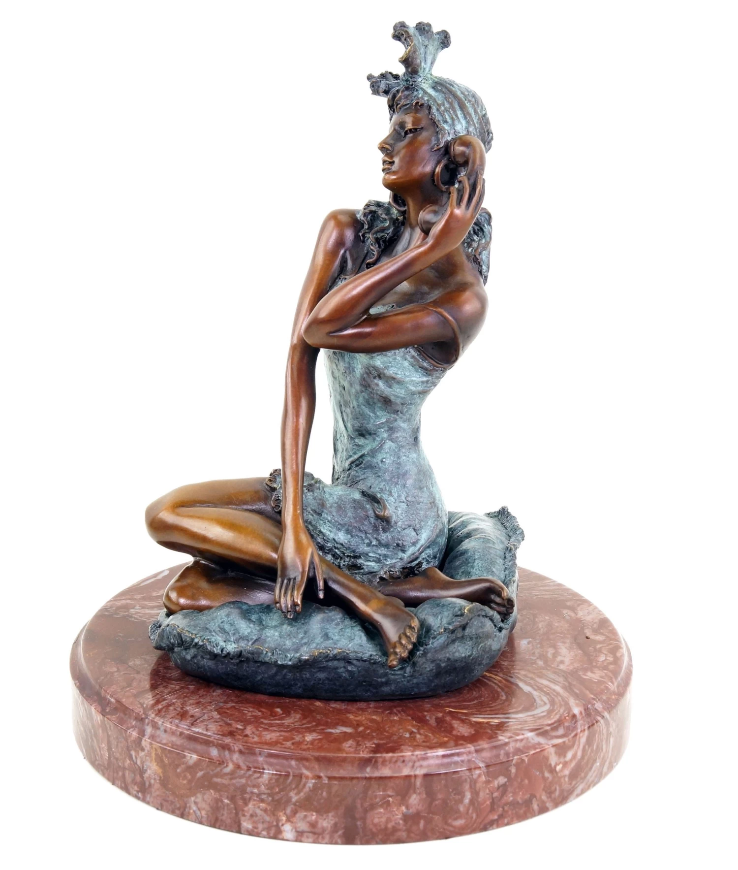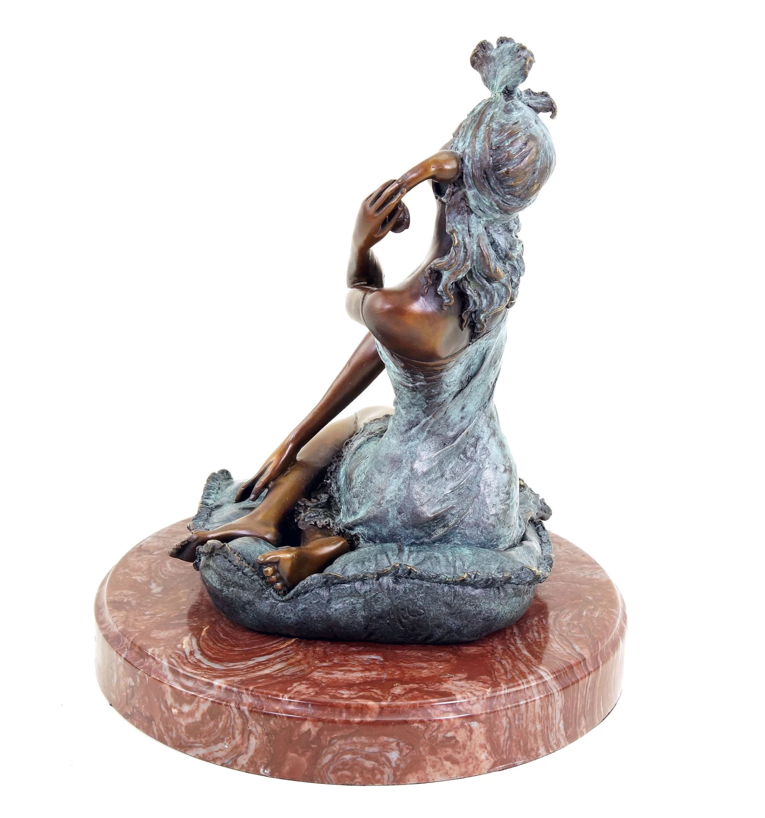 With this erotic nude bronze sculpture of Erotic Girl Sarah on the Phone, the artist Milo sculpts a fascinating snapshot of a scantily clad young woman wearing a tied scarf around her head. This beauty with a wanton look seems to be immersed in her telephone conversation, sitting on a pillow and holding a telephone receiver in one hand. All the various components in this motif are portrayed in an immensely authentic way. Stylistically, this erotic nude is very much reminiscent of the Fifties. The bronze statue is patinated in two colours and placed on a marble base, which bears the signature of the artist. Buy erotic art online at Kunst & Ambiente’s Bronze Shop.