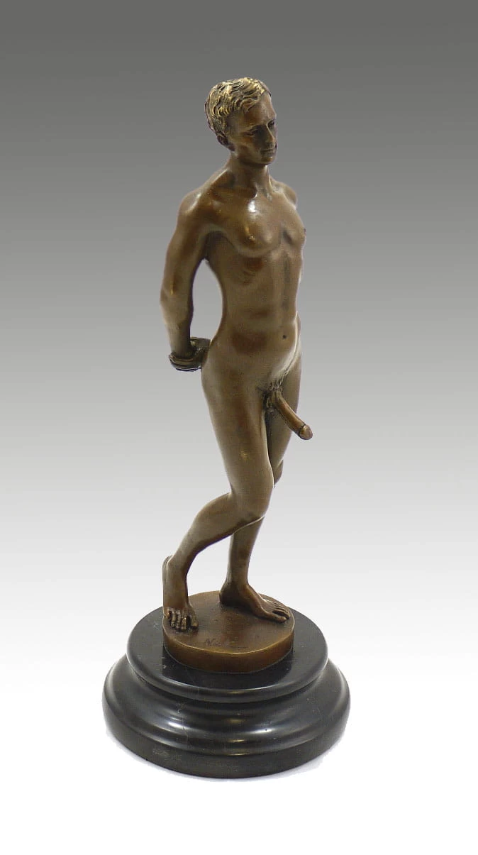 This inspiring erotic bronze sculpture was made by the sculptor M. Nick, who is well known for his great erotic art sculptures which show the hot aesthetic of lecherousness in a very humoristic way. This sculpture of the erected man with his huge phallus, is one of the erotic, but also humoristic, artwork from the artist M. Nick. The sculpture was made following other portrays of naked young males, that were already created during ancient times, for example in ancient Greek males were portrayed naked to show their power as well as how musular their body was. Even at the Olympic Games the male participants didn’t wear any clothes, therefore the arbitrators wanted to make sure nobody could cheat with any hidden aid. In ancient Rome not only the athletes where portrayed naked, also the male gods and heroes were shown on paintings without any clothing. The nakedness was supposed to show the great physicality of the gods as well as of the heroes. Important was also to portray the (erected) penis, as it was a symbol of power and fertility. Therefore, male nude pictures show power and solemnity and the idea of showing the male phallus is also a beloved motive of the modern age, especially in art and sculpting. One of the best examples are the sculpture of David, made by Michelangelo during 1501 and 1502 in Florence and the sculpture “The Thinker” created by Auguste Rodin in 1882.