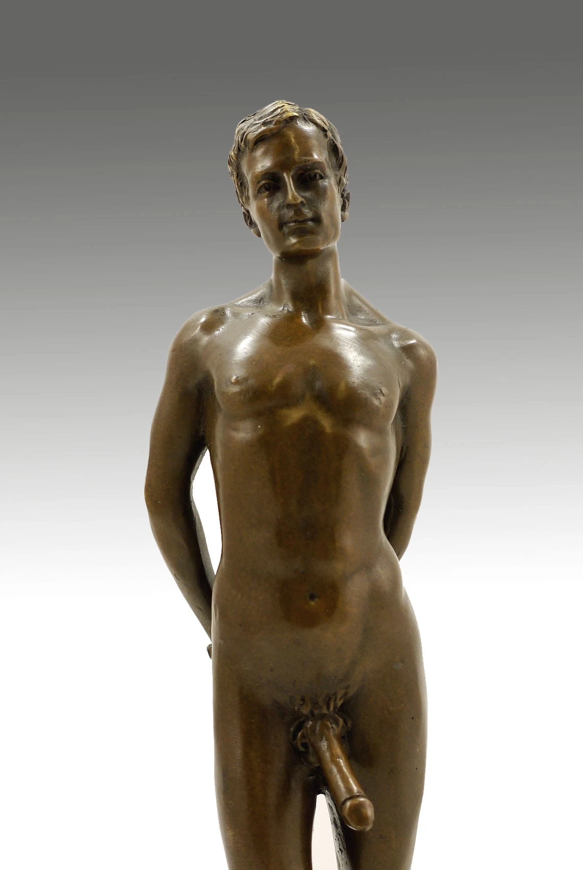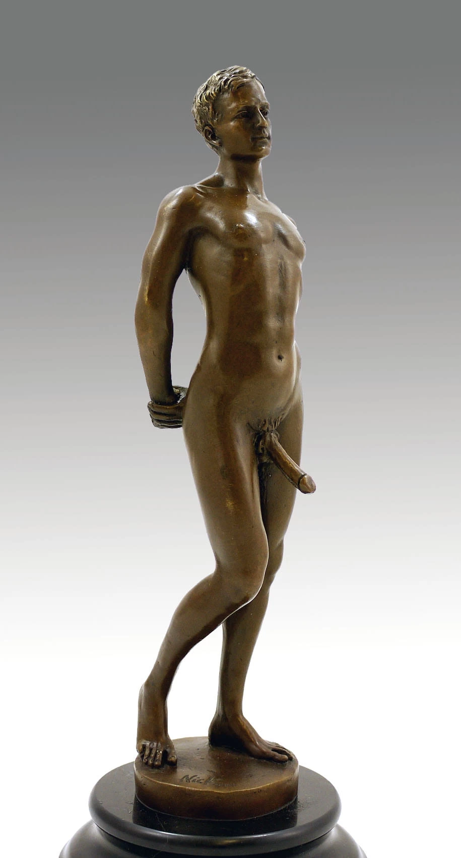 This erotic bronze is the image of a very horny young man, who proudly presents his huge erected penis to the audience. While he is presenting his large phallus, he has a devious smile on his face. He young attractive male has his hands behind his back and is pushing his hips slightly forward, therefore the observer can’t possibly oversee the phallus of the male. This exciting sculpture was once created by the artist M. Nick, who also signed left his signature on this erotic nude sculpture. This sculpture with the great title “Horny man with huge erected penis” is a very realistic, detailed and filigree picture of the depiction of male lecherousness. His facial expressions as well as every single muscle of his well shaped body are looking very natural and detailed. But the generous portray of his huge penis is the highlight of this sculpture, that is made of 100% finest bronze and affixed on a solid round shaped marble-base.