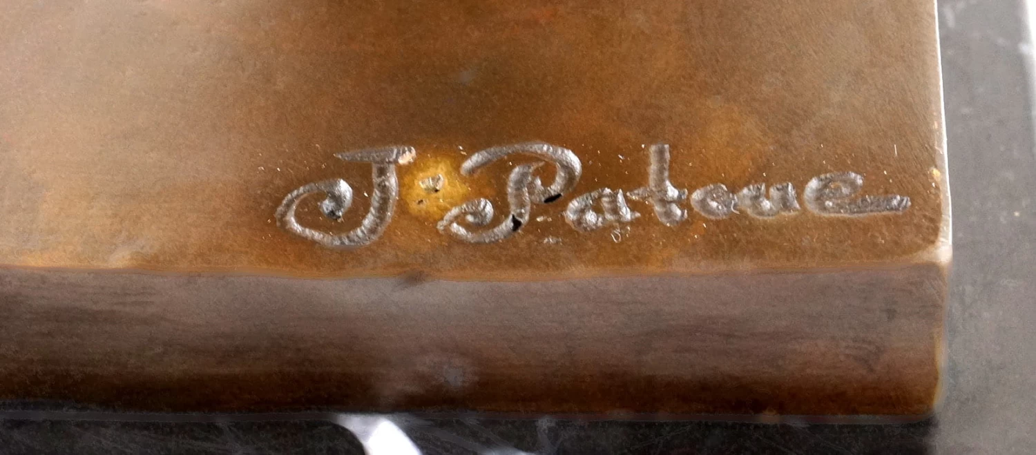 The adjoining bronze statue was designed by the French artist J. Patoue. A contortionist, also called snake woman, is an acrobat who can slow turn his body due to years of training. In general, contortionists have an unusually high natural flexibility, which is enhanced by special gymnastics. The term contortion describes a form of acrobatic performances, in which the artist turned his body into positions that seem to be out of reach for most people. Contortion is often part of a circus number. The statue is bearing the signature of the artist and is mounted on a black and white marble plinth.