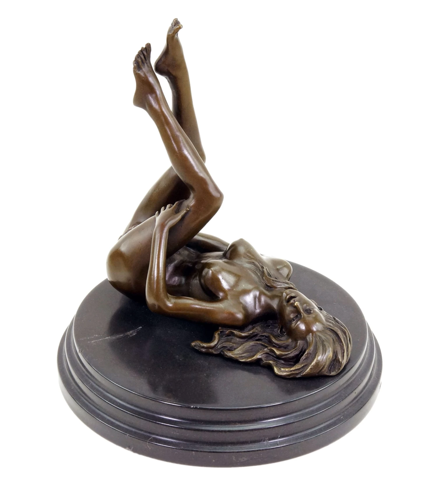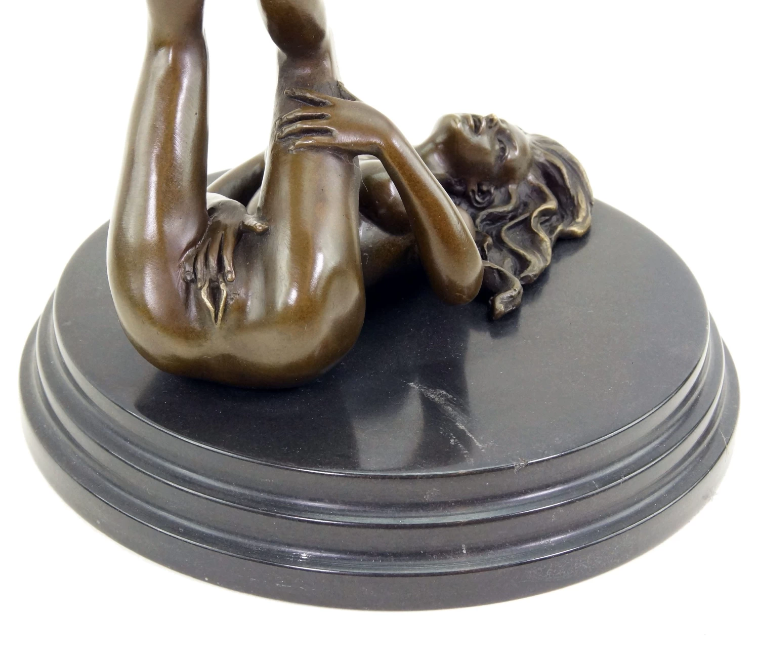 Erotic Girl Mary is part of a series of fascinating bronze figurines that deal with the depiction of female erotic nudes. In this case, the bronze statue portrays the Erotic Girl Mary by M.Nick. It shows a beautiful, well-proportioned woman who is lying on her back with her legs raised up high. The observer is permitted to witness a moment of complete ecstasy, as one hand of the young woman rests on her thigh while the other is used for masturbation. Additionally, the observer can marvel at the particularly detailed way in which the bronze statue was crafted. Erotic Girl Mary is placed on a discreet black marble base and bears the signature of the artist. Collectors are undoubtedly appreciative of this erotic female nude, but it is also suitable as the perfect erotic gift or as an eye-catcher in any bedroom.