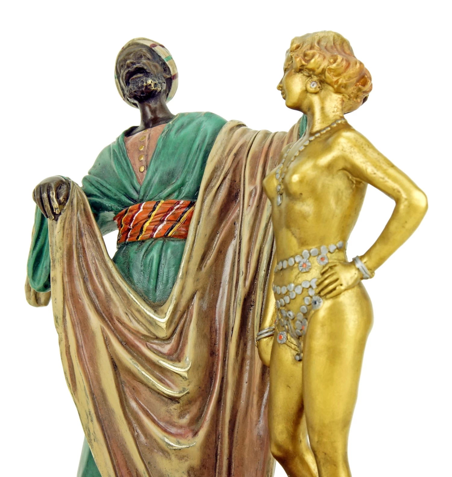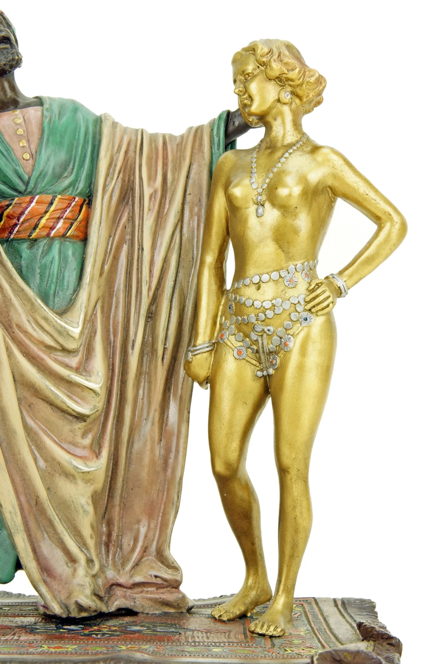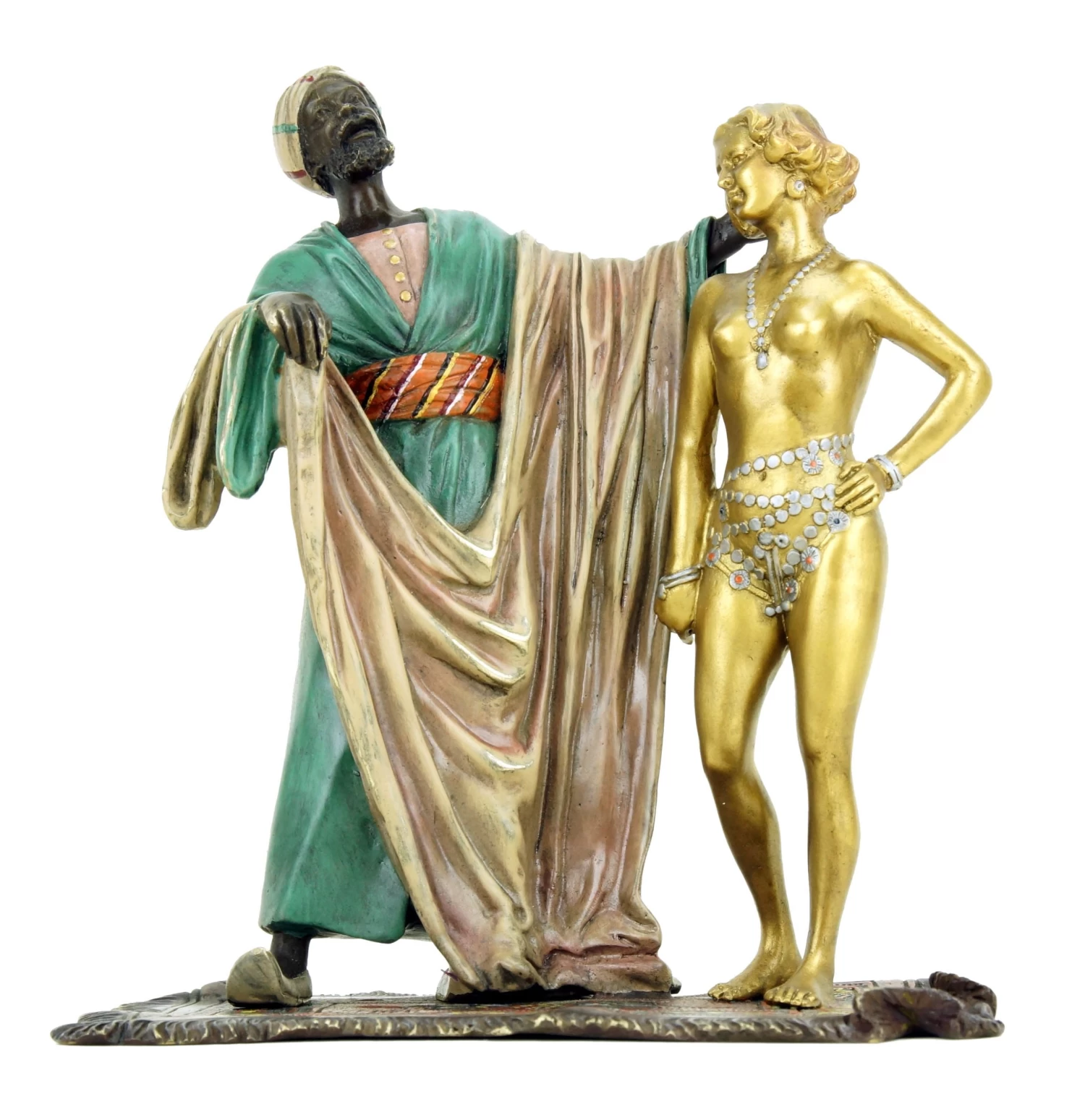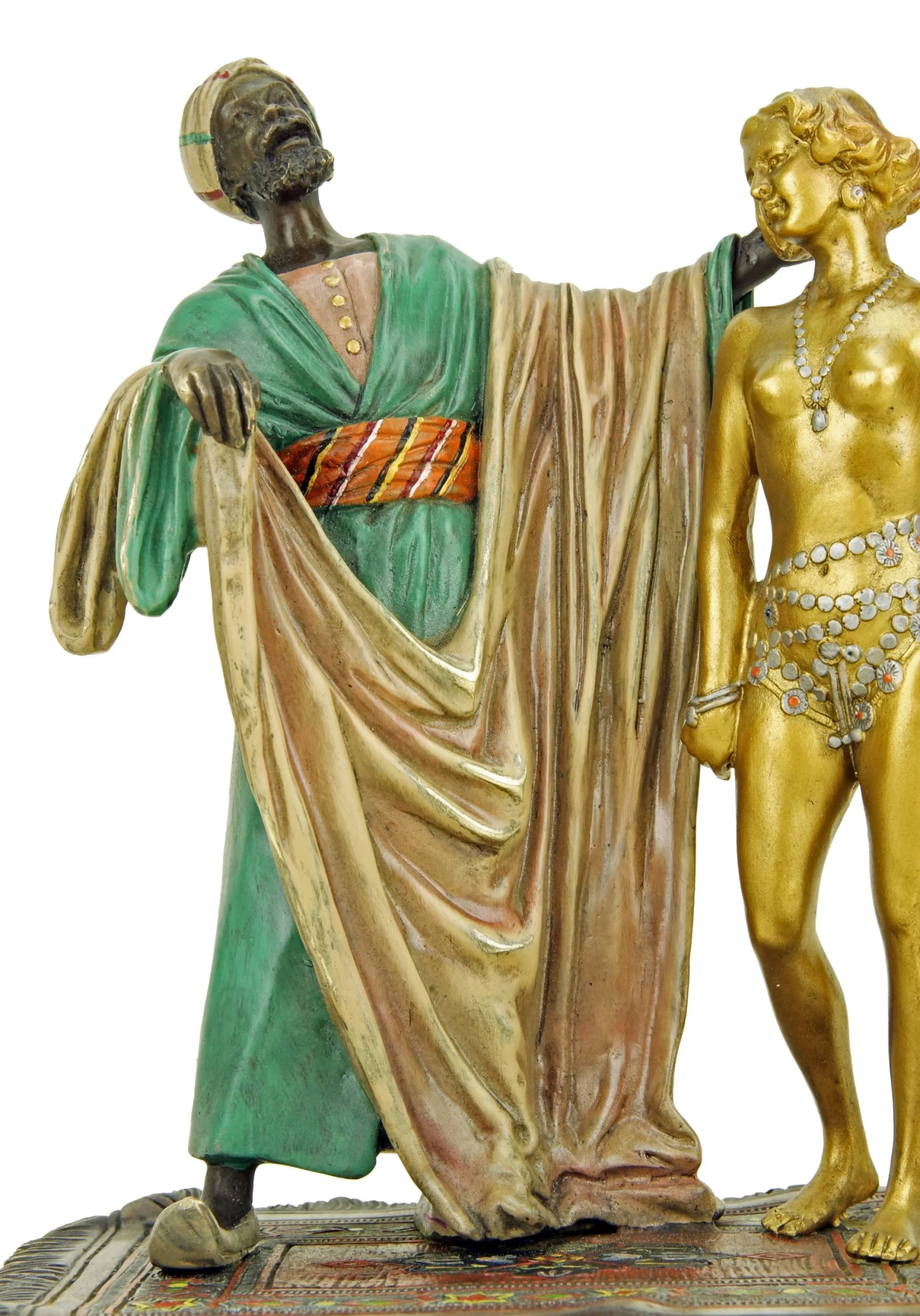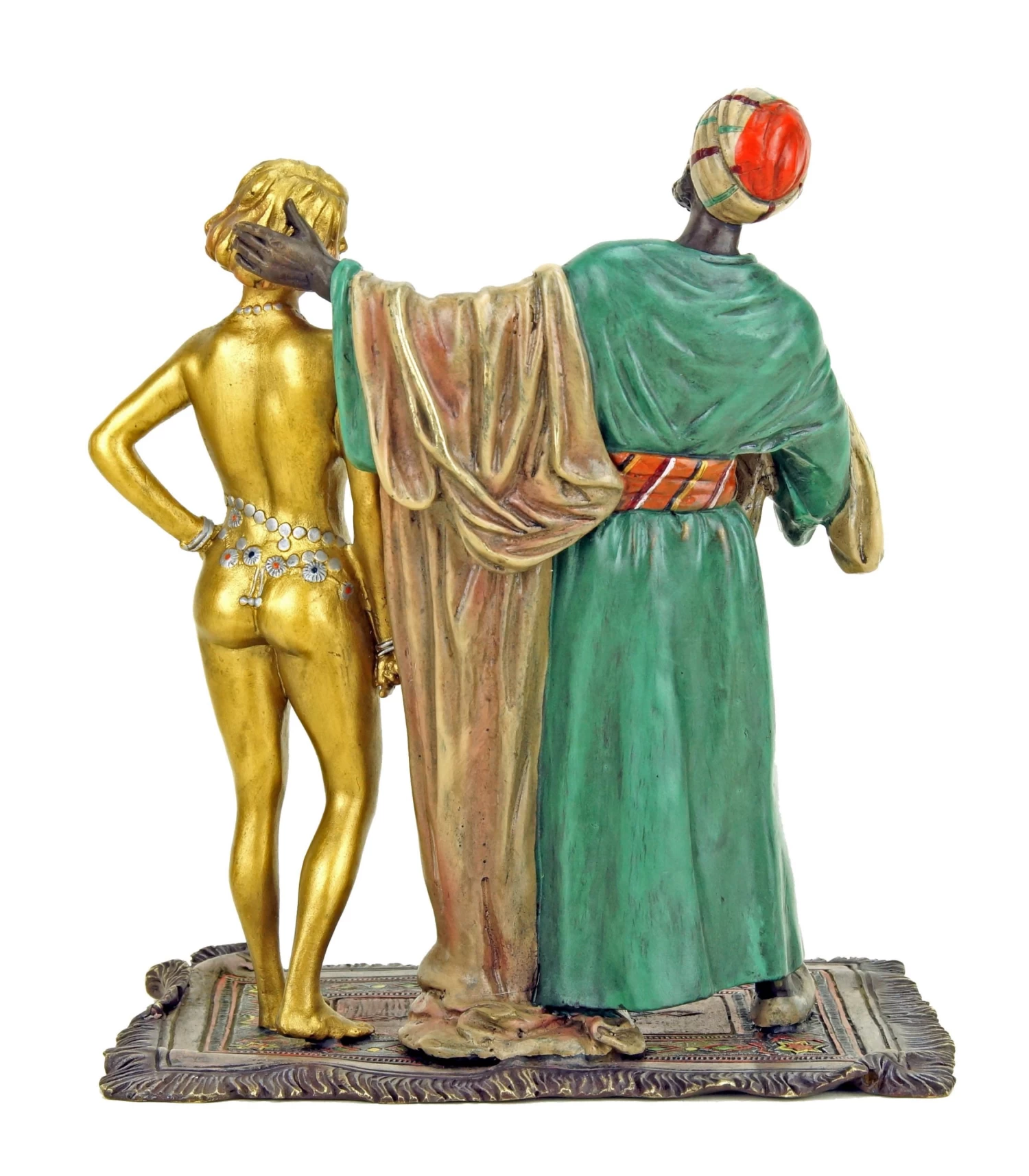 This Viennese carpet bronze tells the tale of a slave trader in the distant Orient. This intricately crafted bronze figurine is characterised by its detailed depiction that is most apparent in the area of the surface design and the hand-painted details. Endowed with the Bergmann stamp, this carpet bronze presents a classic motif of the Vienna bronze period — a snapshot of the Far Eastern culture of bygone times. In this instance, a slave trader in long flowing robes advertises his wares. In this case, his ware is a young and naked lady that is only clad in a few jewellery pieces and is up for sale. Moreover, the erotic nude sculpture is accentuated by its striking colours, particularly when it comes to the beautiful slave that is almost completely covered in gold.