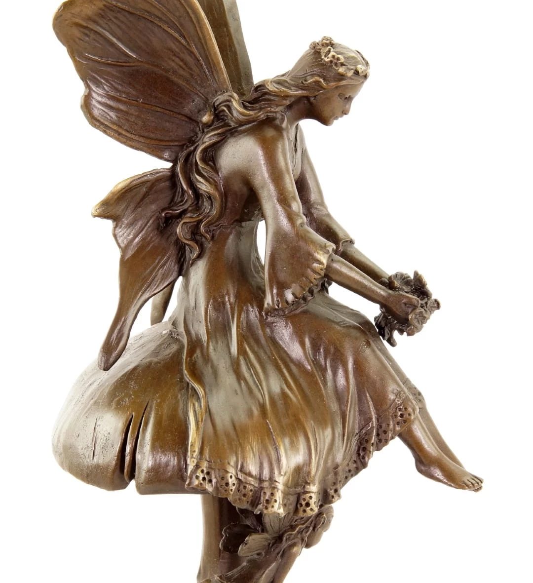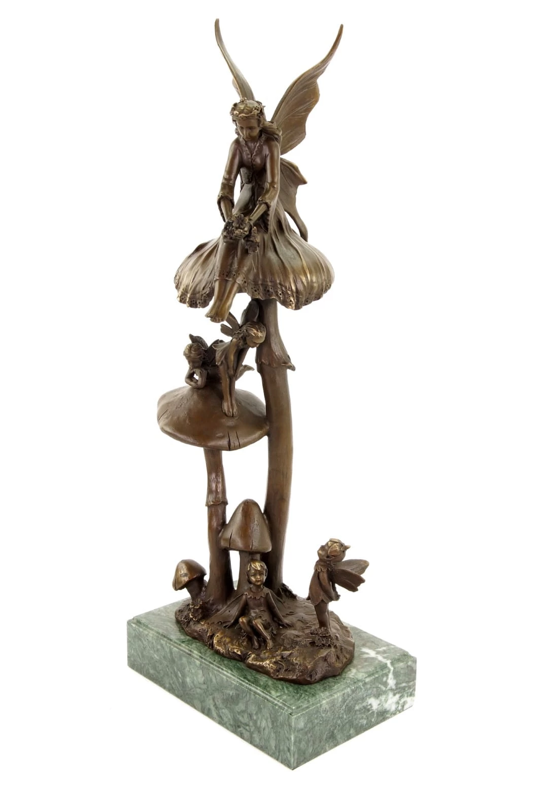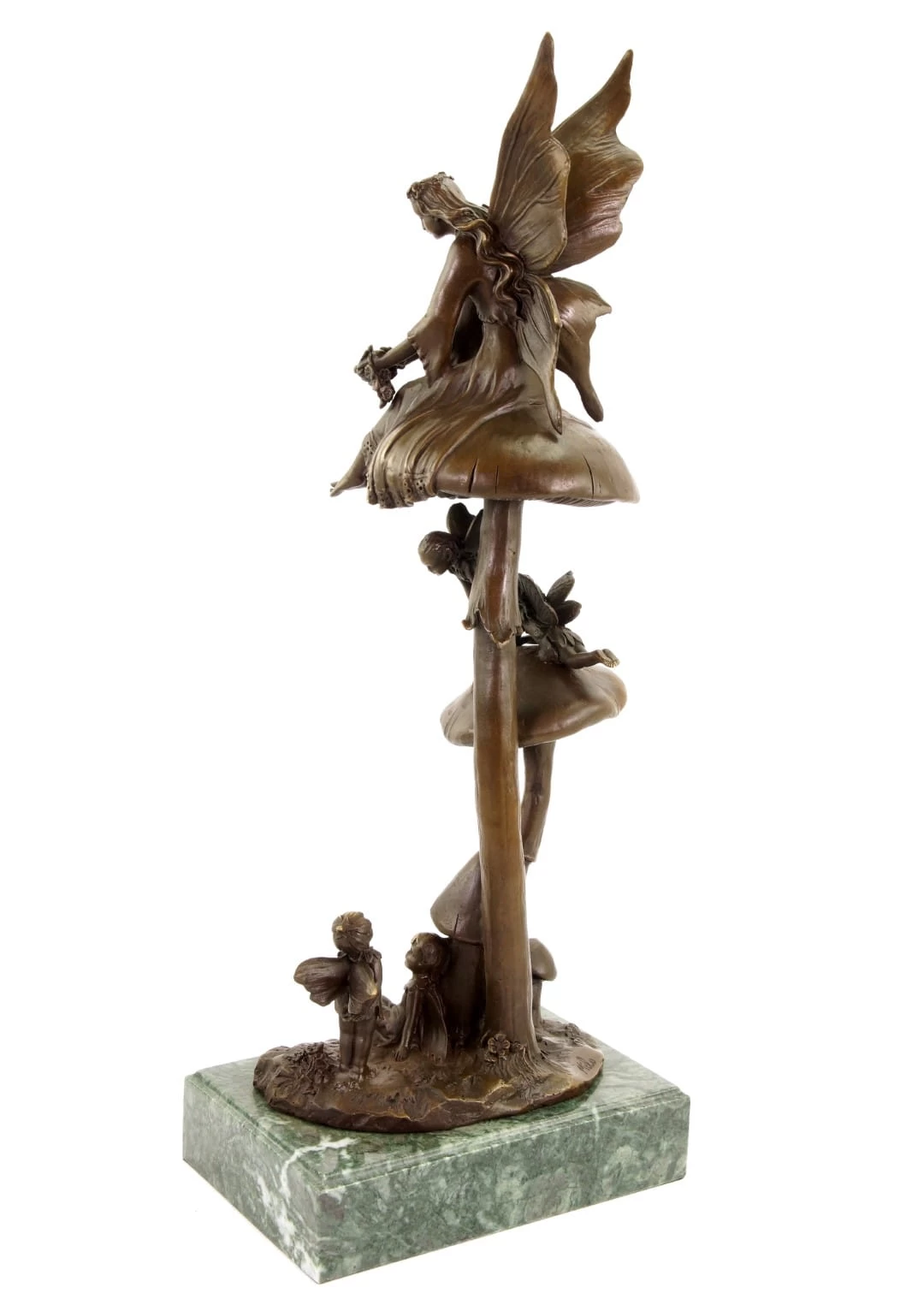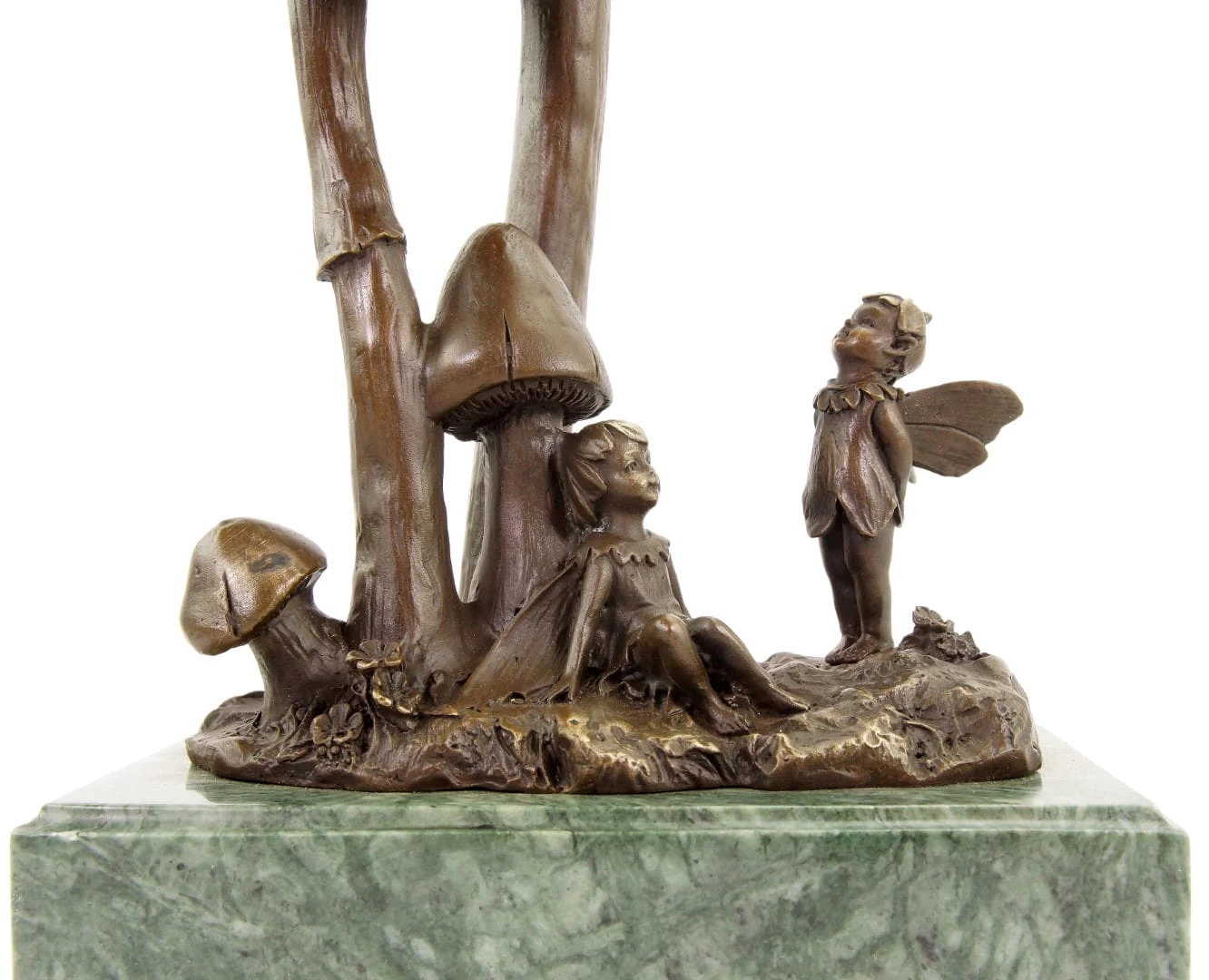 This decorative bronze forest scene carries you off to the fantastical world of the forest elves. The interlinked group of figurines has many impressive individual components, which in their sum depict a spectacular Art Nouveau object. Starting with the pretty, delicately sculpted elf who sits enthroned on the highest mushroom and thus constitutes the focal point of the image, the motif gradates little by little and reveals numerous details in the process. That way, two additional little elves sit on a long-stemmed mushroom and communicate with two winged elf boys who lounge on the bronze forest floor. The elven statue is placed on a green marble base that visually emphasises the natural motif. Occasional polishings of the bronze material round off this signed Art Nouveau sculpture.