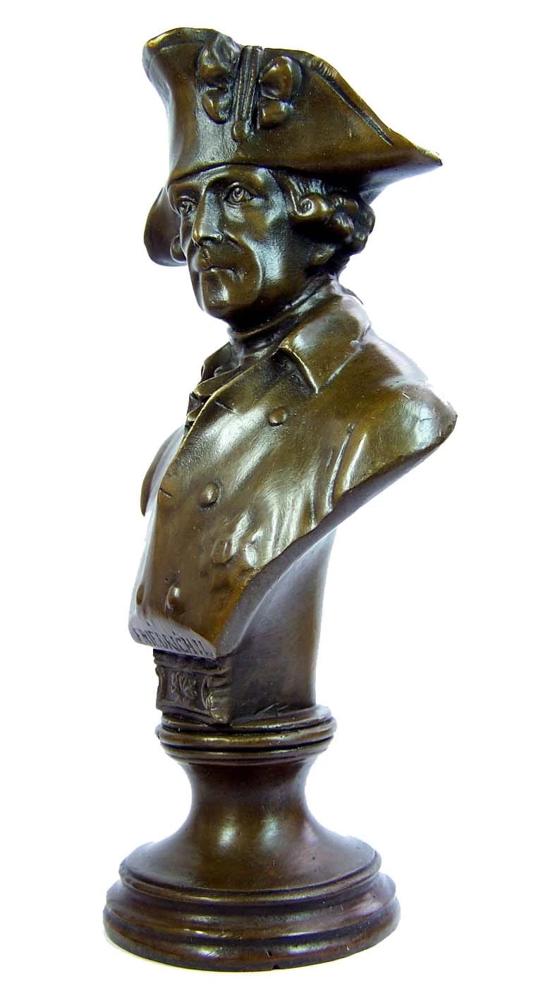 This historical German Military bronze bust shows the Prussian King Frederick II., named Frederick the Great. He looks straight to the front and wears a small hat. The bust is set on a special shaped bronze plinth and has a signature by its sculptor. The bronze figure is made of 100% bronze and will be an eye catcher in each collection.