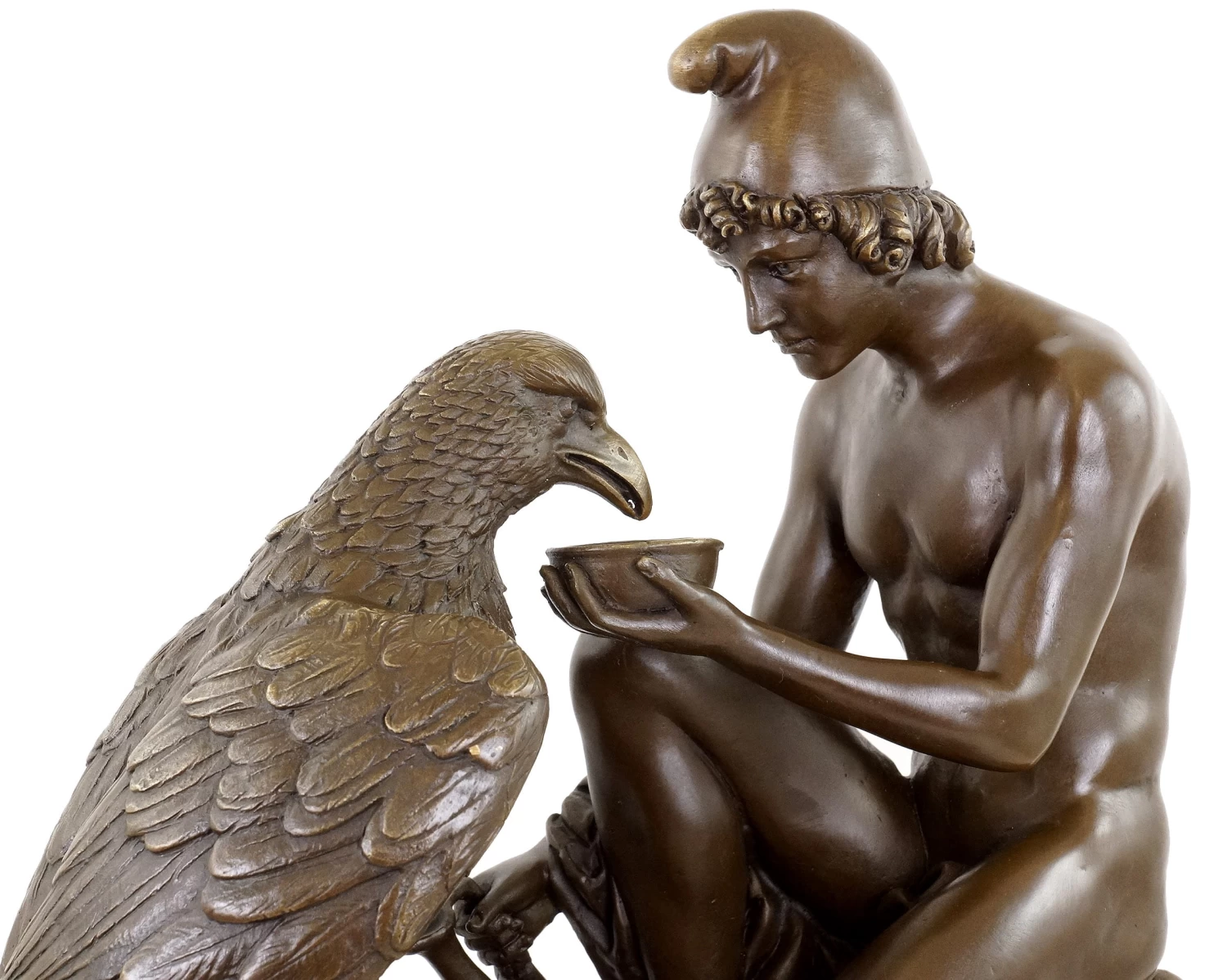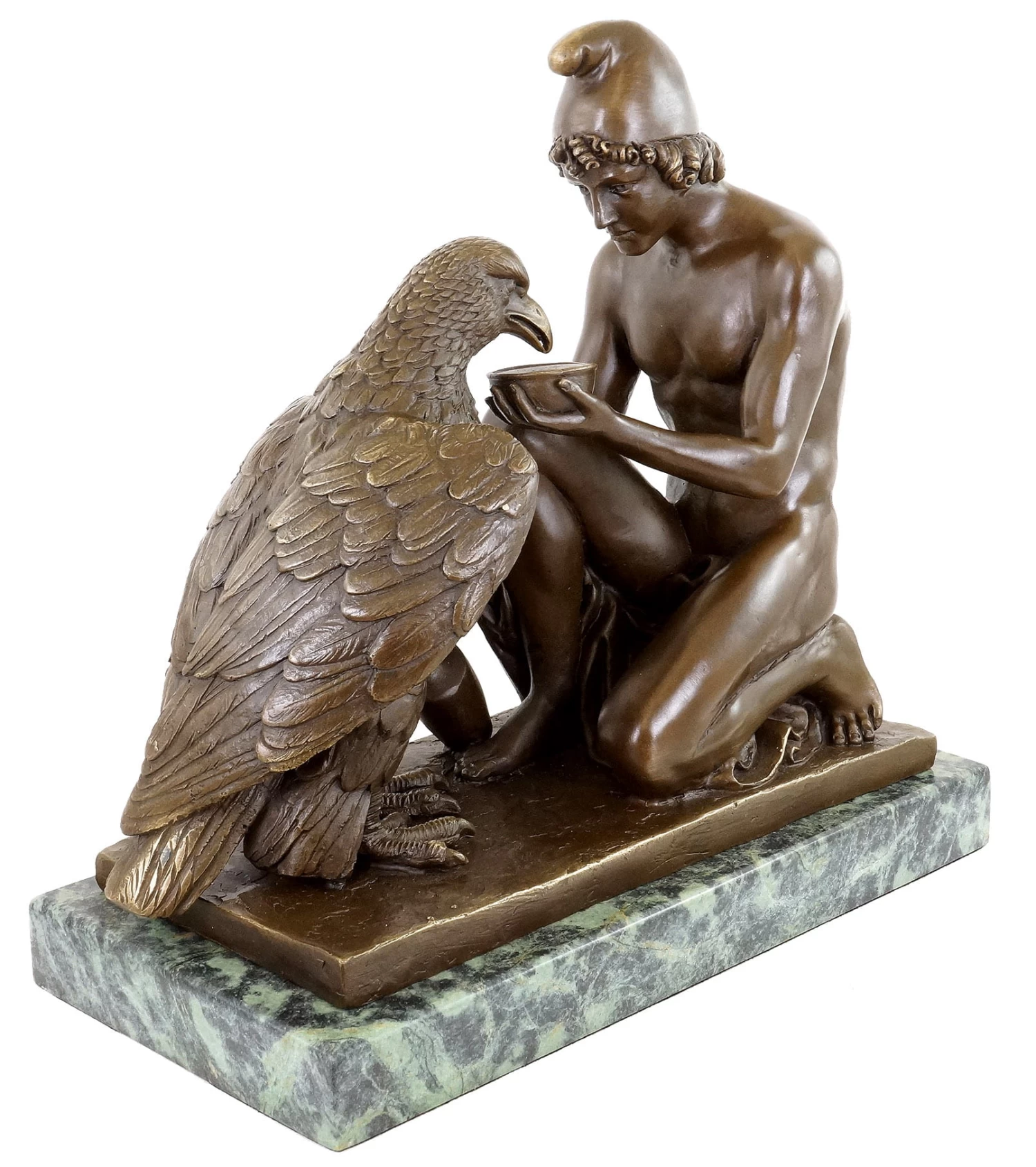 This Greek mythology statue depicts the homoerotic relationship between Zeus and Ganymede. Ganymede is the son of Trojan king Tros and was the most beautiful of all mortals in mythology. Zeus loved him and appeared to him as an eagle. Ganymede watered the trusting eagle. Zeus took the chance and abducted the youth to Mount Olympus. There, he was supposed to work as a servant indefinitely. Full of love, Zeus lifted Ganymede up to the stars, where he can still be seen as the sign of Aquarius. This Greek statue shows the moment of the first encounter between Ganymede and Zeus. This work is limited to 20 pieces.