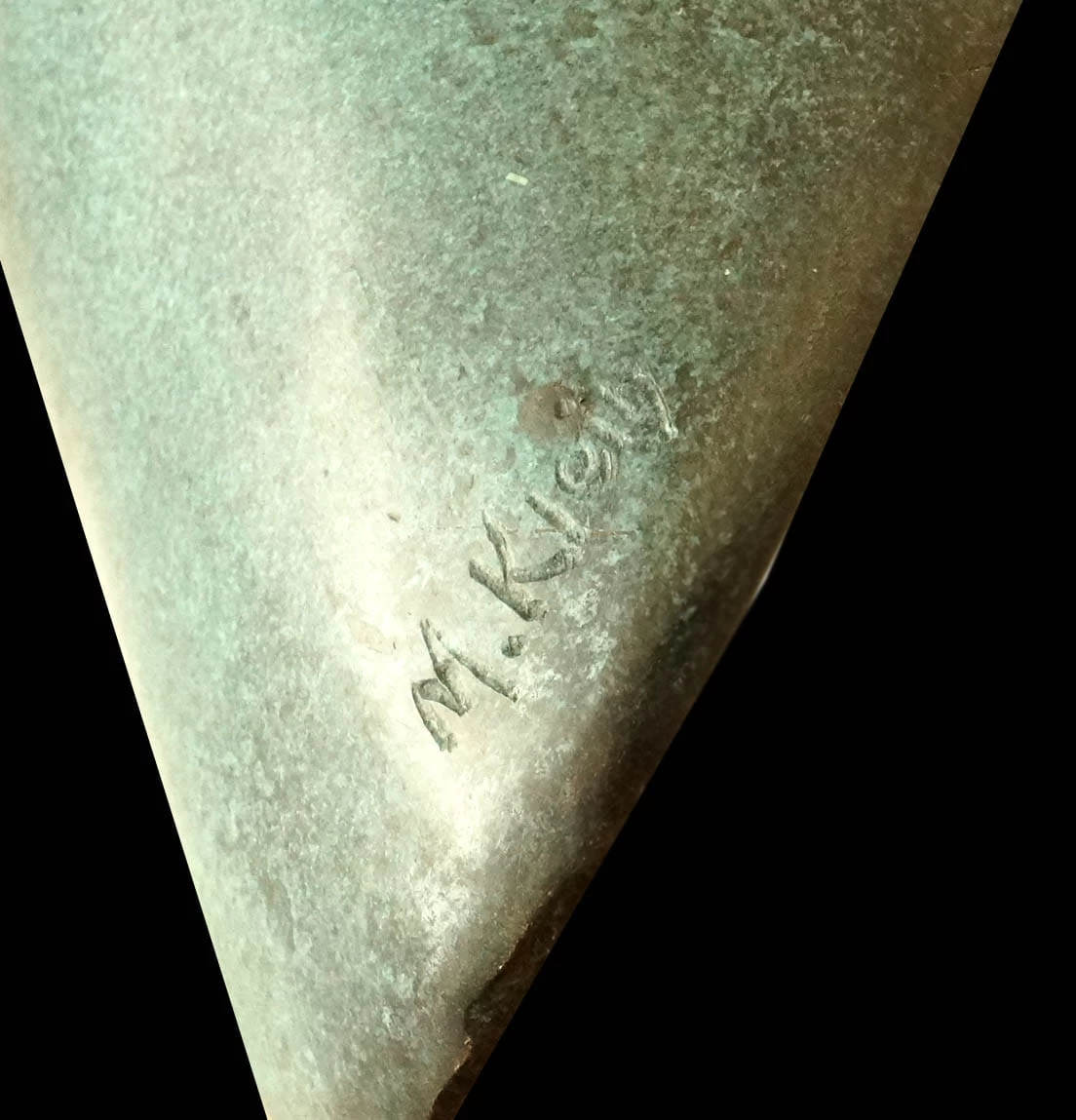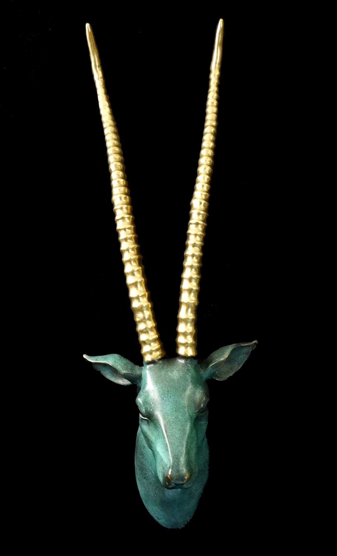 This patinated bronze figure is the head of a gazelle. The sculpture was designed by the German artist Martin Klein. It impresses with its green patina and the golden horns extending dynamically into the sky. For animal lovers and art lovers, this sculpture is a fine gift. Both in indoor and outdoor areas the gazelle cuts a fine figure. Gazelles are slim, long-legged animals. The sculpture on the left is signed with “M. Klein”.