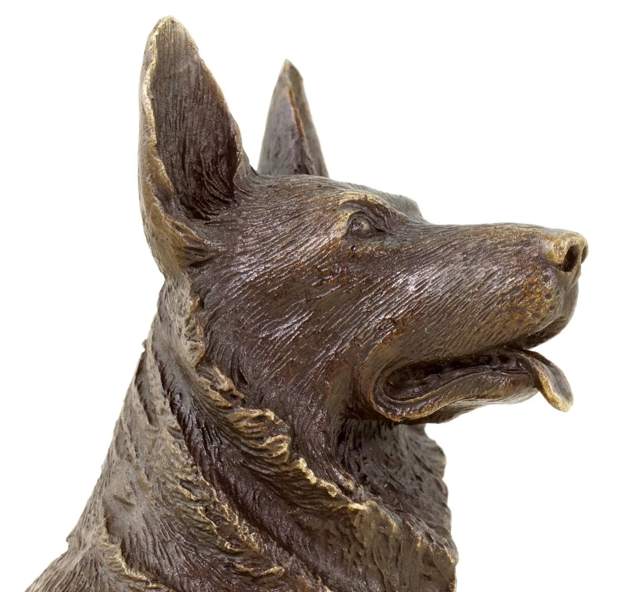 With this decorative bronze figurine, the artist Milo created a realistic bronze depiction of a German shepherd. The beautiful bronze miniature is characterised by a very detailed design, which almost brings the shepherd to life. Starting from the artistic replication of the fur texture to the naturally formed physiognomy of the dog, this bronze depiction of the German shepherd culminates in the elaboration of the finely crafted head. The dog figurine is partly equipped with polishings that colourfully refine the freestanding figurine. The dog statue bears the signature of the artist and is made of 100% bronze.