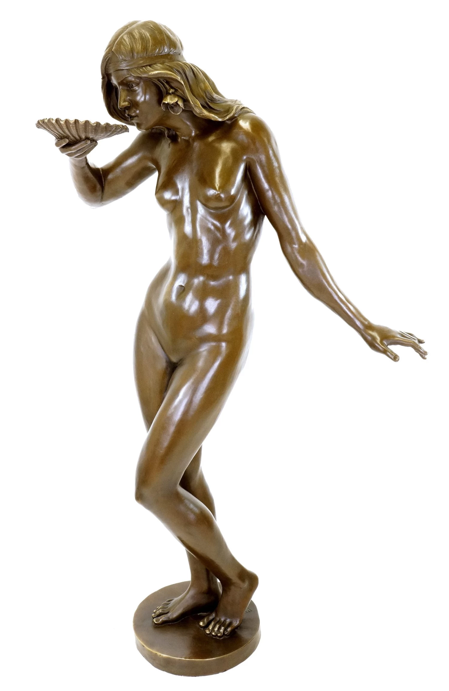 The girl drinking from a large shell was created by Edward McCartan in 1915. This Art Nouveau bronze captivates with its dichotomy. It shows a beautiful girl with youthful facial features. In her hair, she wears flowers and a hair band, which lend the depiction a playful aura. Carefully, the young woman drinks from a large shell and inquisitively looks at the observer. This playful girlishness is in stark contrast to the erotic pose and the unveiled nakedness of the Art Nouveau statue. With this erotic nude, the artist combined sensual eroticism with a youthful pureness. As a garden sculpture, this girl enriches your own personal green oasis. This work is limited to 20 pieces.